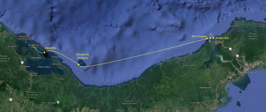 So… the immediate plan: after picking up a few packages in Bocastown (a mishmash of stuff we’ve ordered from the US) and topping off our provisions and fuel, we leave Bocas del Toro via the Zapatillas, head for Escudo de Veraguas, followed by the Rio Chagres, followed by a haul out at Shelter Bay Marina outside Colon for the shortest duration possible. After that, we have to play it by ear.