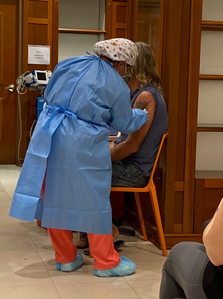 The vaccinations were indeed taking place. We simply needed to return to the line of chairs we had just walked by and await his return.