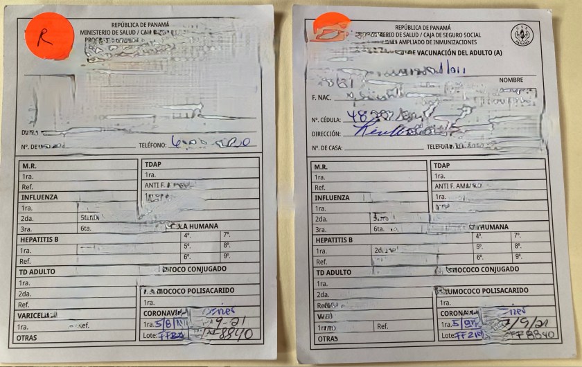 We handed her the official Panamanian vaccine cards we had received with our first Pfizer shots – printed card stock with handwritten entries for our first jab, which she casually looked at.
