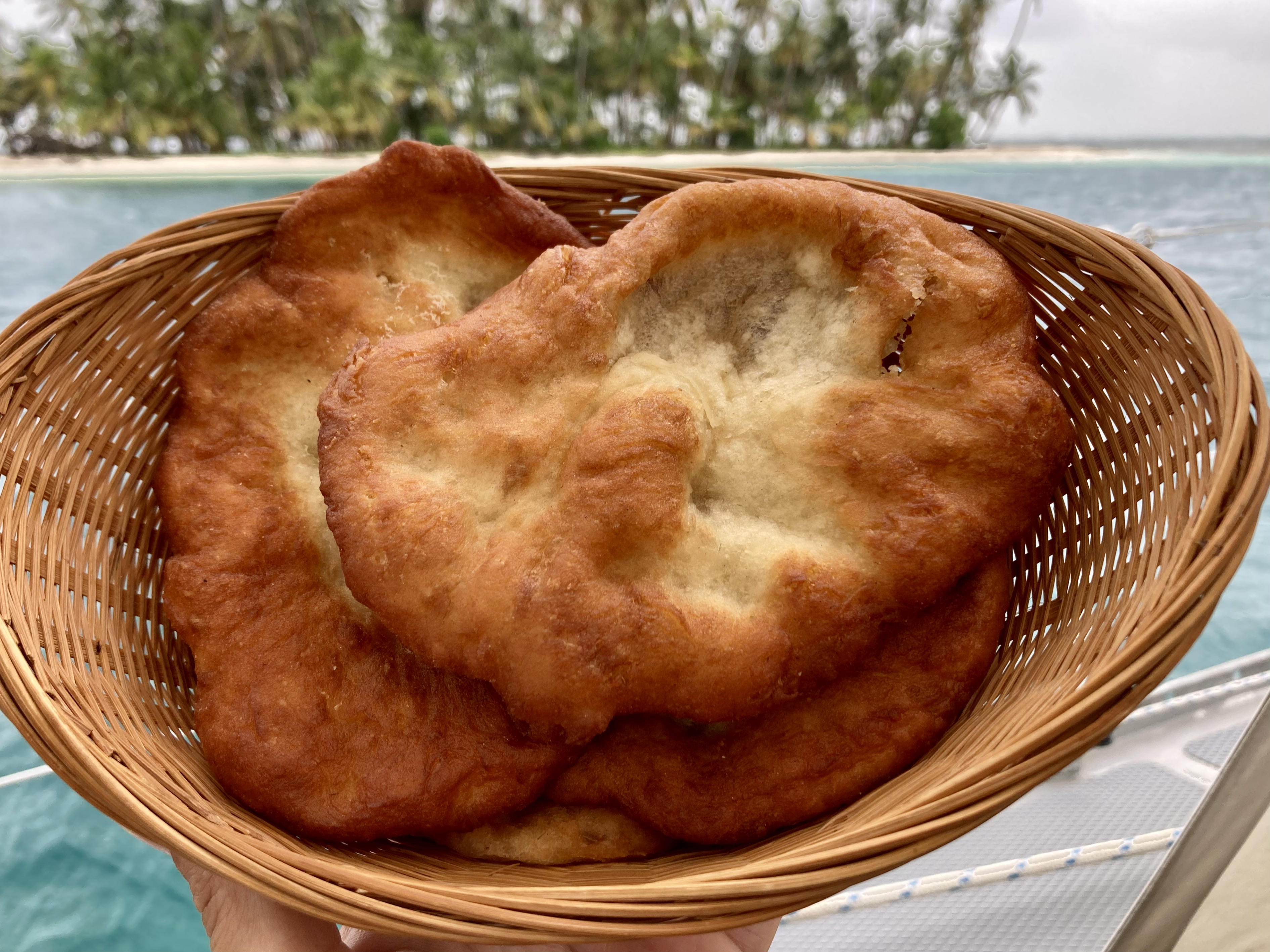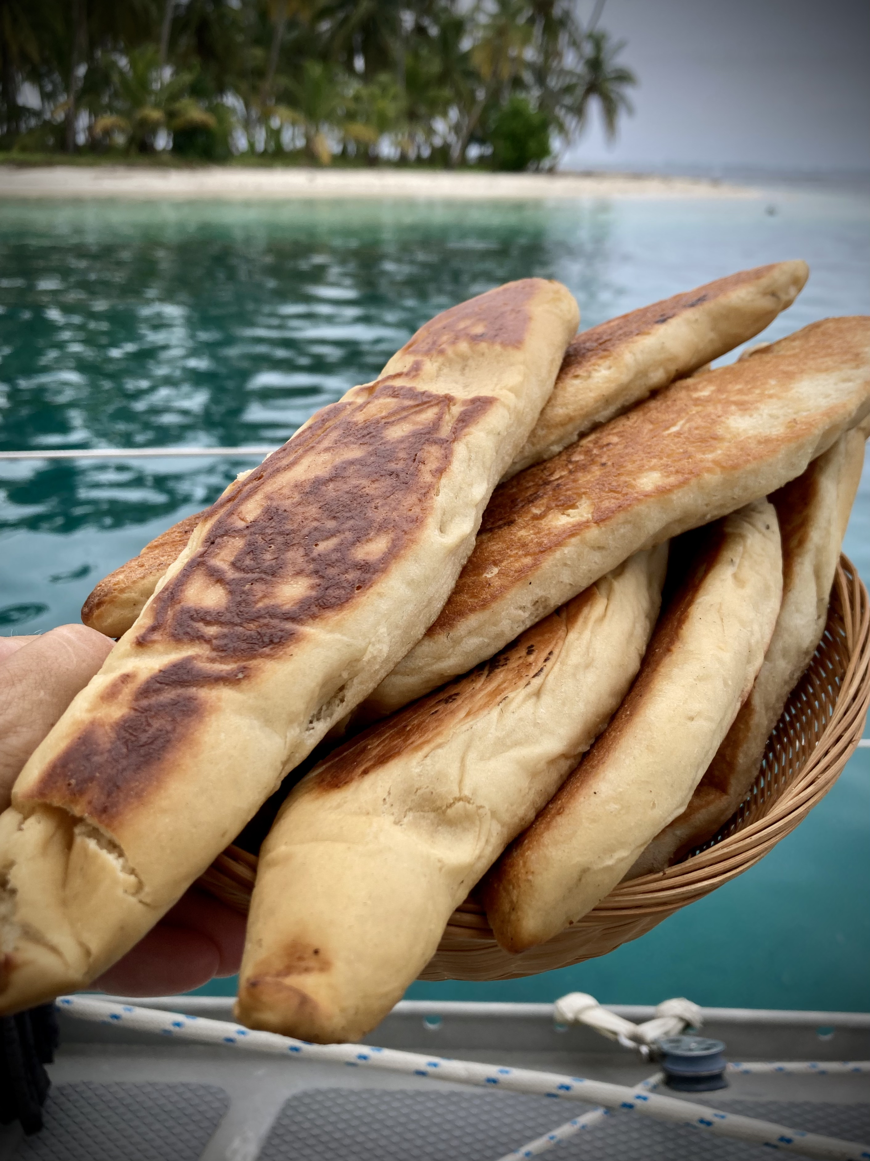 While visiting Guna Yala, we always looked forward to purchasing fresh bread. Some tasted quite like it came from a regular bakery; but some local Kuna bread traditionally baked on a fire is a truly unique flavor of Guna Yala. Undoubtedly the best Kuna bread we experienced was at Cocos Bandero. The fabulously pungent smokiness lingered in the cabin long after the bread was sealed up in ziplock bags. Both the smell and taste, were absolutely unmatched. A bit greasy; somewhere between a donut and roll. Eight of ’em…? Two bucks. Didn’t even need anything on them. But with a bit of precious Nutella spread on top… get the fuck outta here!