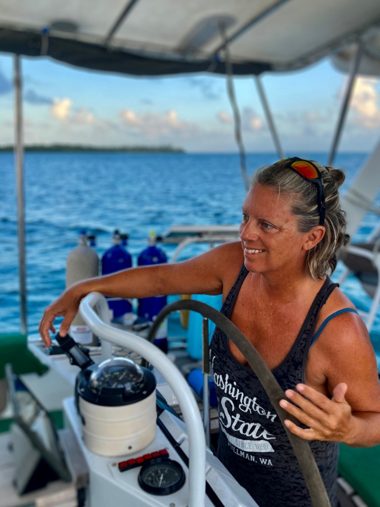 On the Navionics chart, the beige areas are land above water, or the nearest islands. Everything in green is charted as rock, reef, or shoaling or not charted at all and the darker blue is too shallow to go into. That leaves the white bits as deepest depths and lighter blue in between… and watch out for uncharted random rocks and reefs that can be interspersed in there as well.