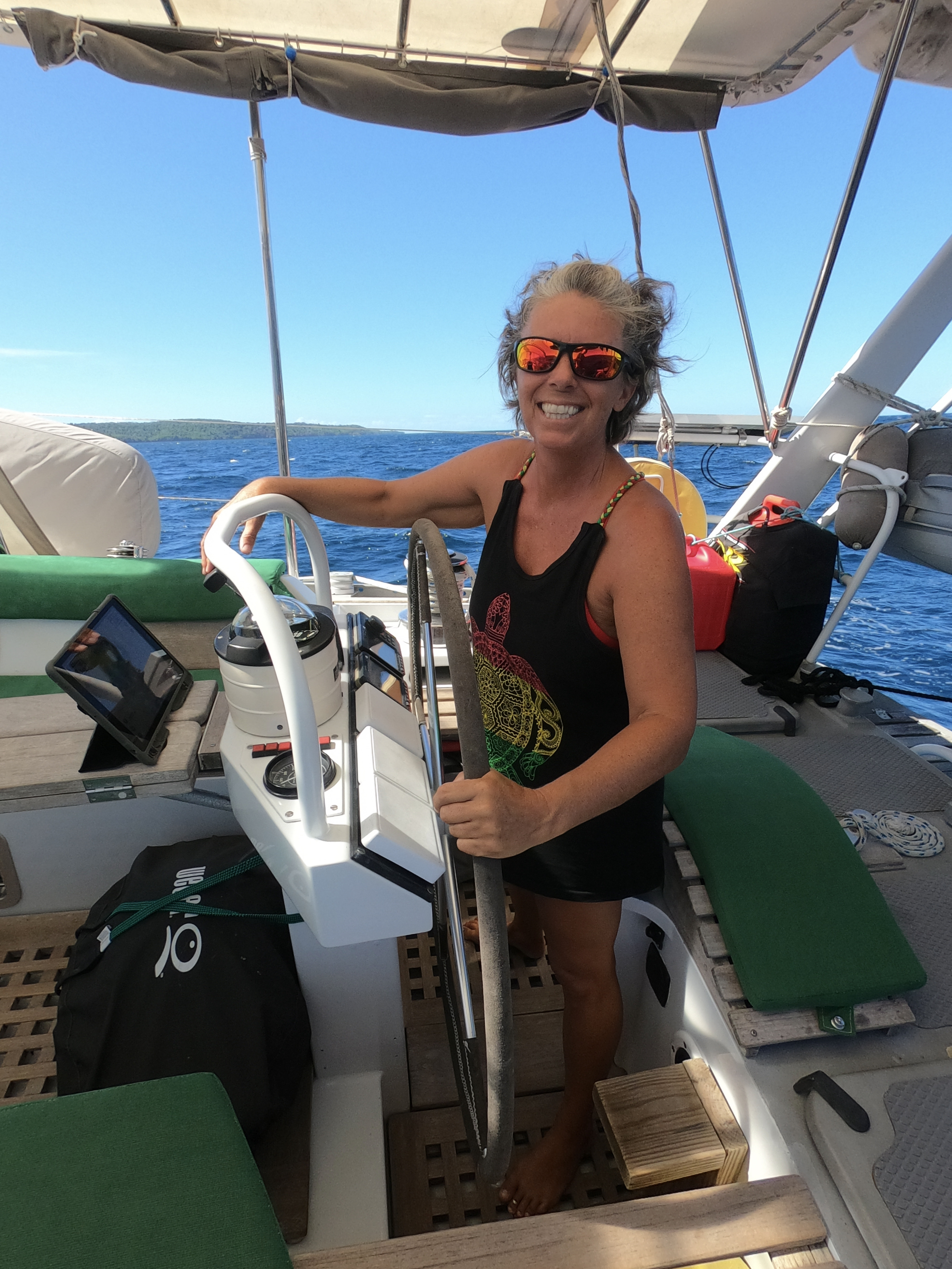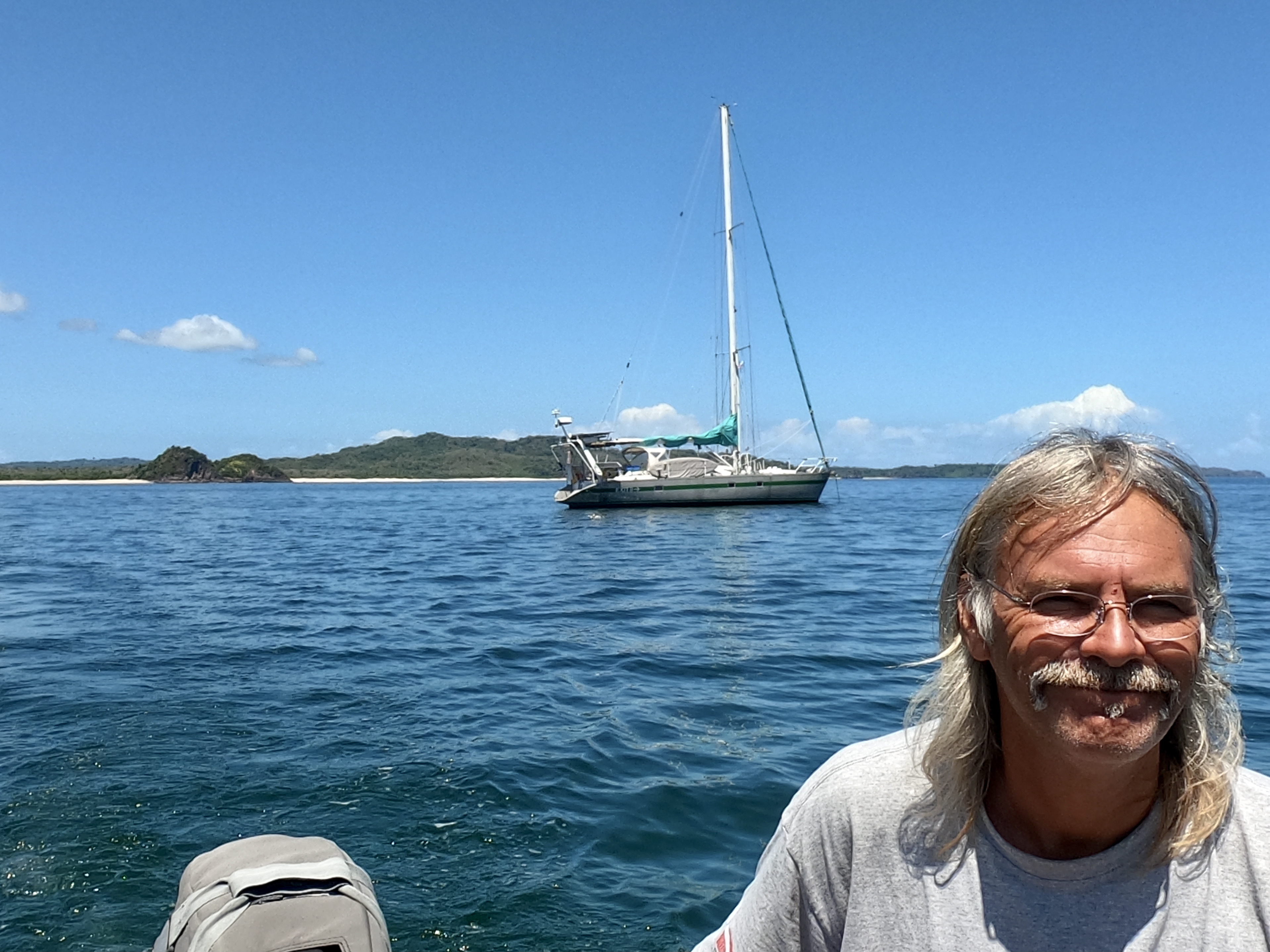 Shortly after we had set anchor, as Kris paddled away on her SUP, a catamaran sailed into the channel and anchored near us.