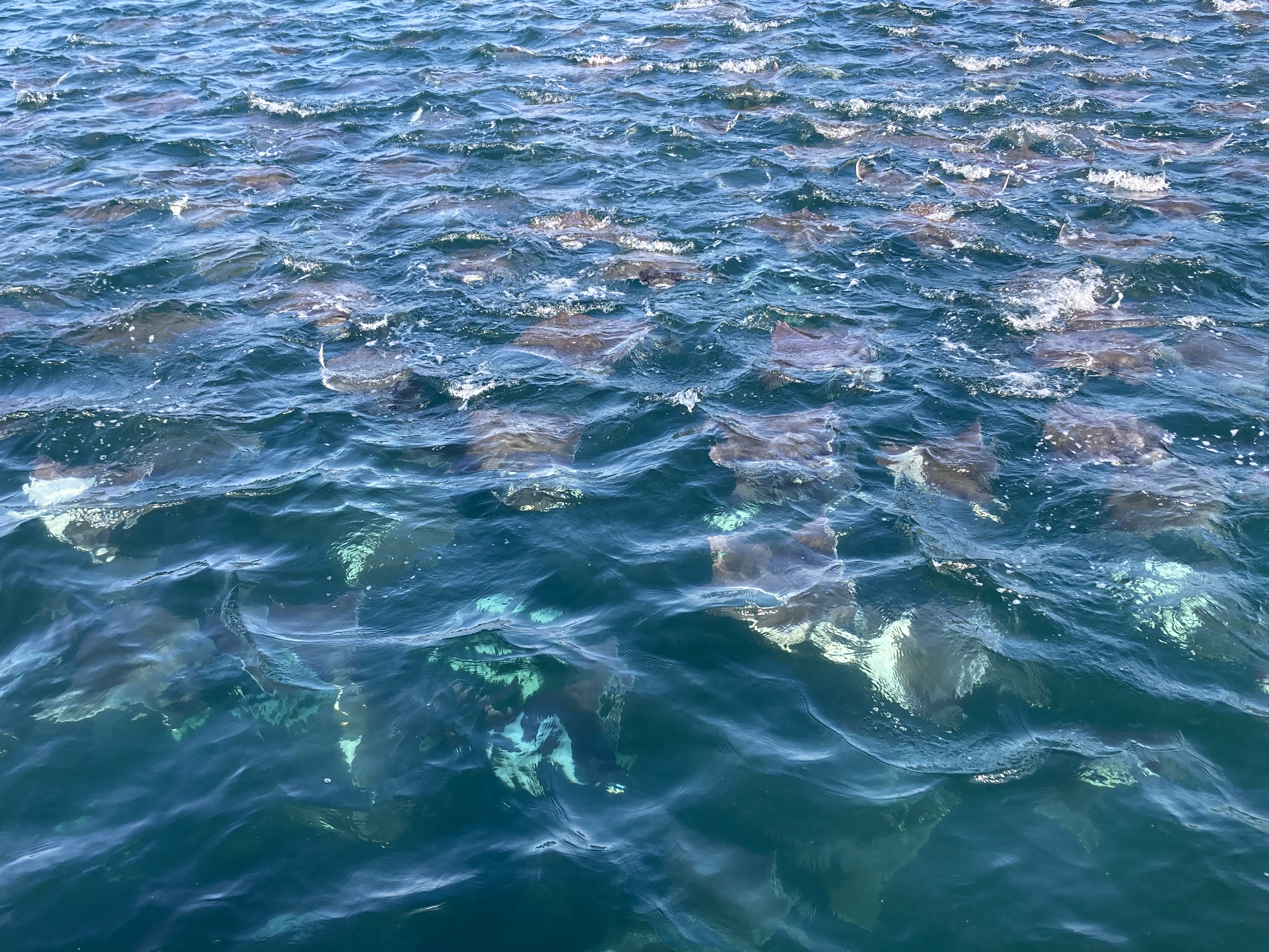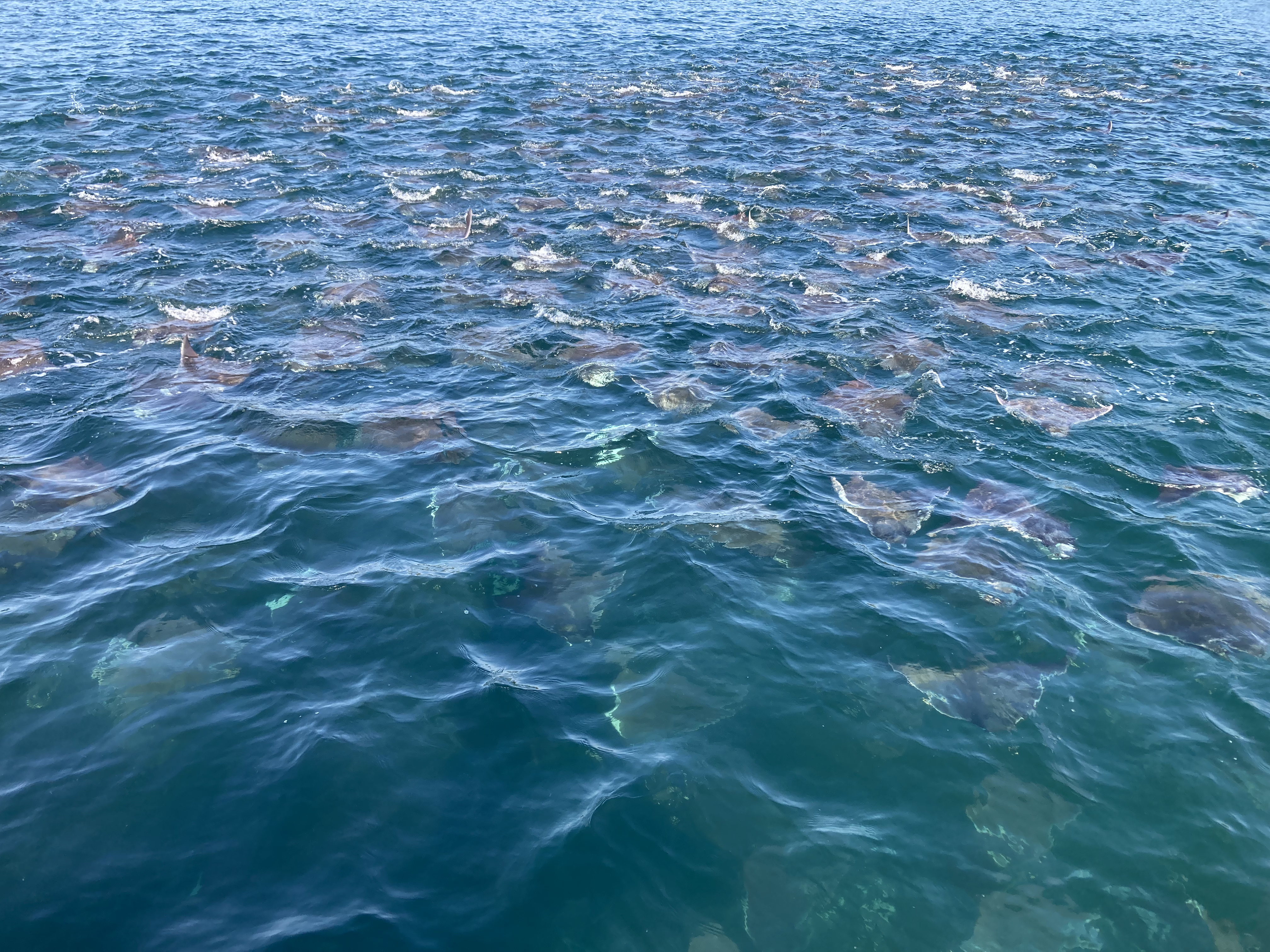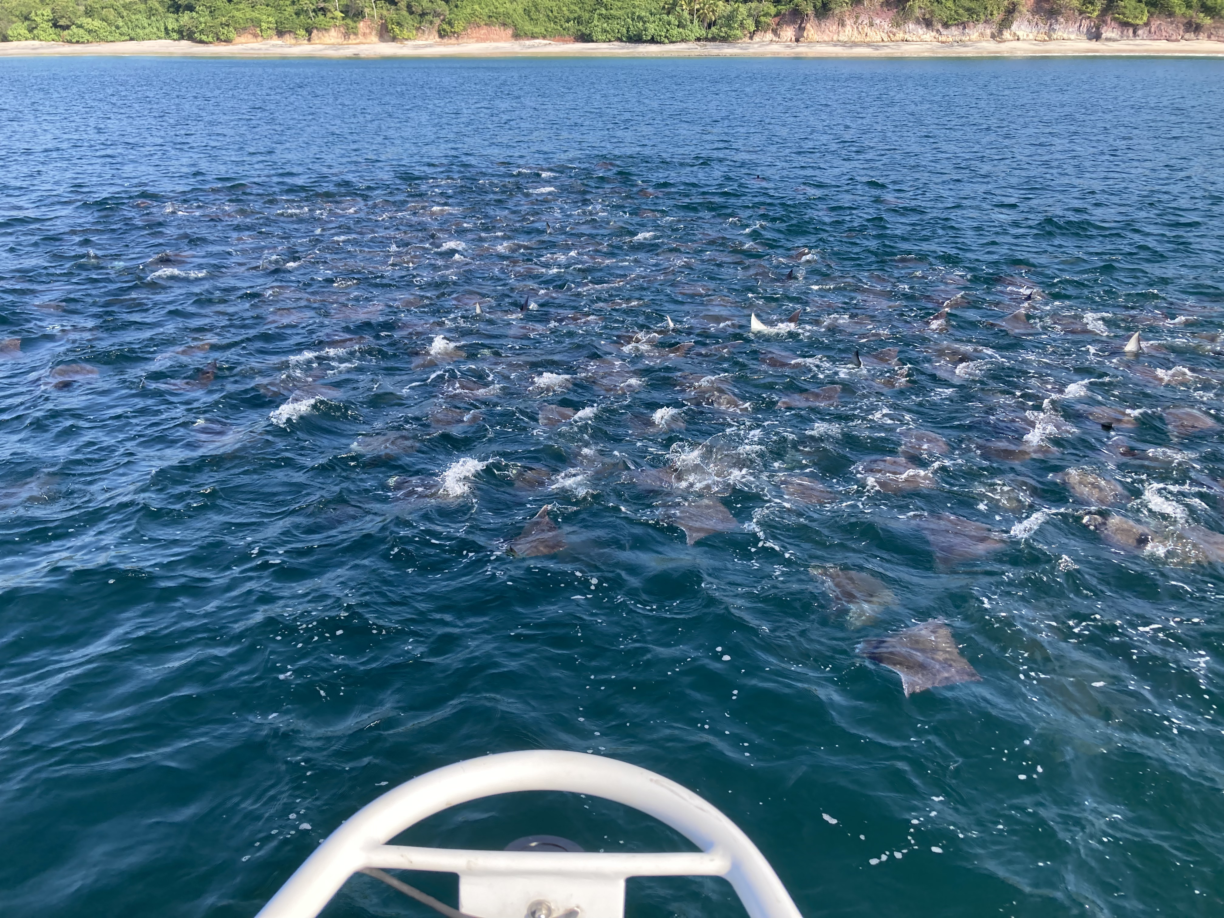 Over the course of the week, we went out on the water again and again, both in the dinghy and on the SUP. The show never stopped. At times during the changing tides, traffic would seem to slow down, and then another group of rays would surface somewhere else in the bay. Fortunately, one of the busier times seemed to be just before sunset, which provided a daily ritual of happy hours in the dinghy floating amongst schools of crazed devil rays and feeding whale sharks.