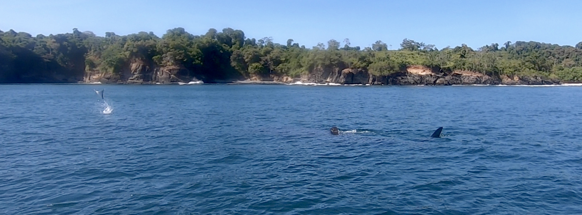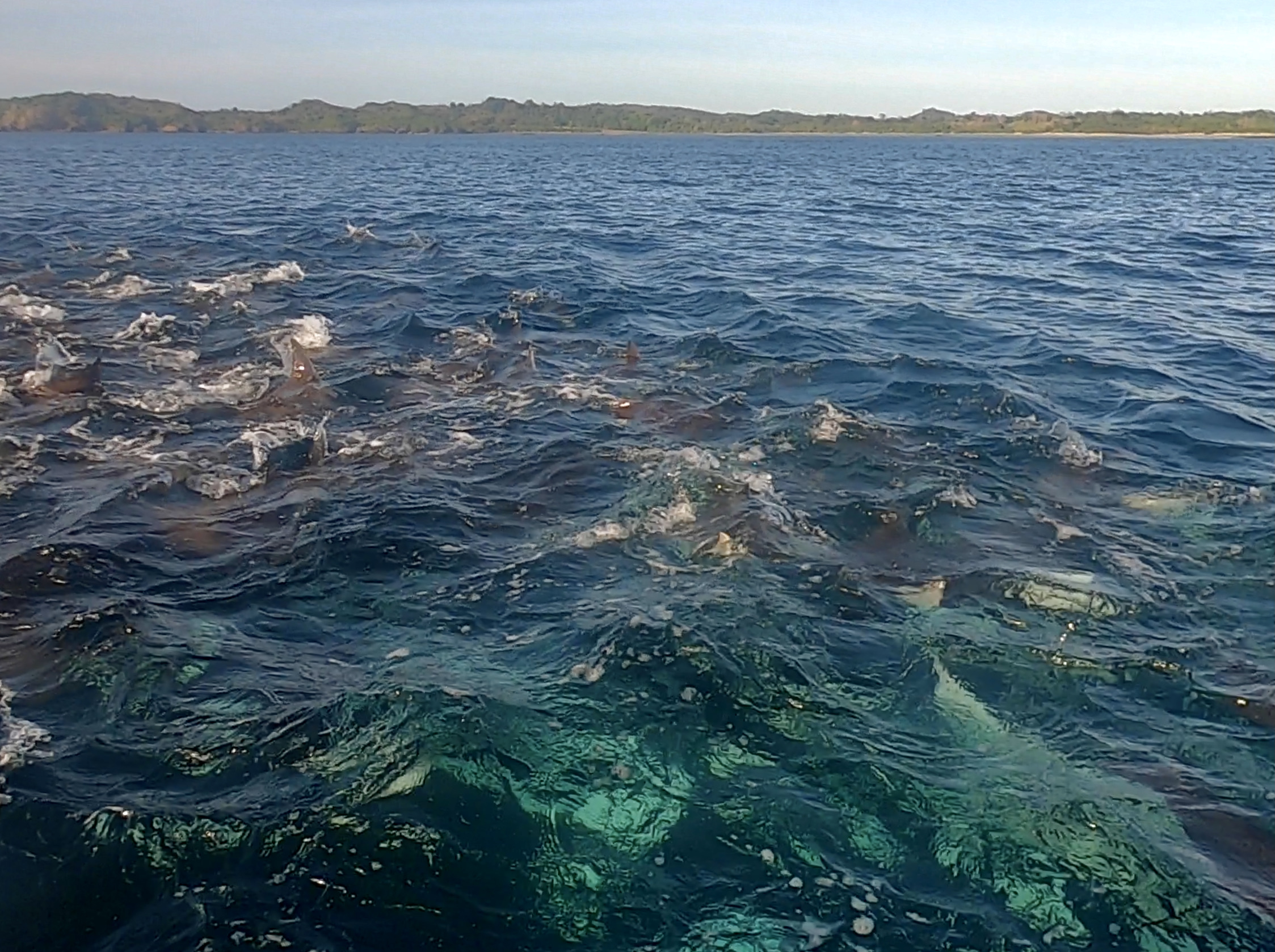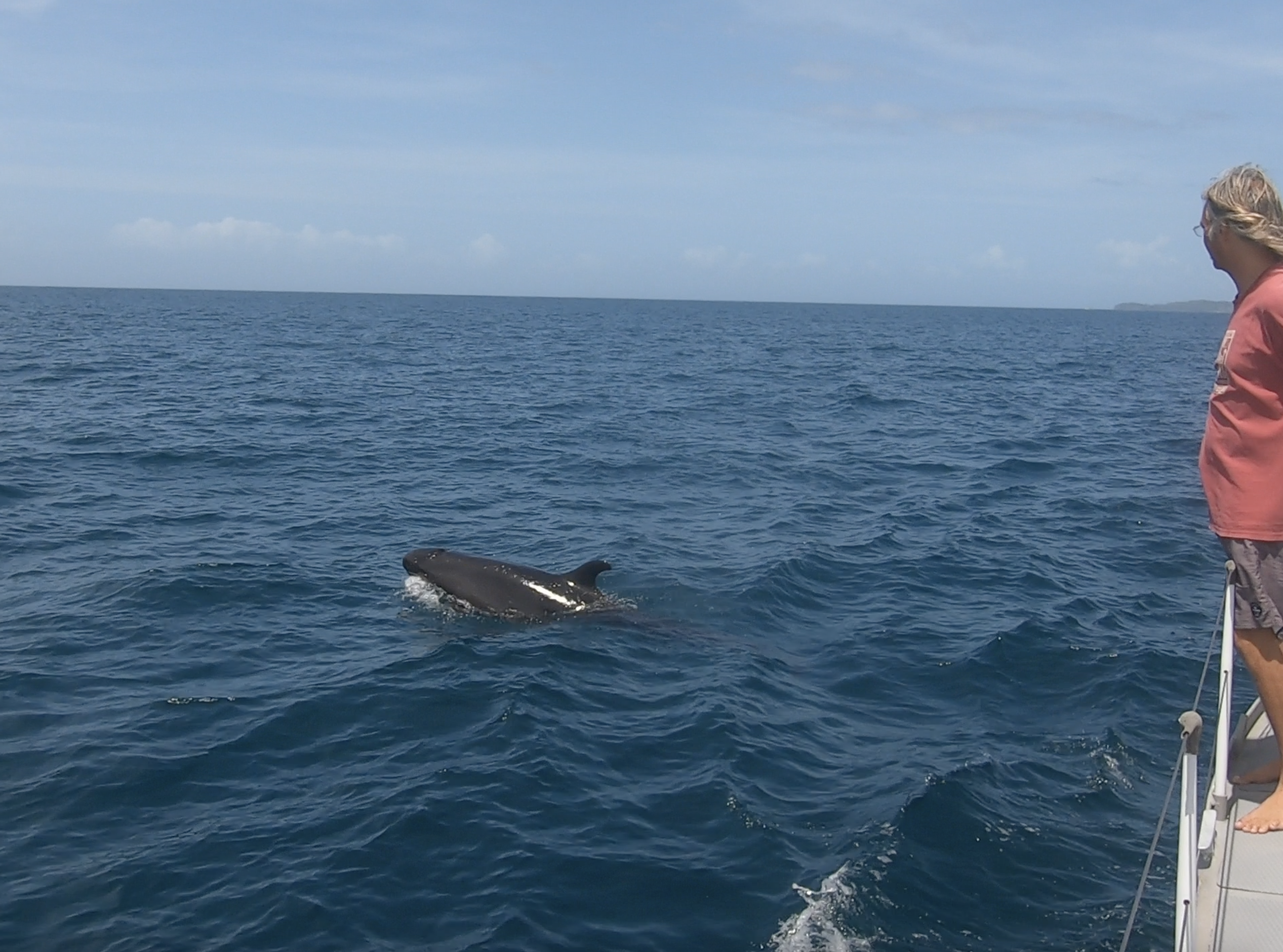 Between Isla Contadora and Isla San Jose, it appeared our mojo was still working. We were approached by a family of what we initially thought were pilot whales. There were more than a half dozen, both adults and calves. Over the course of nearly half an hour, we watched with fascination. Initially, they seemed very curious. A couple of the adults came right up to Exit and gave us a rather intimate inspection. Eventually, they continued about their business, allowing us the gift of a slightly more distant though still extraordinary encounter. Later, a bit of research lead us to the conclusion that we had not been visited by pilot whales, but rather either false killer whales or melon headed whales – a detail which surprised us but made the whole experience no less stunning.