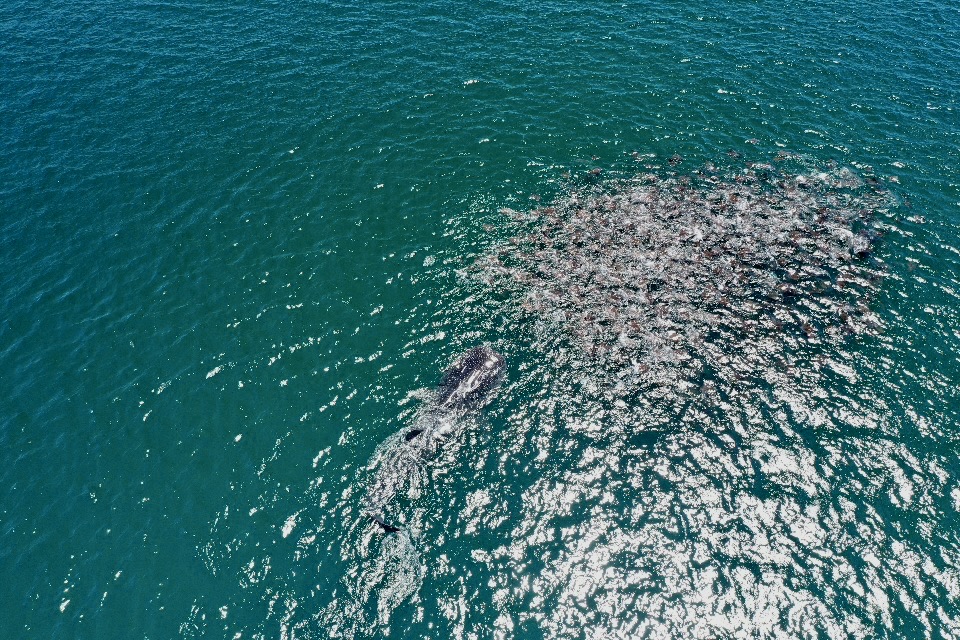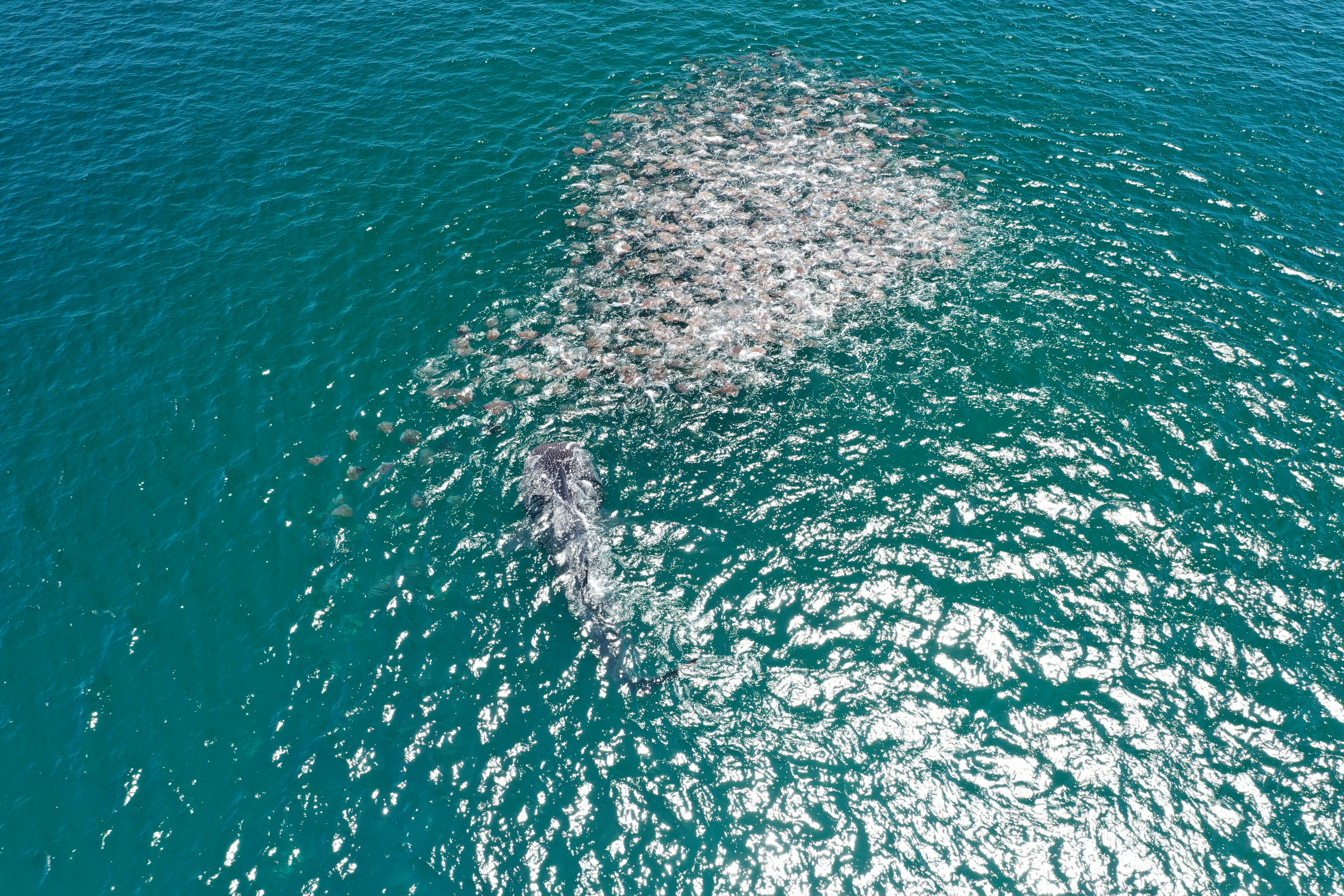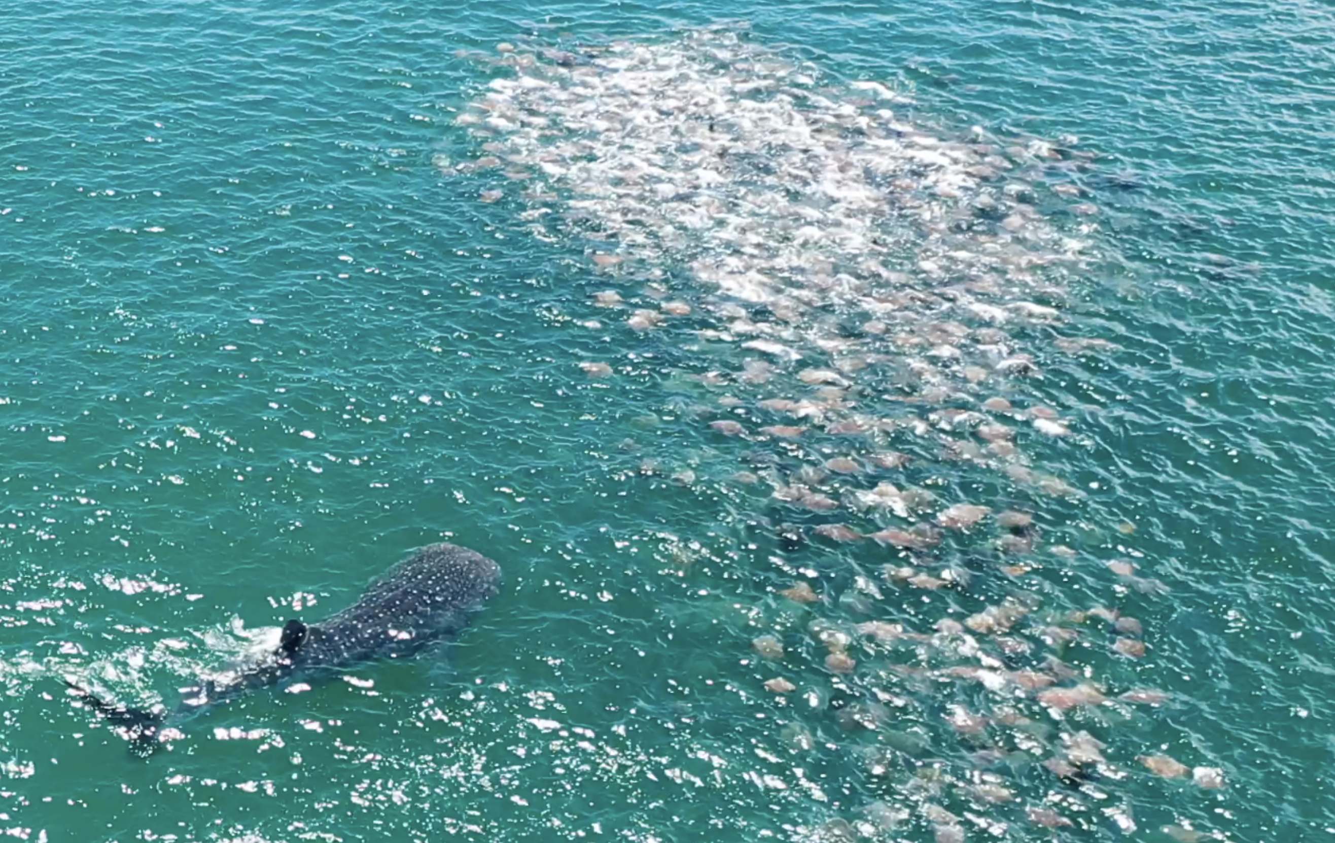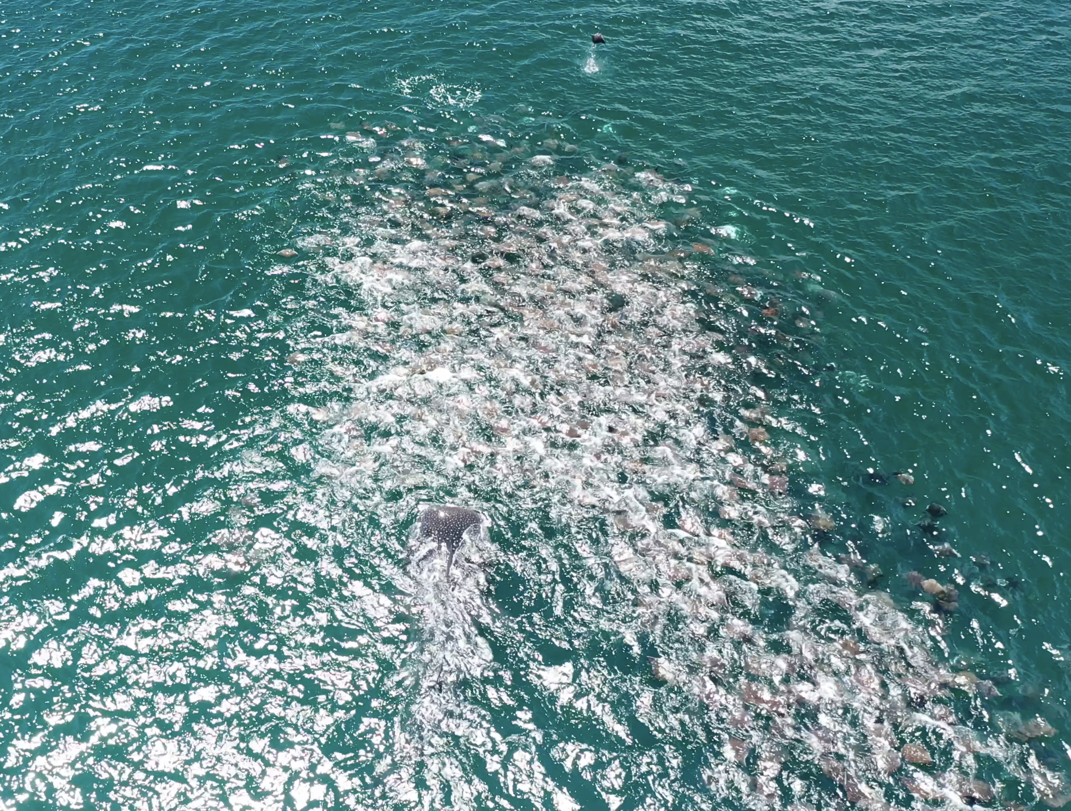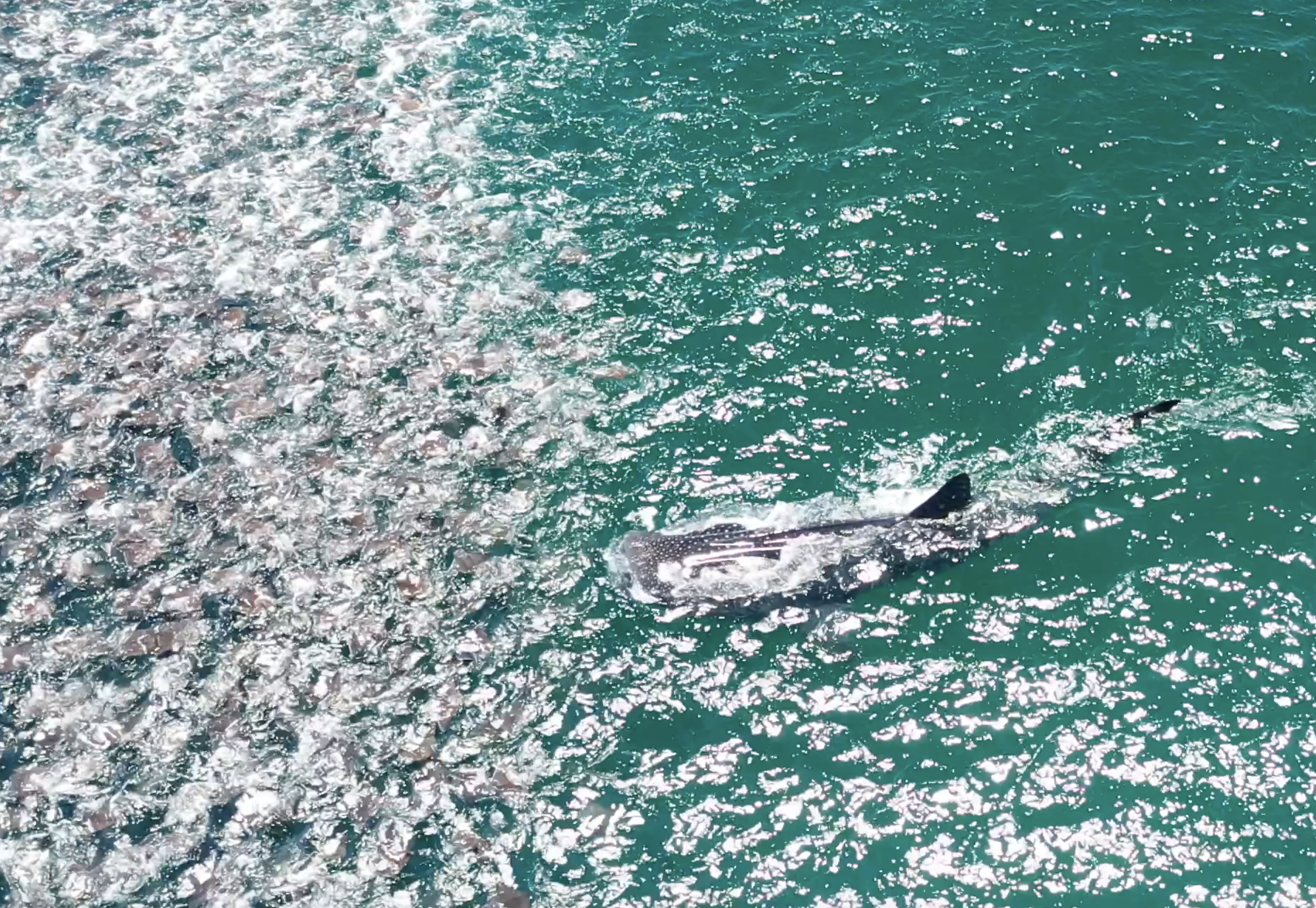 How about Space X-it drone footage of a whale shark swimming with a school of hundreds of leaping devil rays… BOOM!