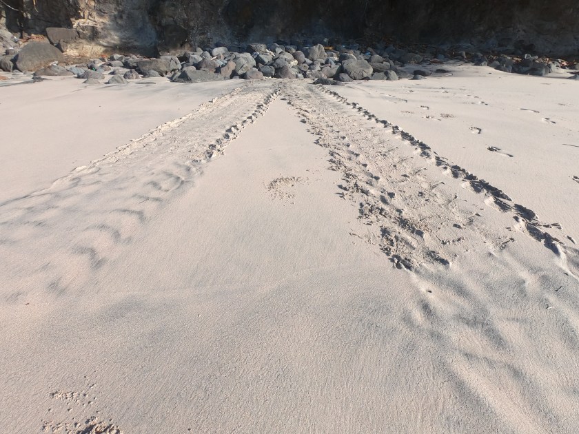 The morning after we arrived, Kris went for a paddle on her SUP. On the beach, she found fresh tracks from a turtle who had come ashore the previous night attempting to lay eggs.