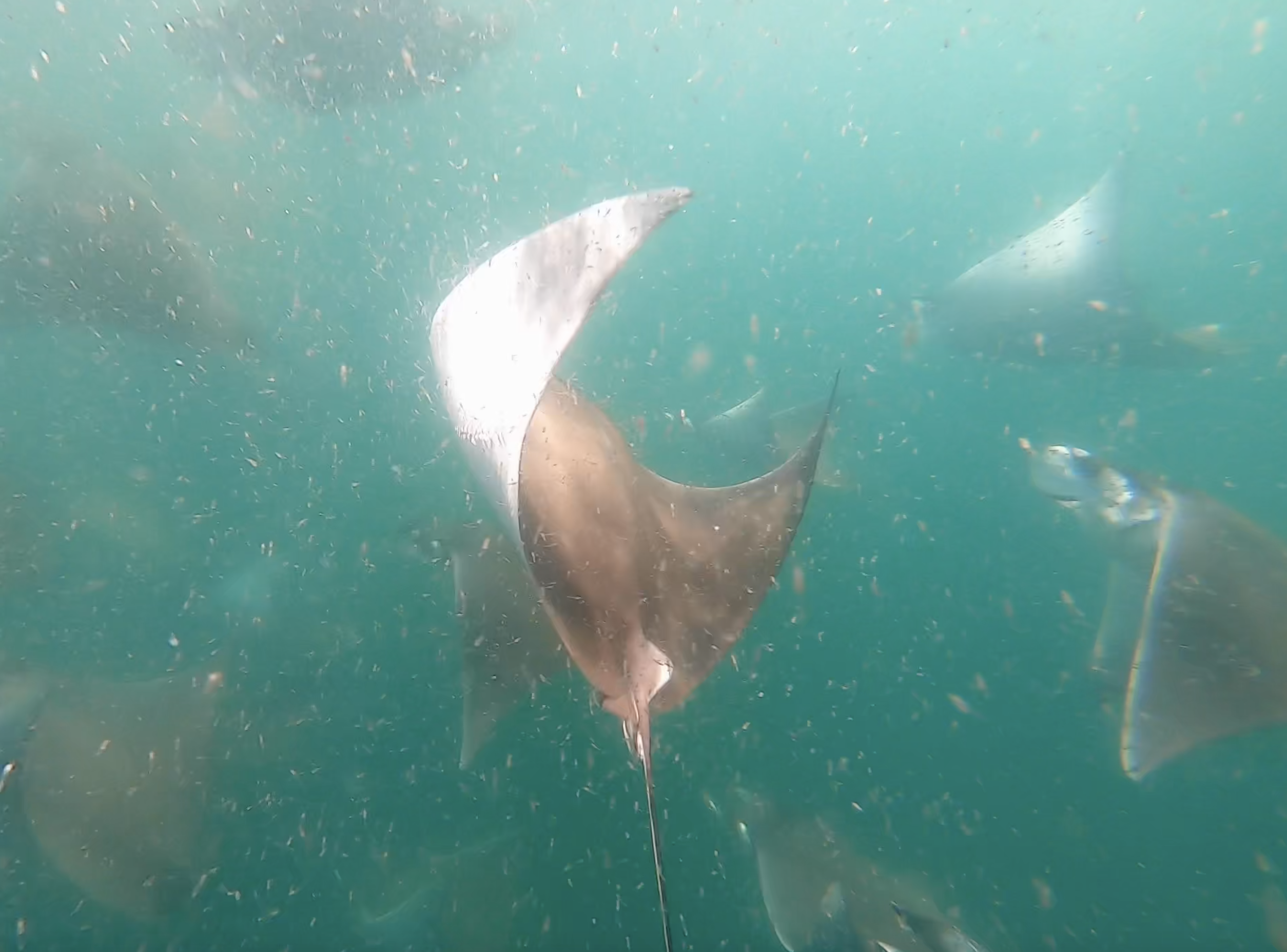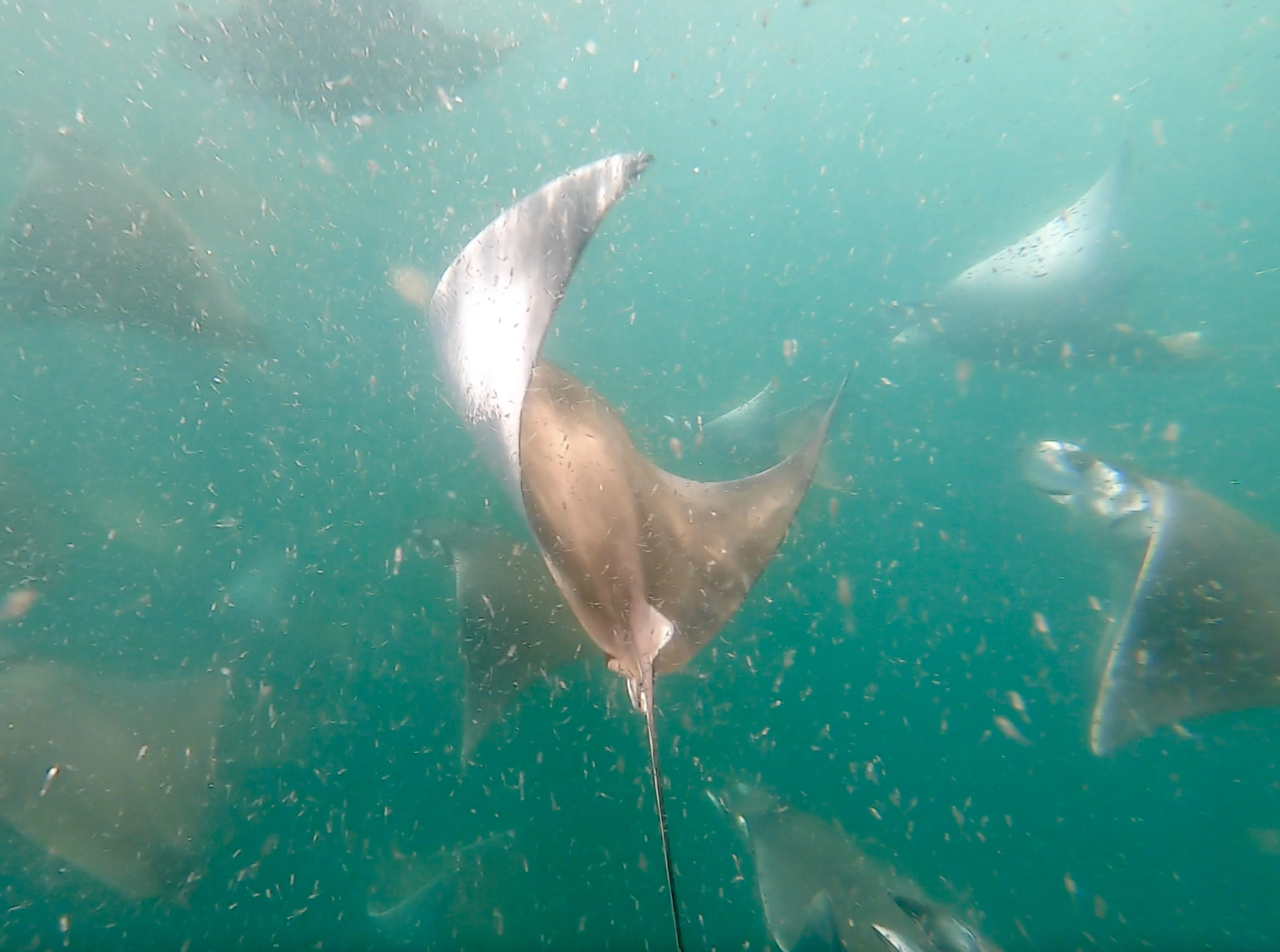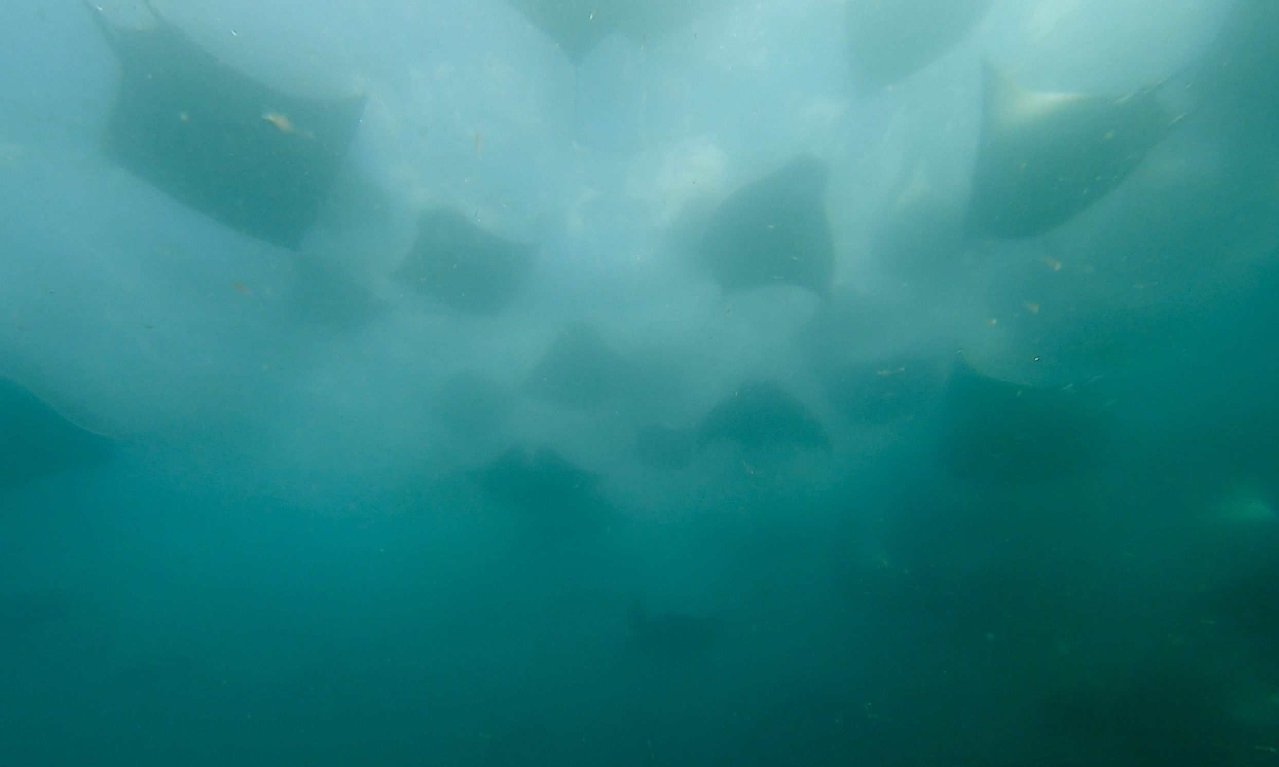 Later, when we looked closer at the video footage, we actually saw a single cow-nose ray infiltrator hiding amongst the massive population of devil rays.