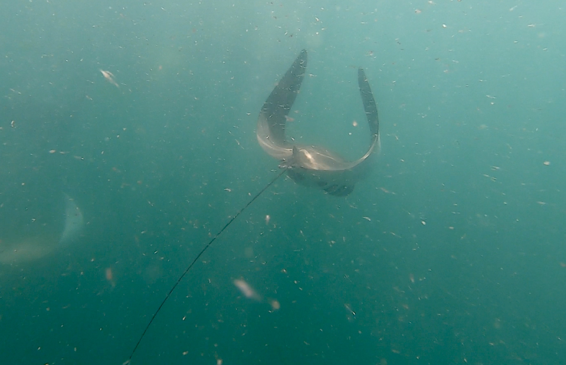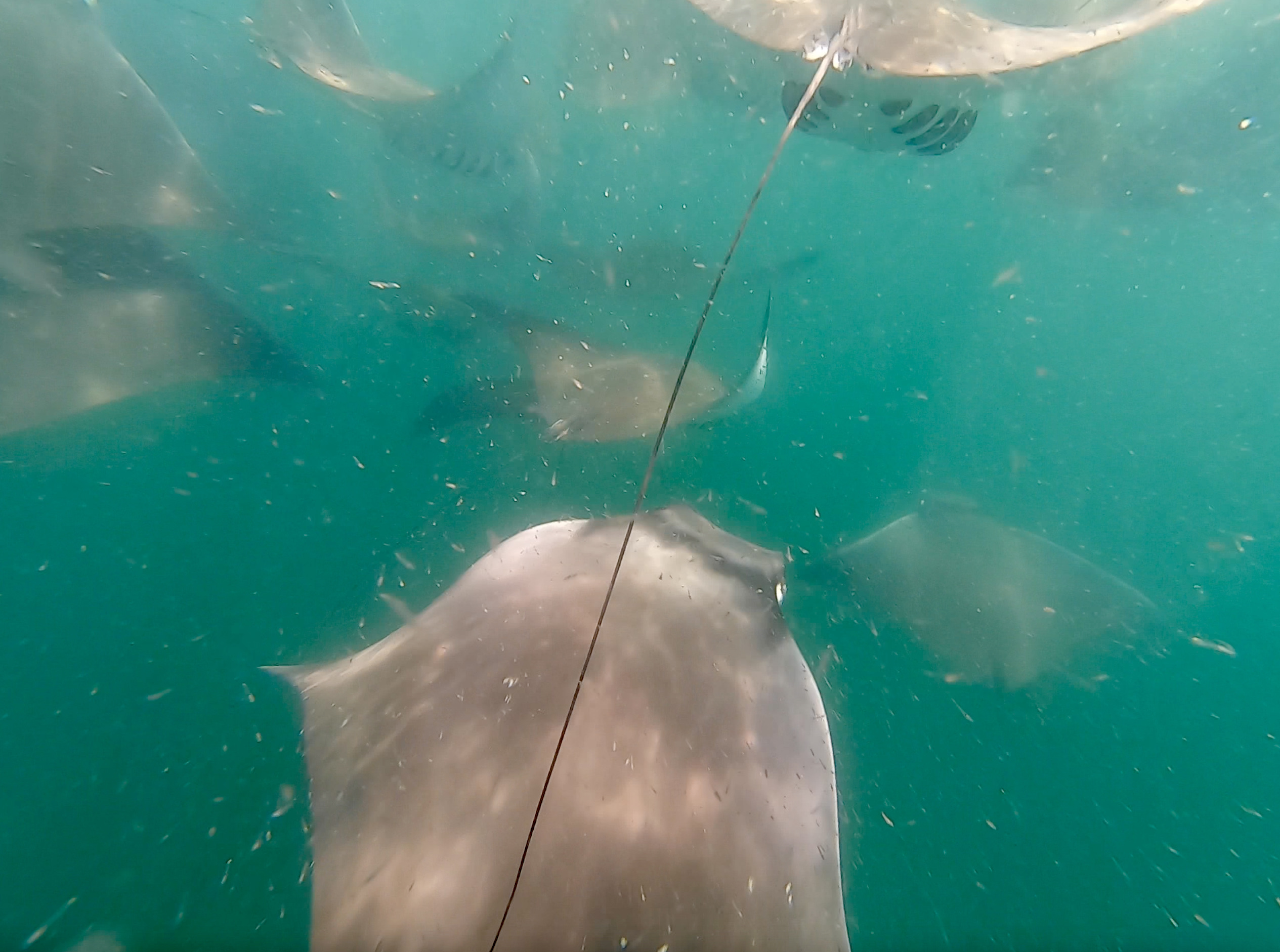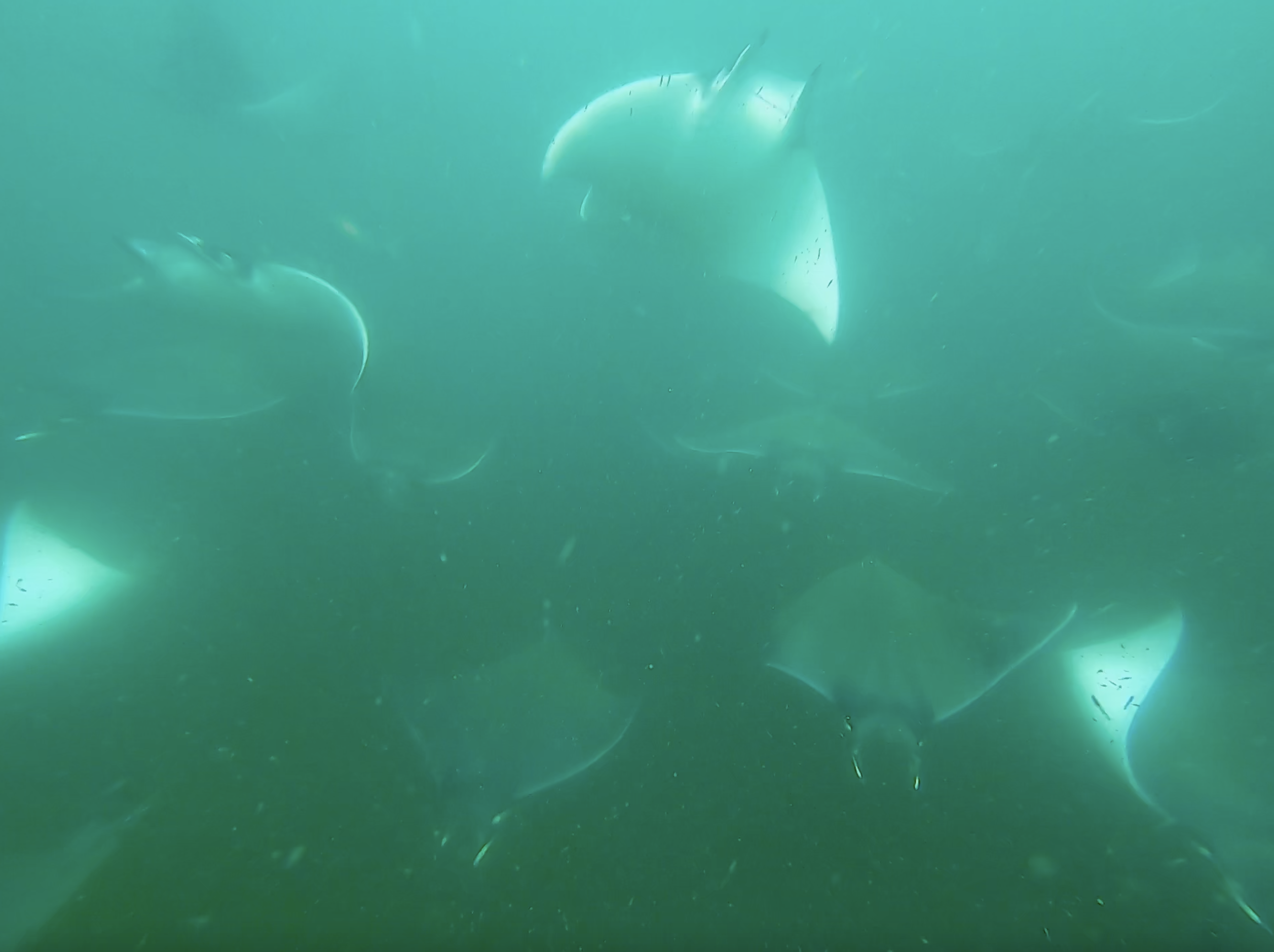 Later, when we looked closer at the video footage, we actually saw a single cow-nose ray infiltrator hiding amongst the massive population of devil rays.