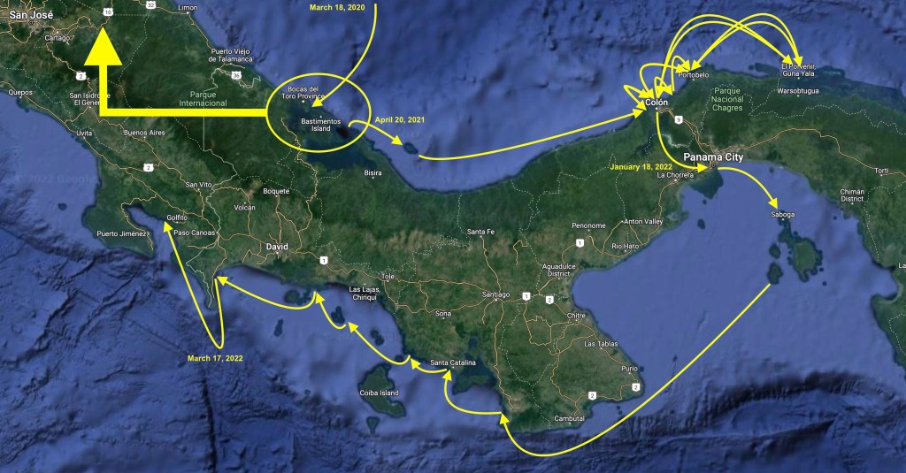 And yet possibly the most ironic and surprising number? After all that, despite the fact we were now in a different ocean — as the crow flies, we ended up clearing out of Panama only seventy five miles away from the location where we had cleared in.