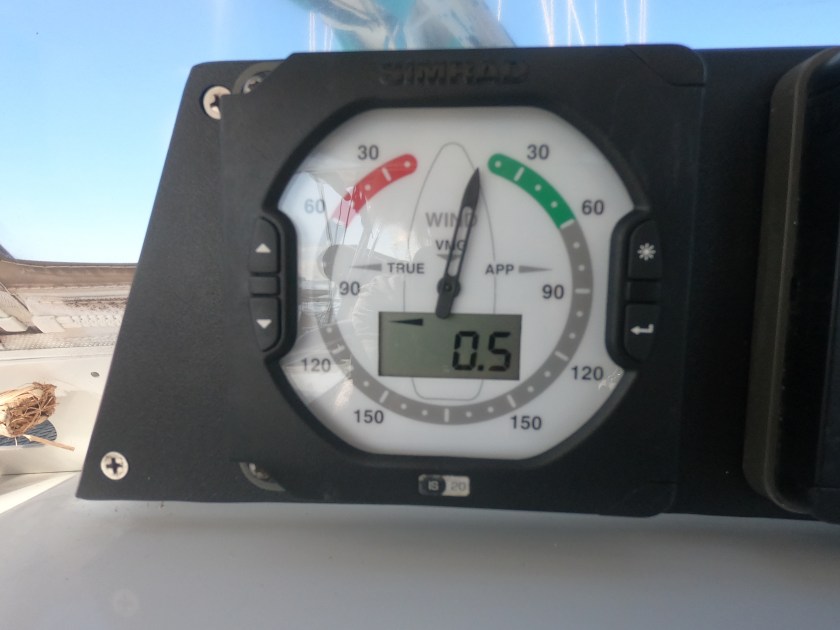 For the second day in a row, our wind indicator provided digitally displayed confirmation of the depressing reality that we would be burning diesel to get anywhere.