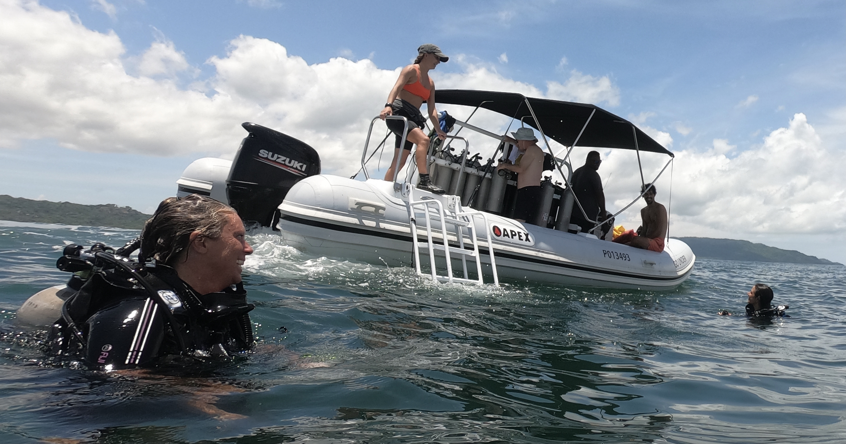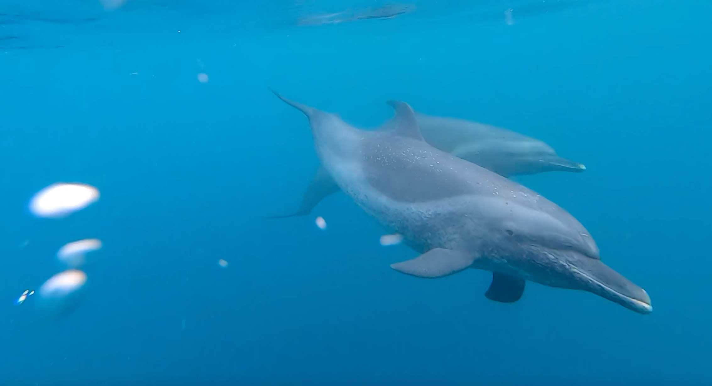 Carefully, I lowered it over the edge of the deck to about a foot under the surface and maintained an iron grip. I could only do this for ten or twenty seconds at a time. Initially, it was pretty sketchy but I quickly got a feel for it. Eventually, I moved to the transom where I could get down right next to the water. One of the dolphins was unbelievably curious; I actually thought it was trying to grab the camera a number of times and I ended up quickly snatching the GoPro out of the water as it came right up to me. After a half hour or so, the dolphins disappeared into the blue.