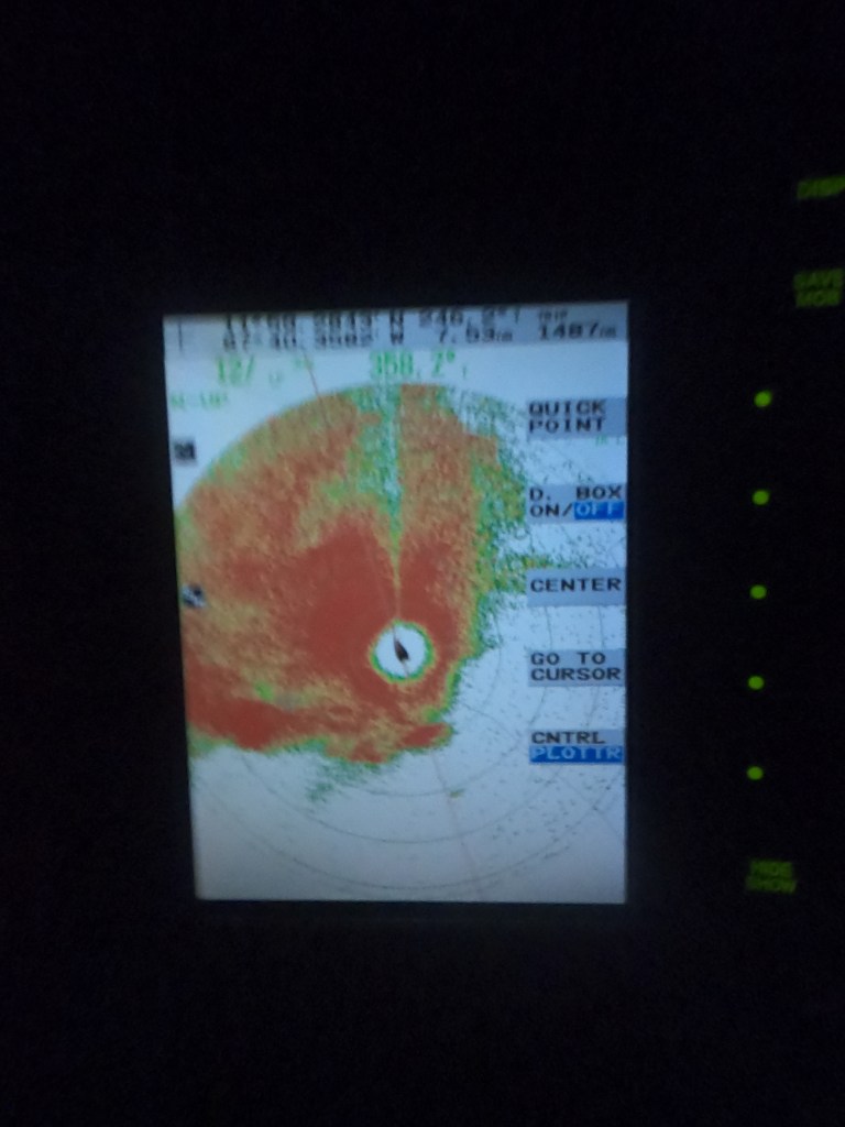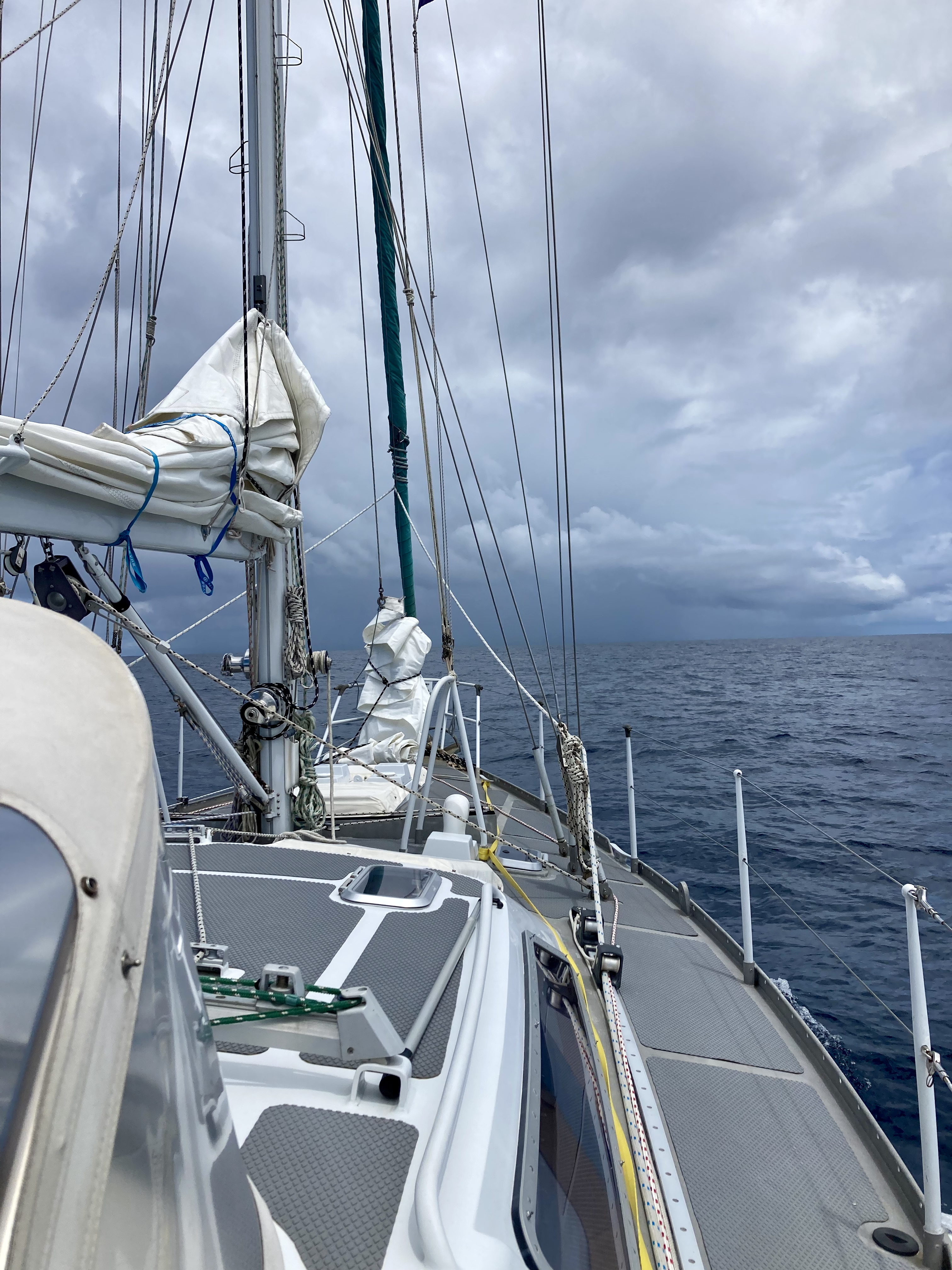 Our ongoing wishes for any wind at all turned against us that night; and the pendulum swung during Kris’ watch. The night was jet black, the winds kicked up to twenty five knots, rain smashed down, and ridiculously close lightning exploded all around us. Sometimes the majesty and power of the ocean and sky can be awe inspiring. Other times it just scares the shit out of you. Dawn couldn’t come soon enough.