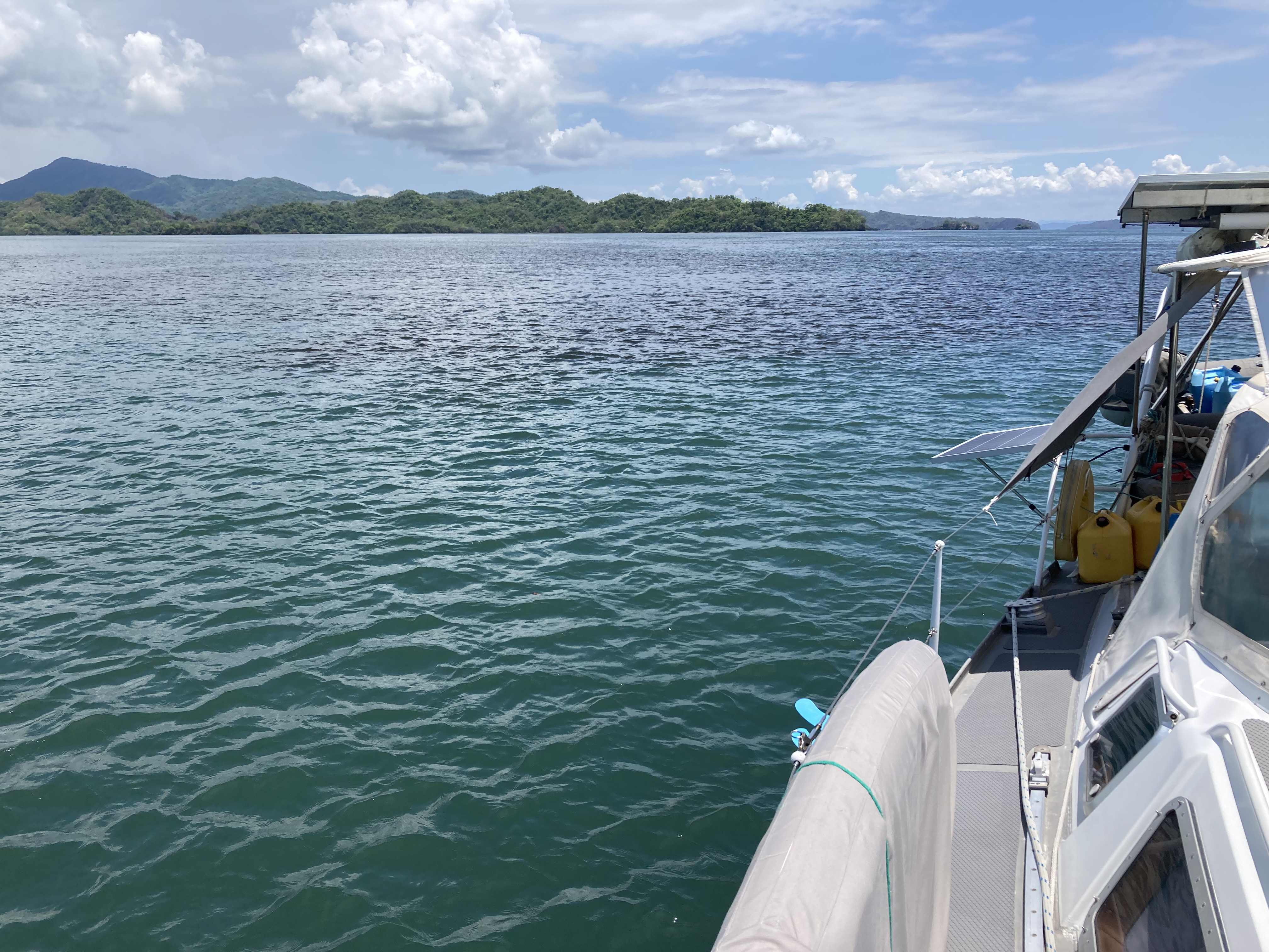 Entering Bahia de Fonseca, Exit had already been moving under engine power for hours. Any hope of sailing had been cast aside with the realization that we needed to get to our destination before nightfall, which turned out to be a sound strategy we would more fully appreciate upon our departure. Aside from passing through the worst red tide we had ever come across in which the water surrounding us looked like coffee and smelled horrendous, we arrived and anchored without incident at Punta El Pateon well before sunset.