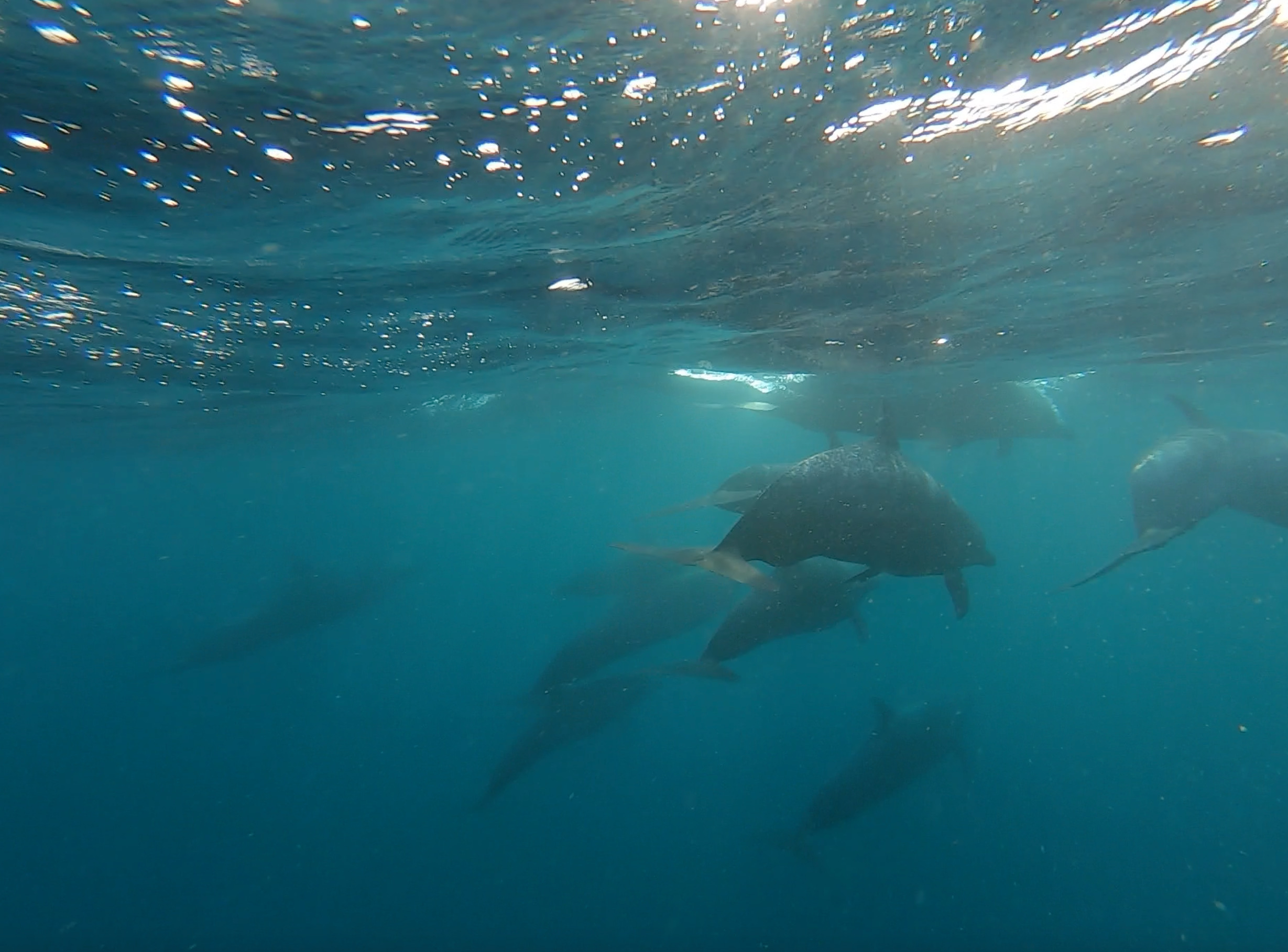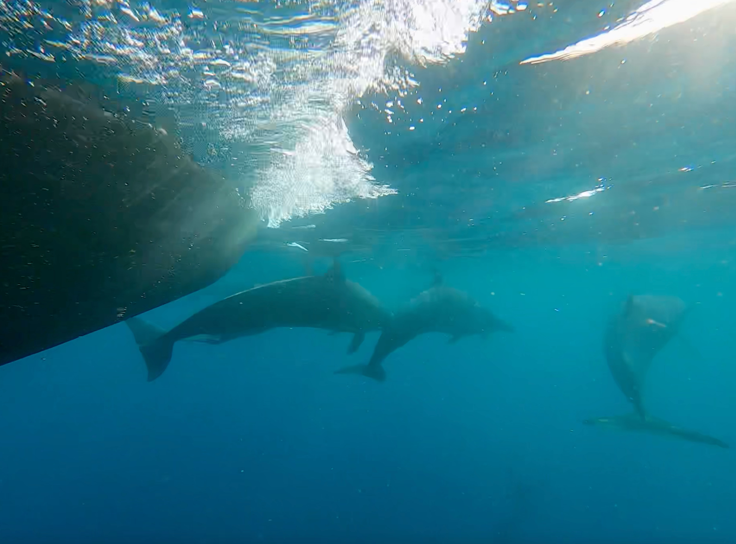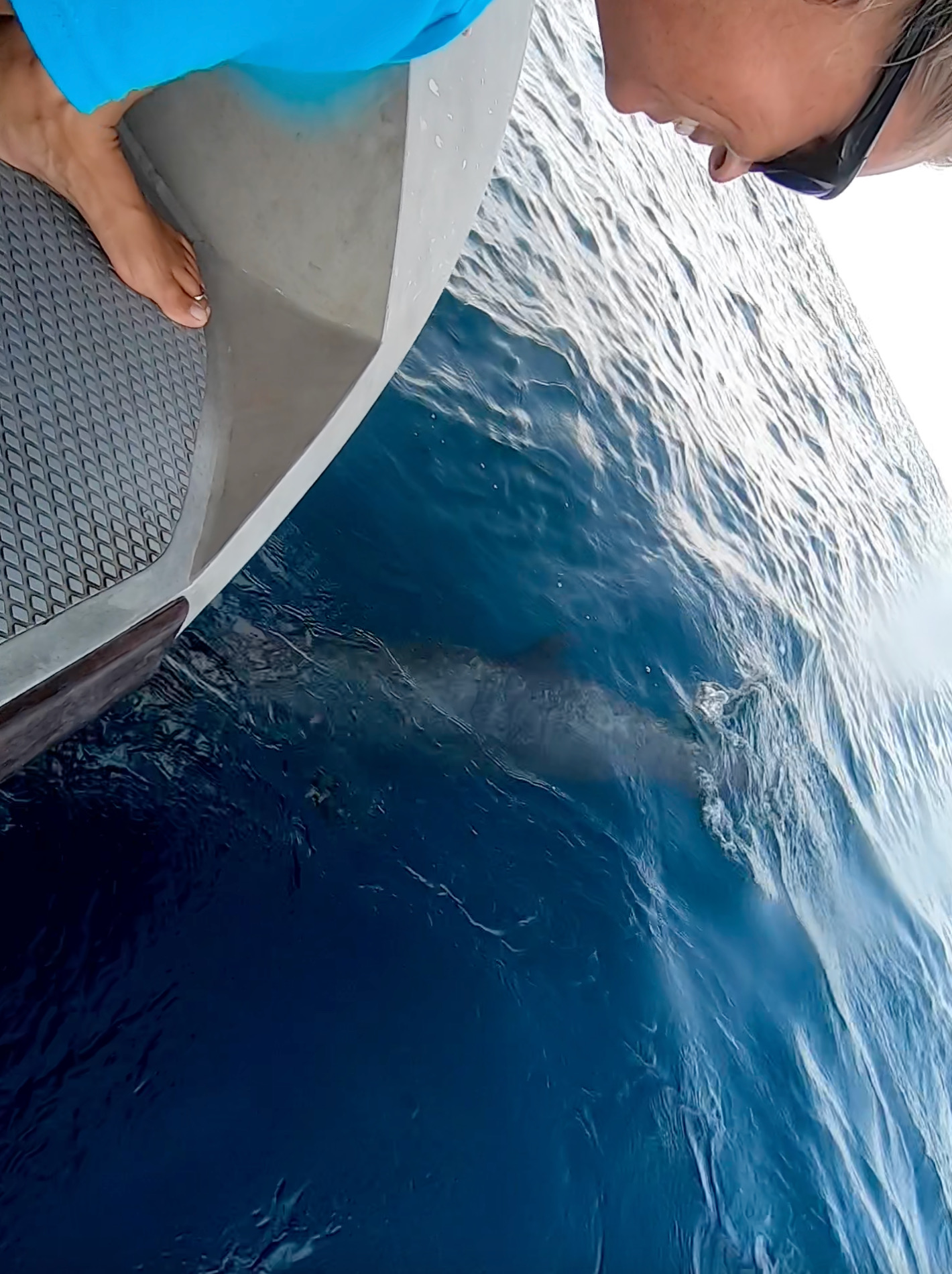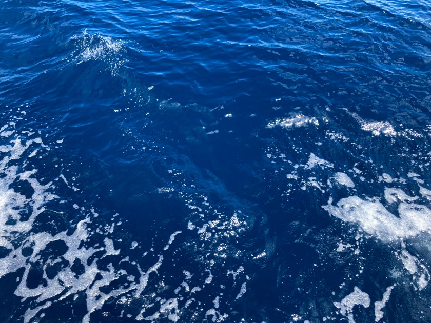 Much to the chagrin of Kris, who foresaw a potential catastrophe unfolding, I decided to attempt submerging our GoPro on its extendible pole into to water while we were underway trying to capture footage of the dolphins moving alongside us. Even though the GoPro was inside an underwater housing and we were only moving at a couple of knots of speed, I admit I was flirting with disaster. The resistance caused by the water made it much more difficult than I thought to keep ahold of the pole. If the pole snapped or I dropped the GoPro, it would be gone forever…we were in three hundred feet of water. I would be keel-hauled by Kris and it would be well deserved