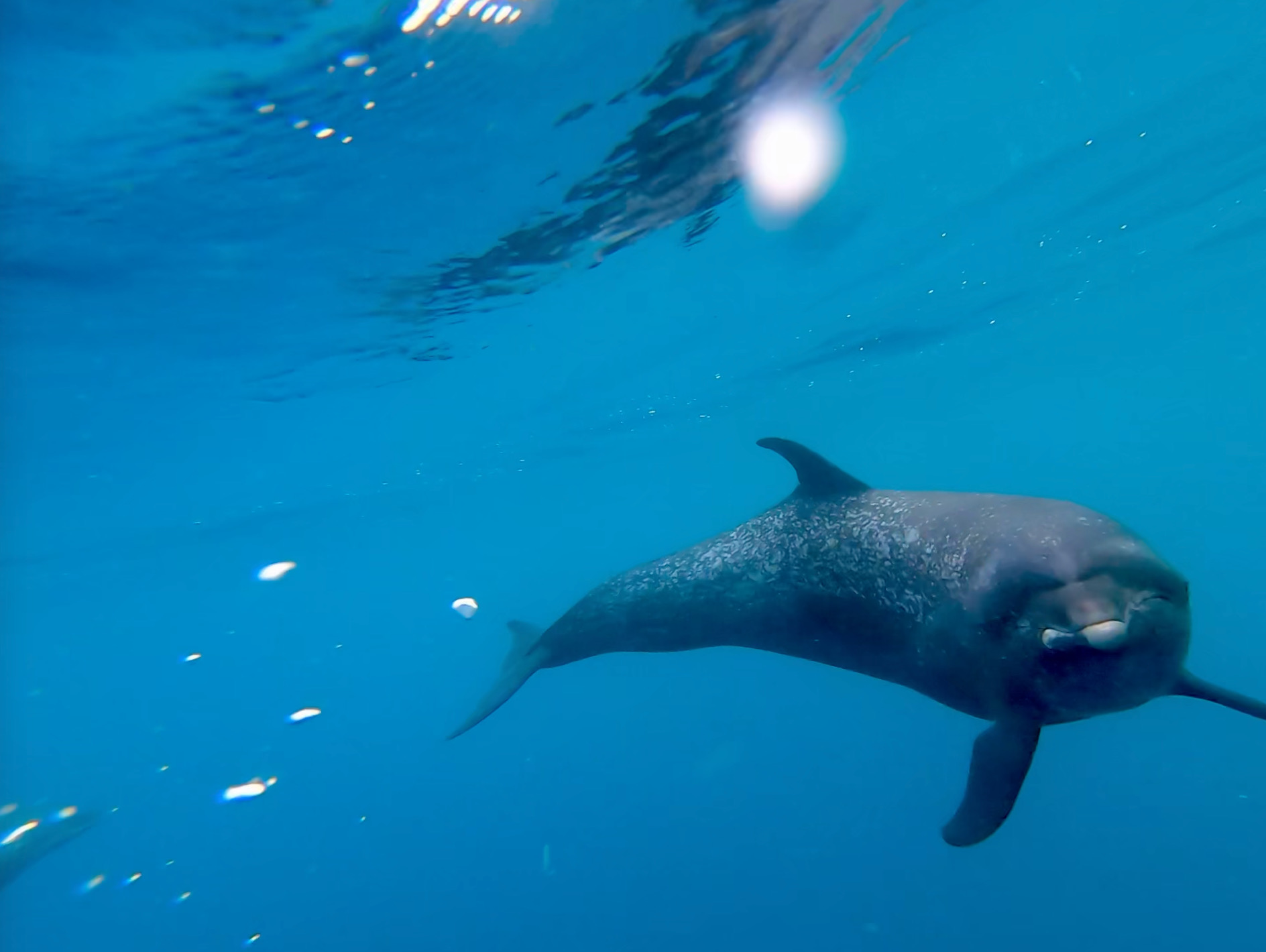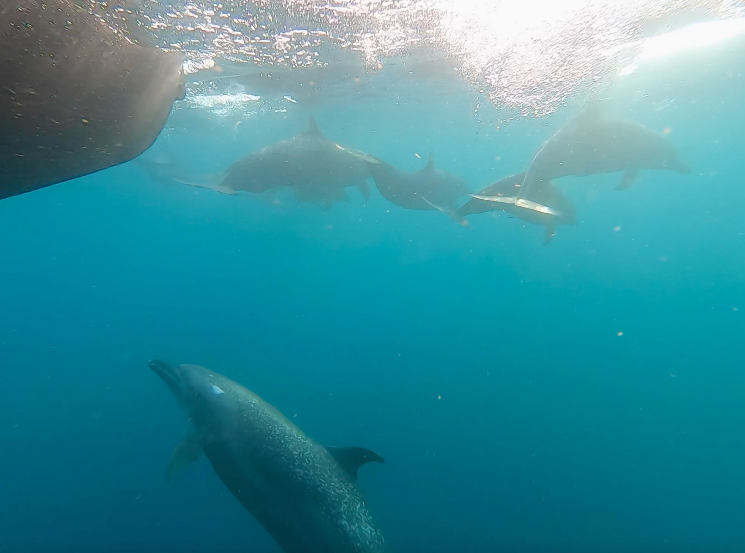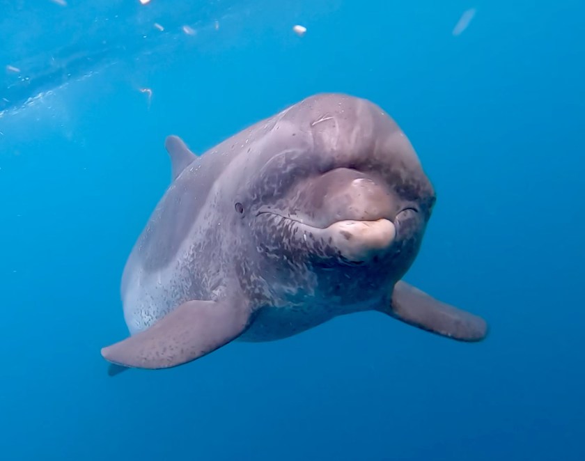Much to the chagrin of Kris, who foresaw a potential catastrophe unfolding, I decided to attempt submerging our GoPro on its extendible pole into to water while we were underway trying to capture footage of the dolphins moving alongside us. Even though the GoPro was inside an underwater housing and we were only moving at a couple of knots of speed, I admit I was flirting with disaster. The resistance caused by the water made it much more difficult than I thought to keep ahold of the pole. If the pole snapped or I dropped the GoPro, it would be gone forever…we were in three hundred feet of water. I would be keel-hauled by Kris and it would be well deserved
