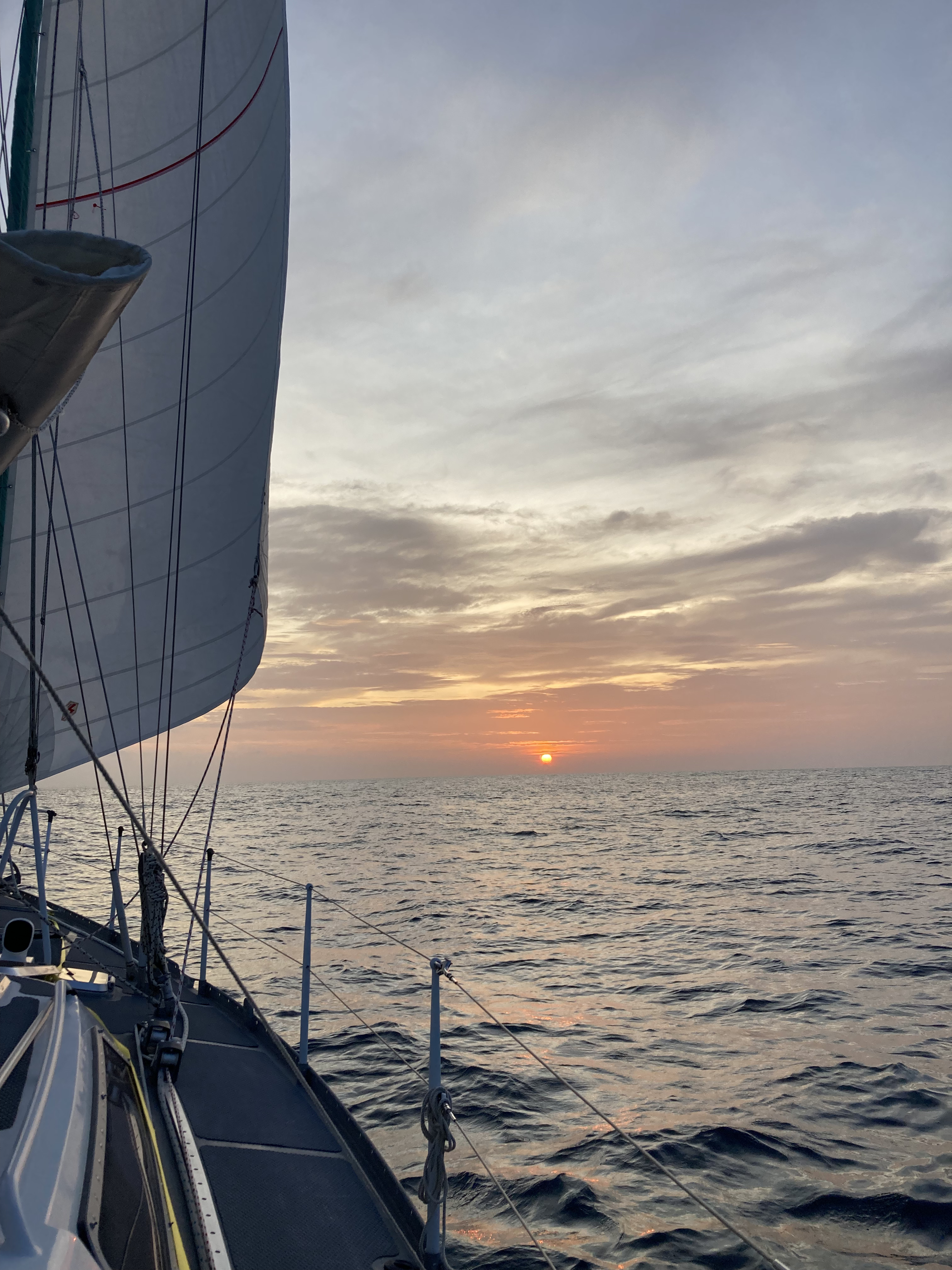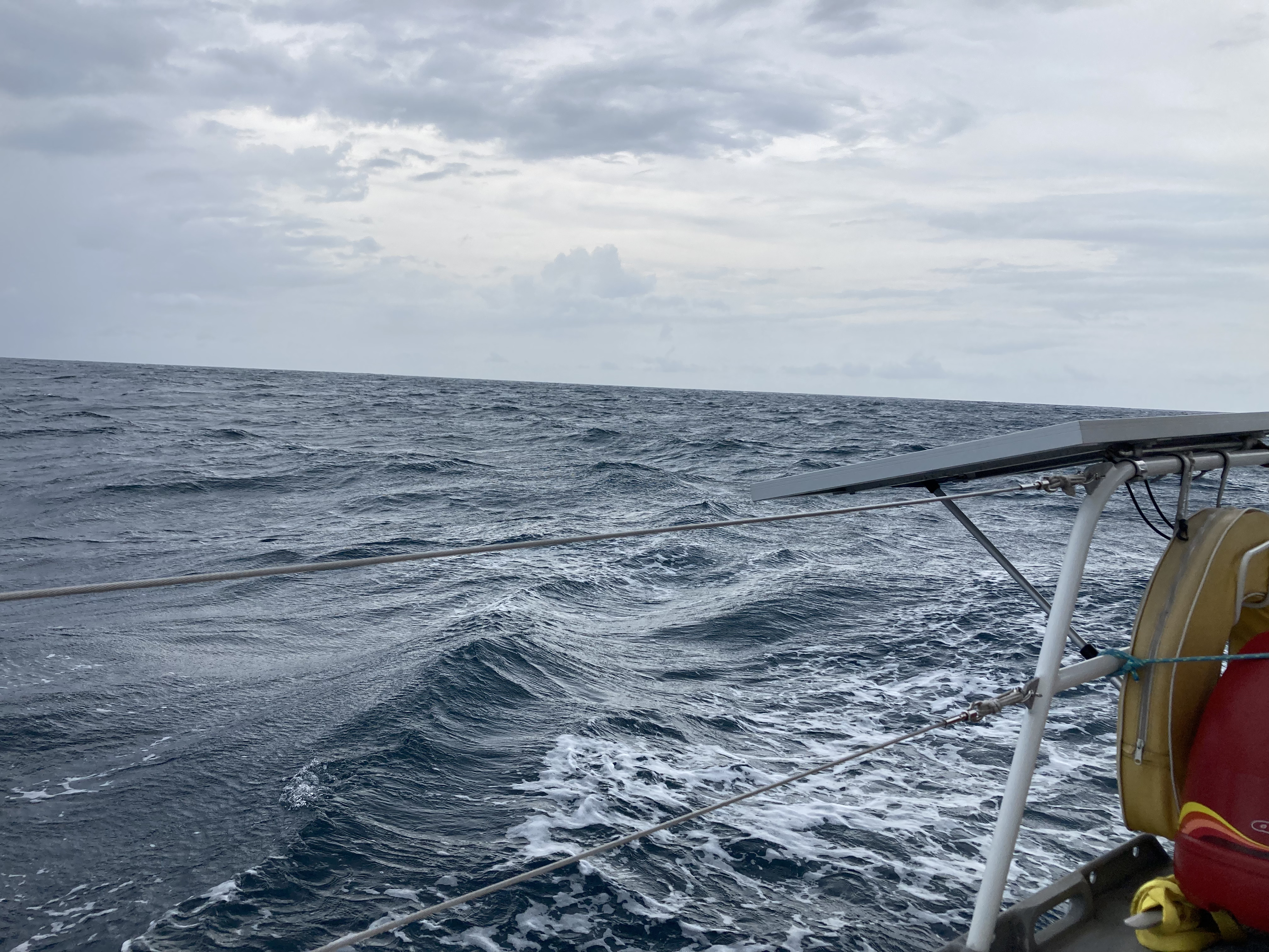 Unlike the previous evening, the night passed with minimal excitement. Sporadic lights in the distance revealed the presence of fishing boats that had to be navigated well around; but the unforeseen reward of a nighttime passage came in occasional visits from dolphins. Speeding towards us and alongside Exit just under the surface, they took on the appearance of torpedos as the water surrounding them was illuminated in a crazy and eerie green glow due to the bioluminescence.