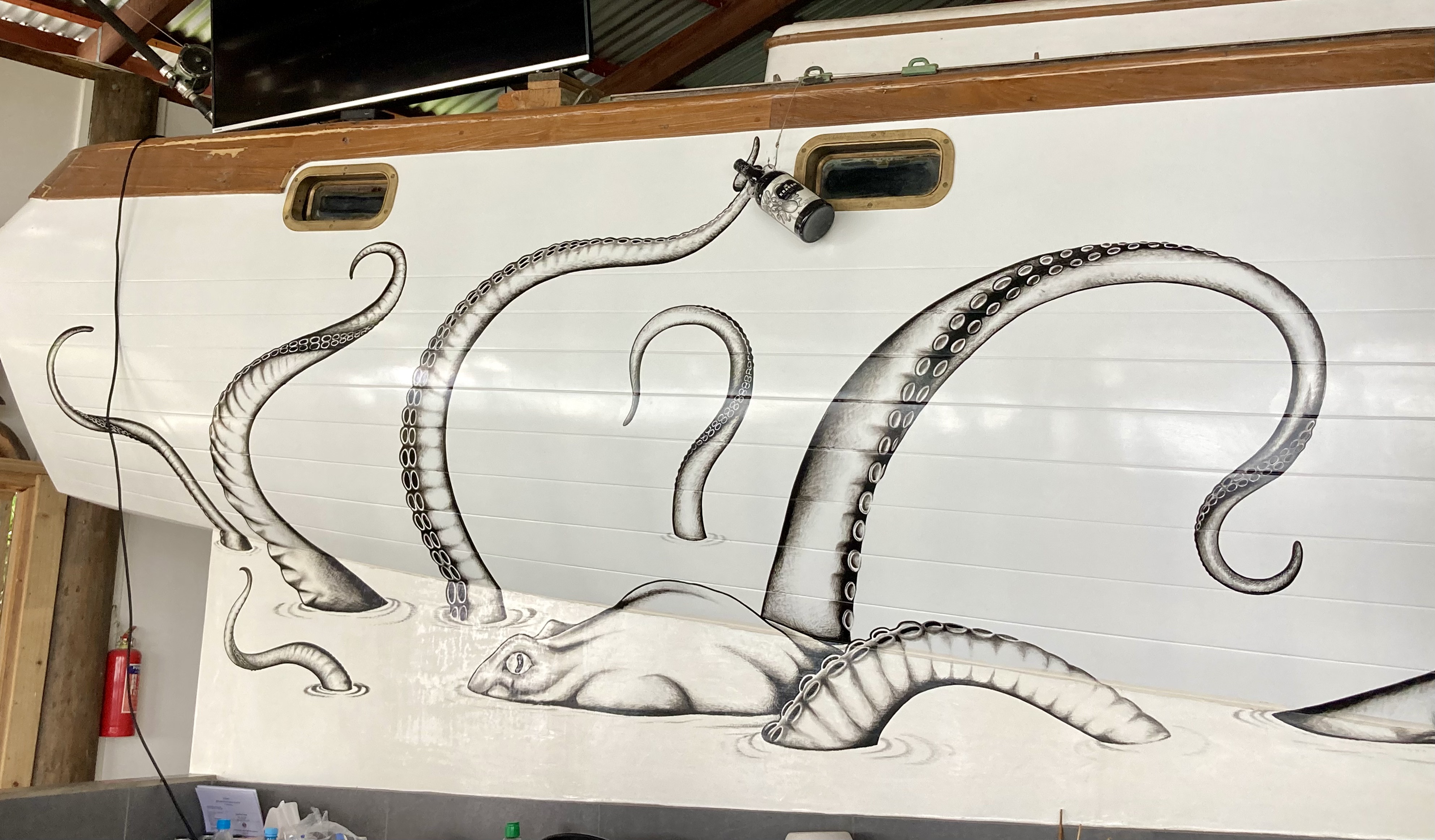 While our displays were down, our only crew member “Slo-T.H.”, seen in the previous photo resting in front of the displays, maintained a constant watch. For over 10,000 nautical miles – ever since Kris found the carved wooden sloth floating at the surface while paddling her SUP near the Bocas del Toro mangroves in Panama during Covid, Slo-T.H. has maintained a 24/7 vigil in that location.
