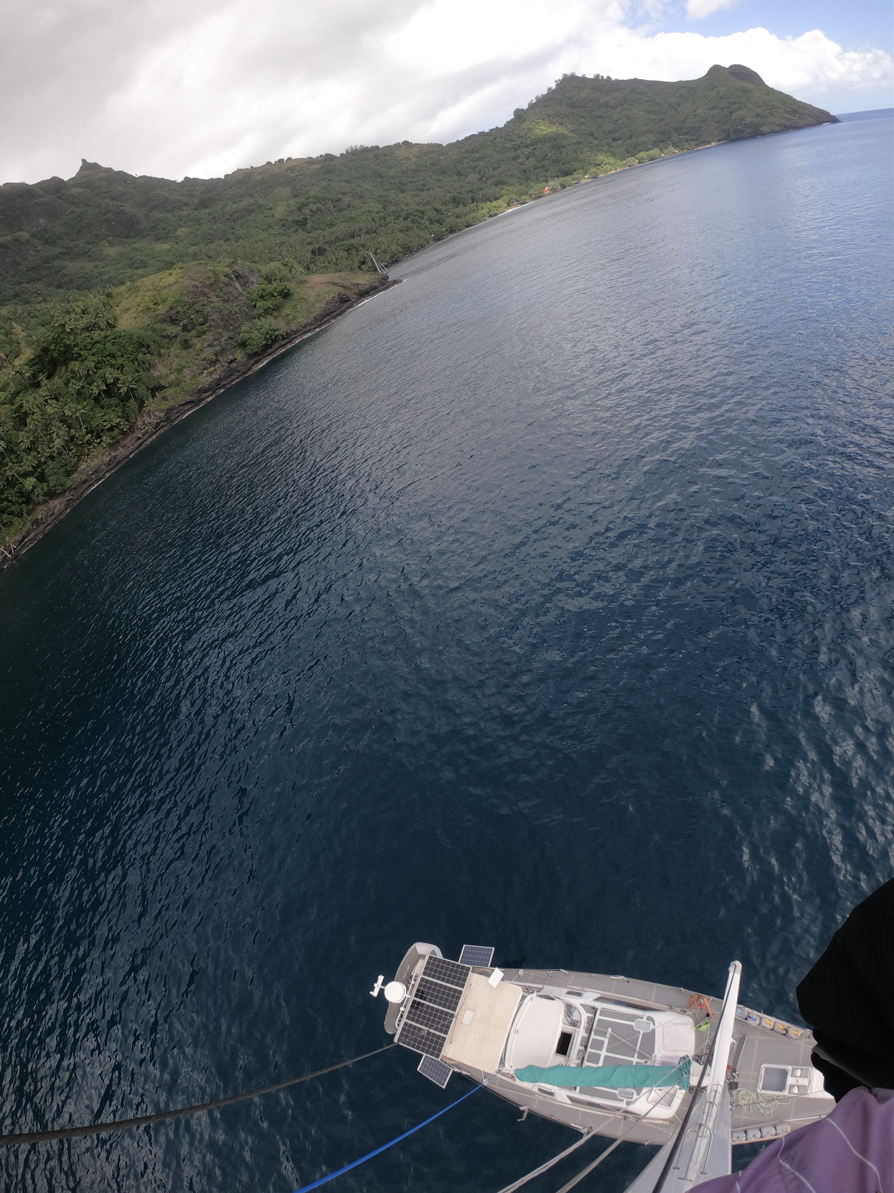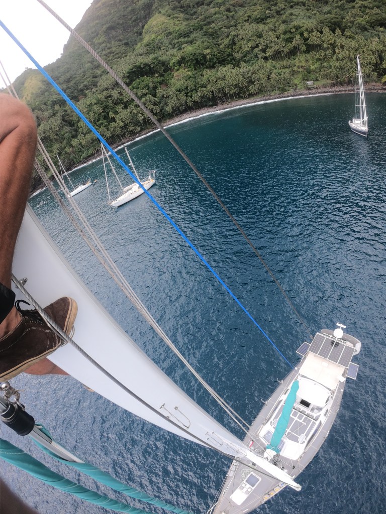 Once we had settled in at Nukuatea and appeared to have a fair weather window of opportunity with no squalls or deluges emanate, we decided on a trip up the mast.