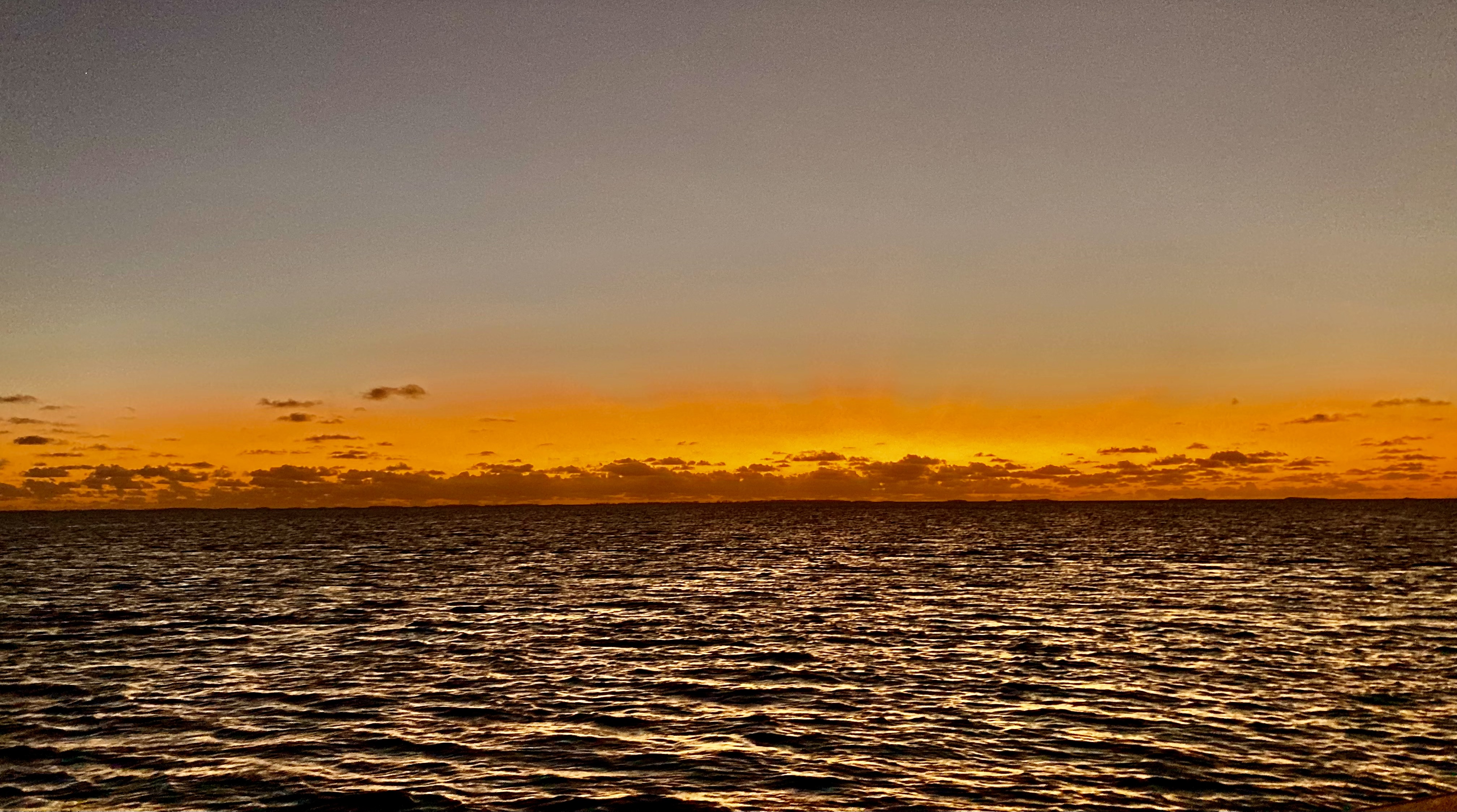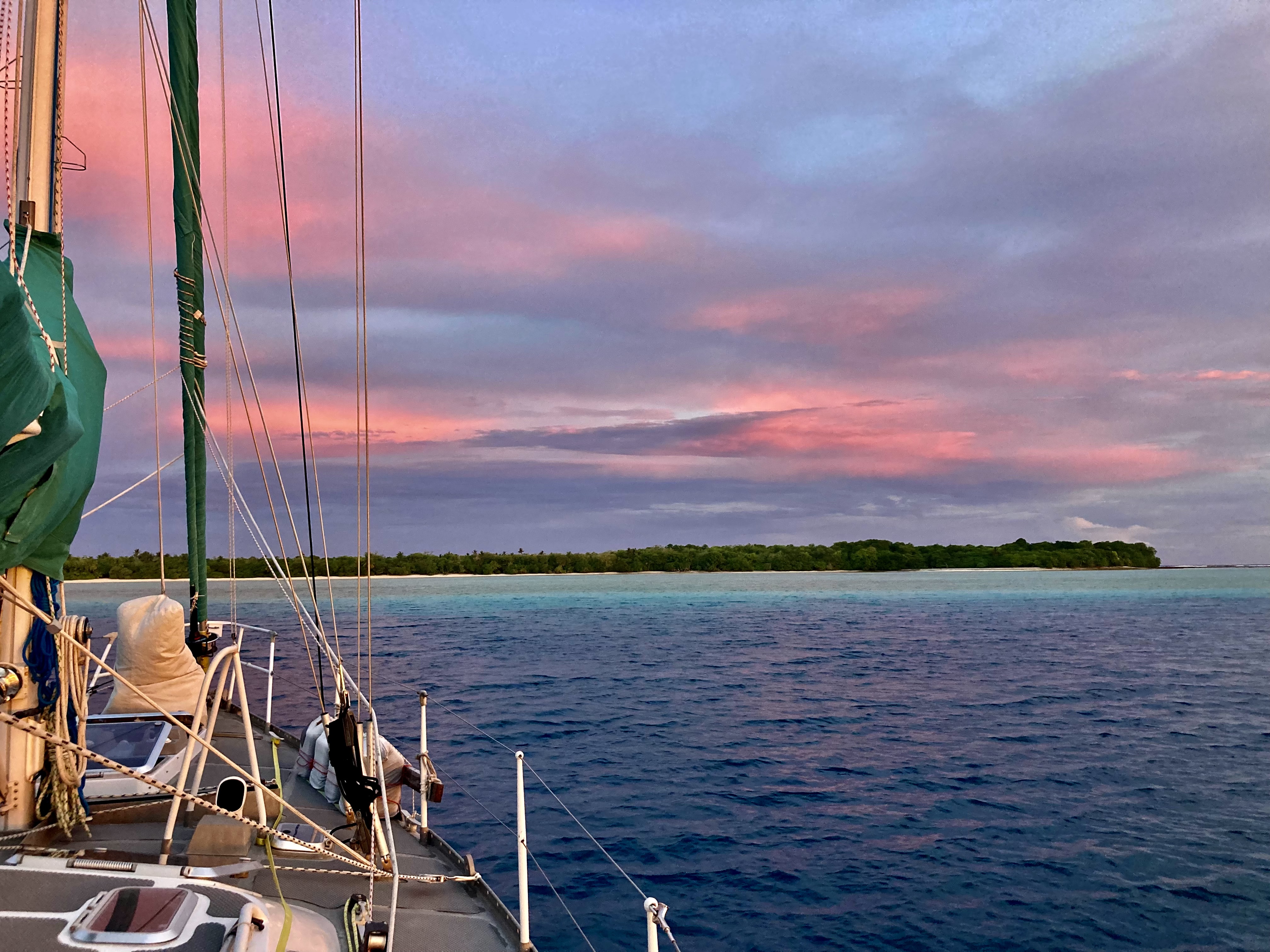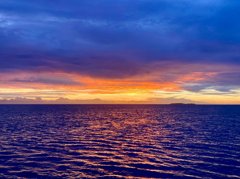 Six hours later, the dark silhouette of Funafuti lay directly in front of us, barely left of the new day’s sun, which had just cleared the horizon line.
