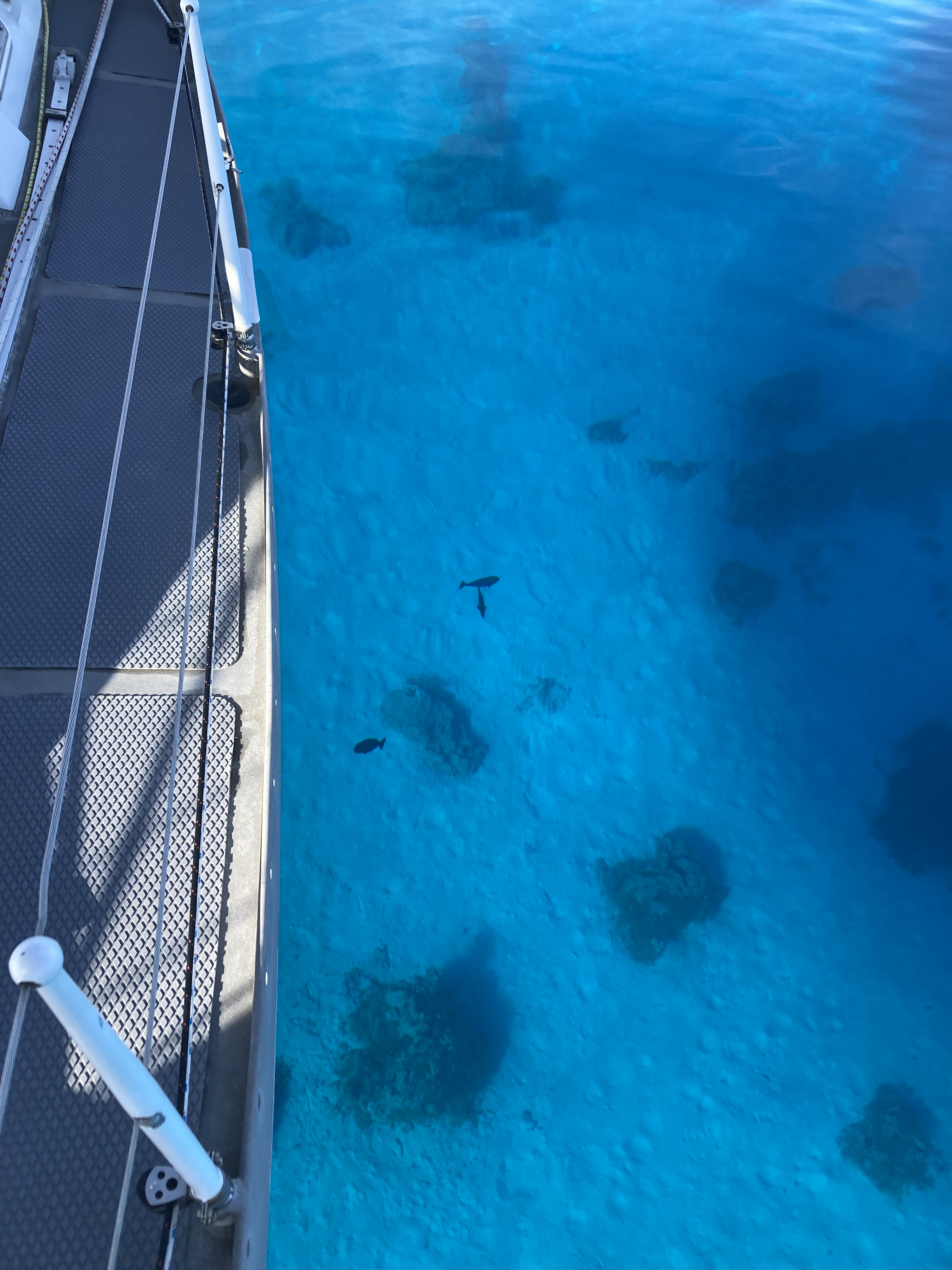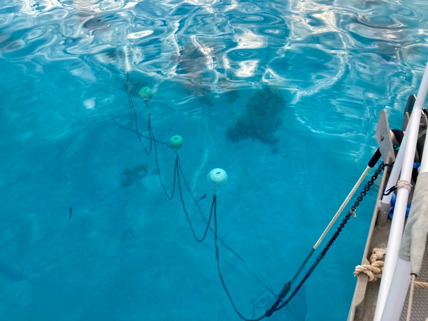 With very few exceptions this configuration helped immensely to avoid dragging over the top of or getting wrapped around coral. As Exit swung around, the suspended chain passed right over the top of any obstructions below it. There were numerous instances we watched other boats having to reset or move to an entirely new location with any changes in wind direction. Just as often we watched boats dealing with the misery of trying to raise anchor, only to realize they were hung up on something, oftentimes in the worst of conditions.