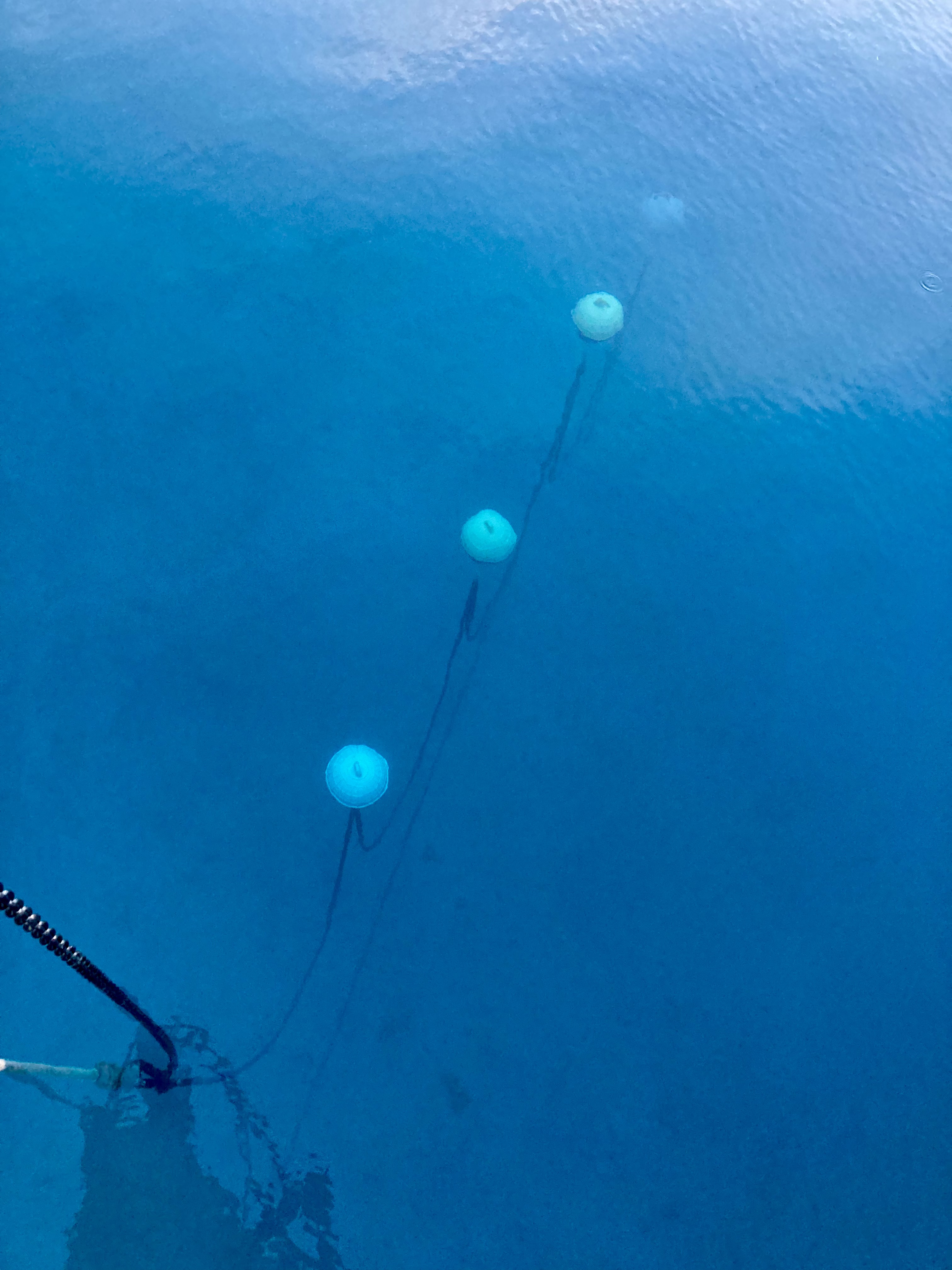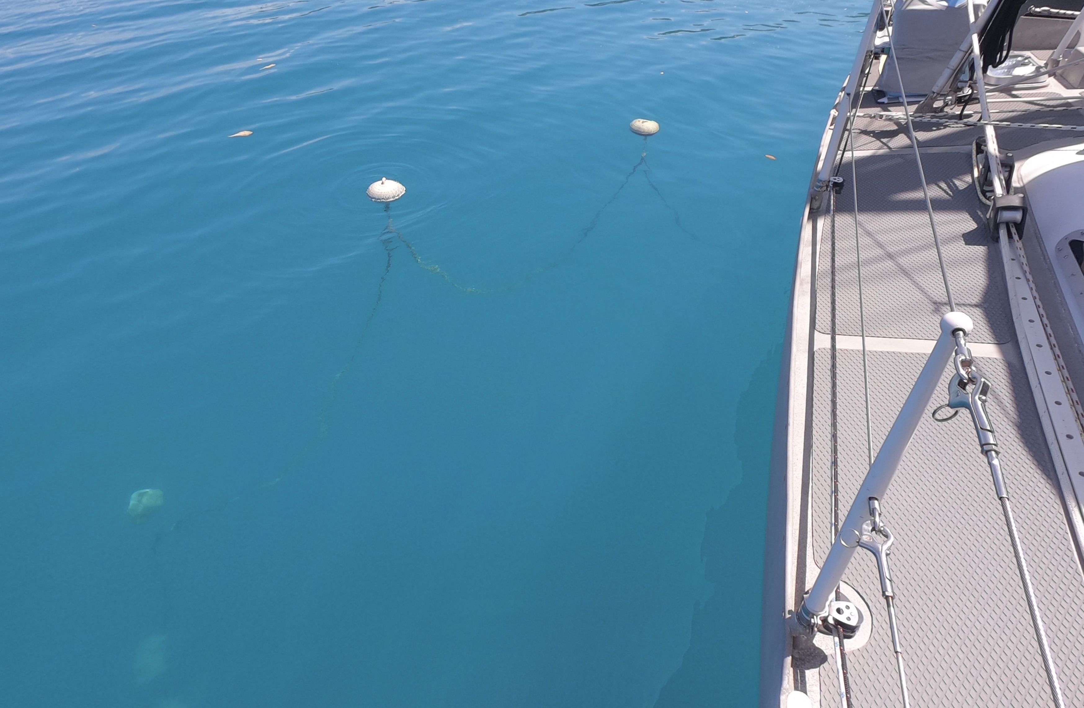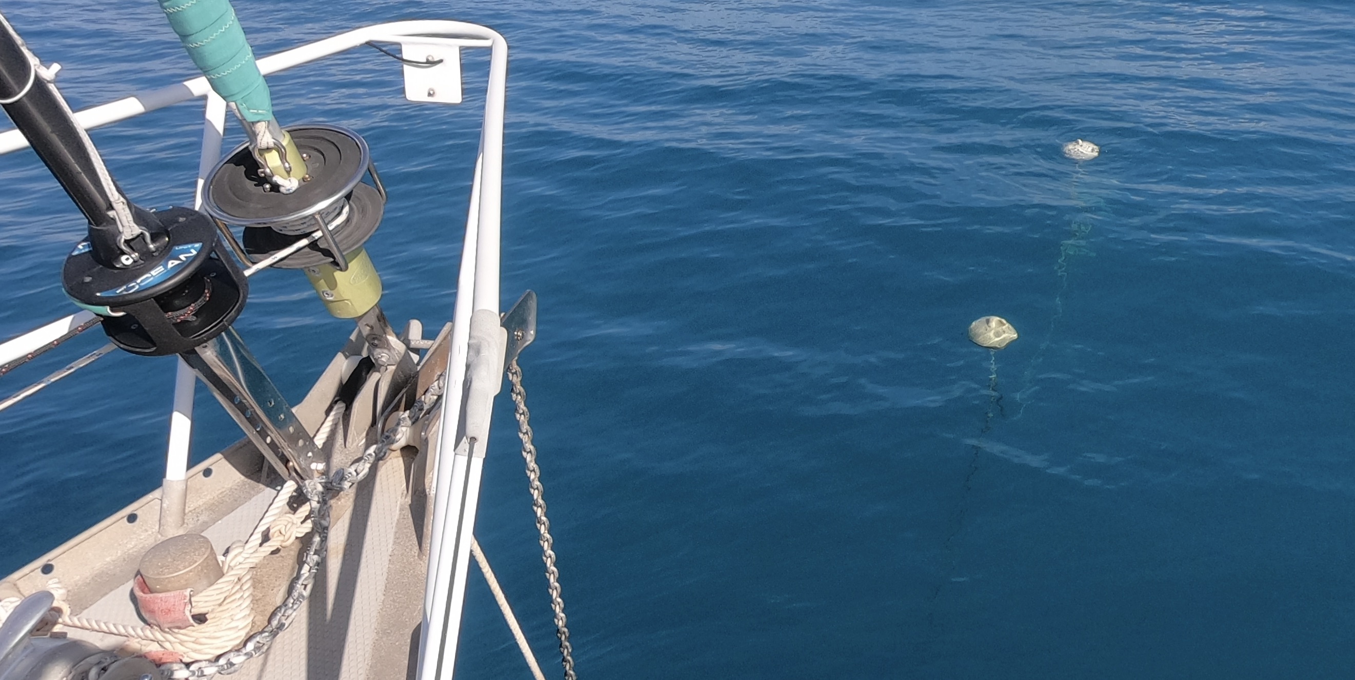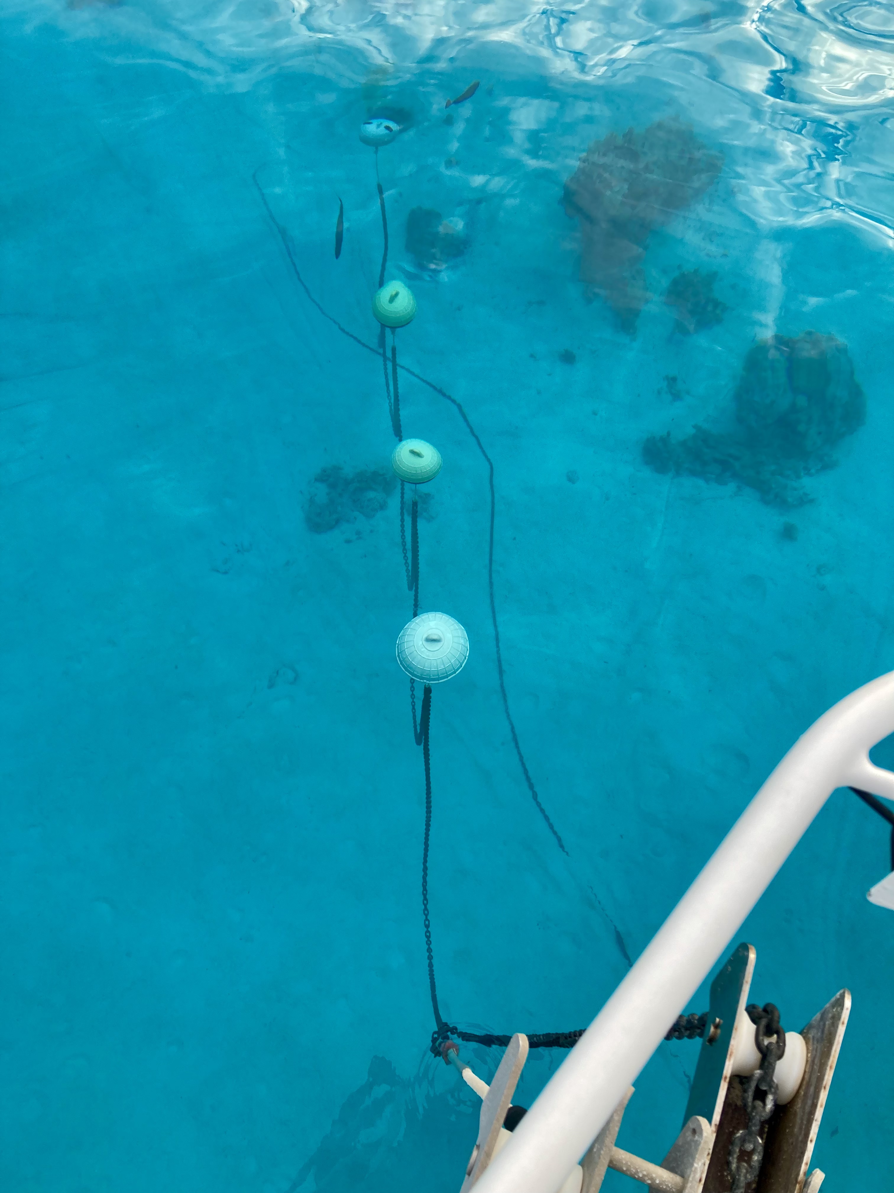 Removing floats in response to changing conditions was certainly much easier than having to lift the chain to put on floats we later deemed necessary. The floats can be removed quite quickly even by free diving down to them. On the other hand, the floats definitely can’t be pulled down to attach to the chain underwater, even with scuba gear.
