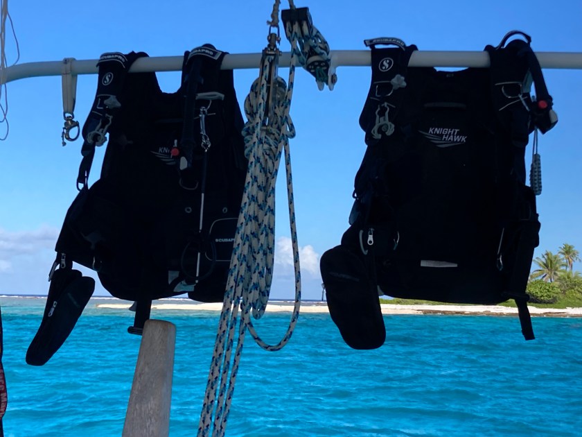 Soon after, we learned there was a dive shop on the island. It was owned and run by a French expat named Pascal who had moved to Wallis twenty three years ago. We stopped by his tiny shop – more of a hut, complete with equipment hangers made literally from sticks – and signed up to join a dive already scheduled for the following day in one of the passes.