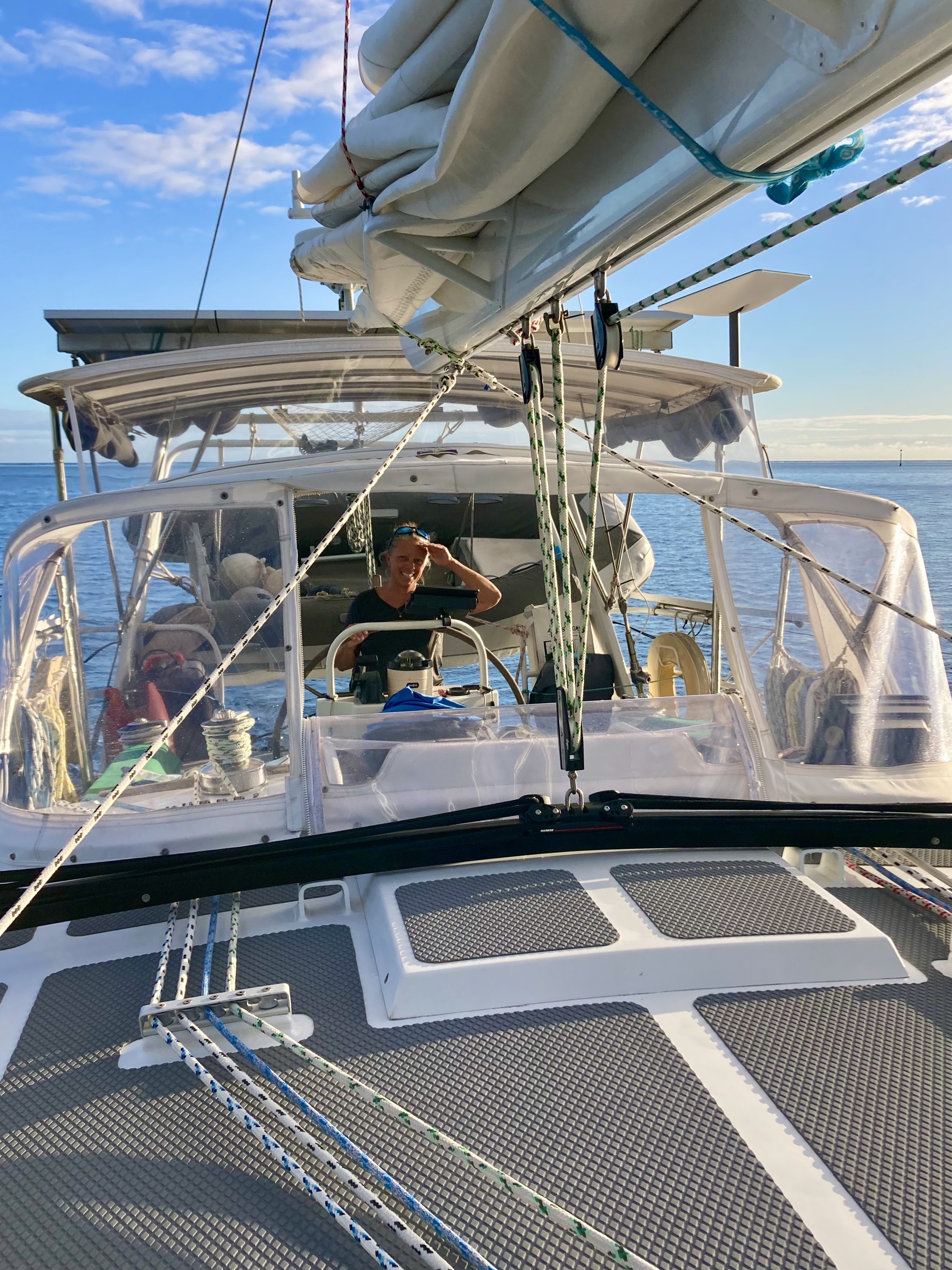 Hence, another trip up the mast. Fortunately, this time in perfect conditions – at anchor in flat water with enough clouds to prevent the sun from cooking me yet not enough to unleash a torrent of rain and/or lightning.
