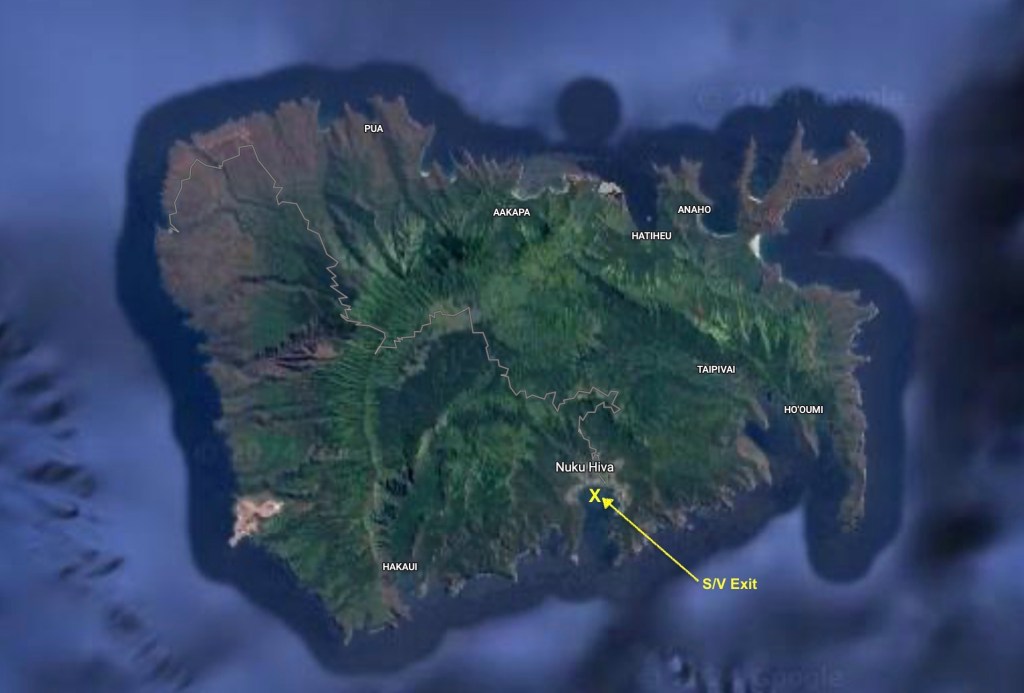 The distance between Nuku Hiva and Hiva Oa (the other main island in the Marquesas group) was about eighty-five nautical miles; a bit more than a day sail for us, but an easy overnight passage.