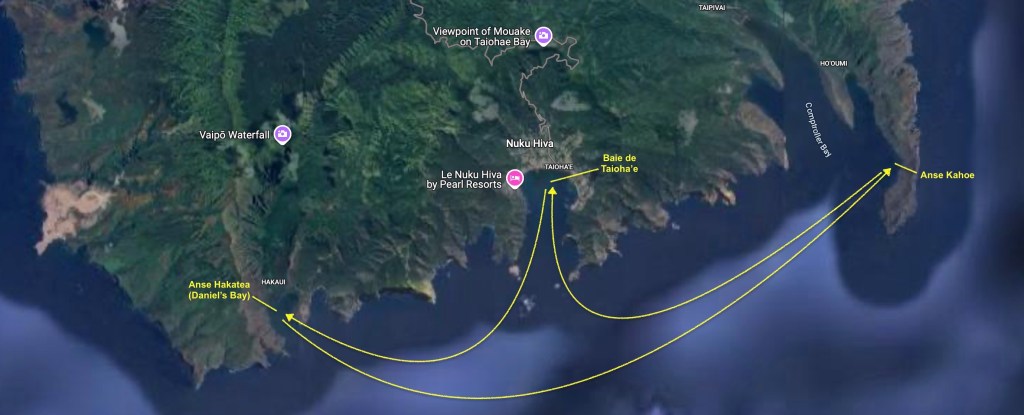 A few days later we sailed ten miles east, past Baie de Taioha’e, and dropped anchor at Anse Kahoe. Then back to Baie de Taioha’e, followed by another return to Daniel’s Bay.