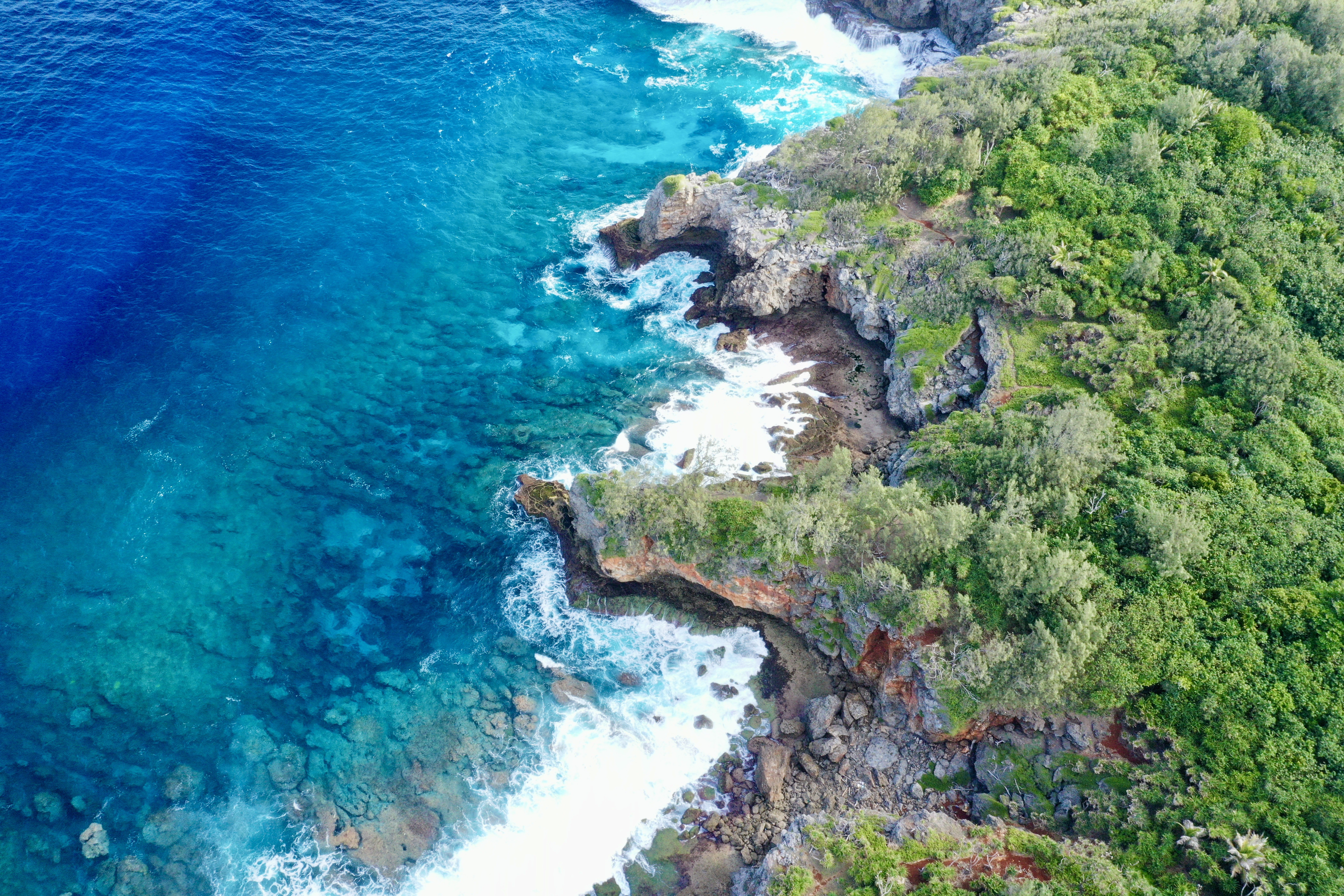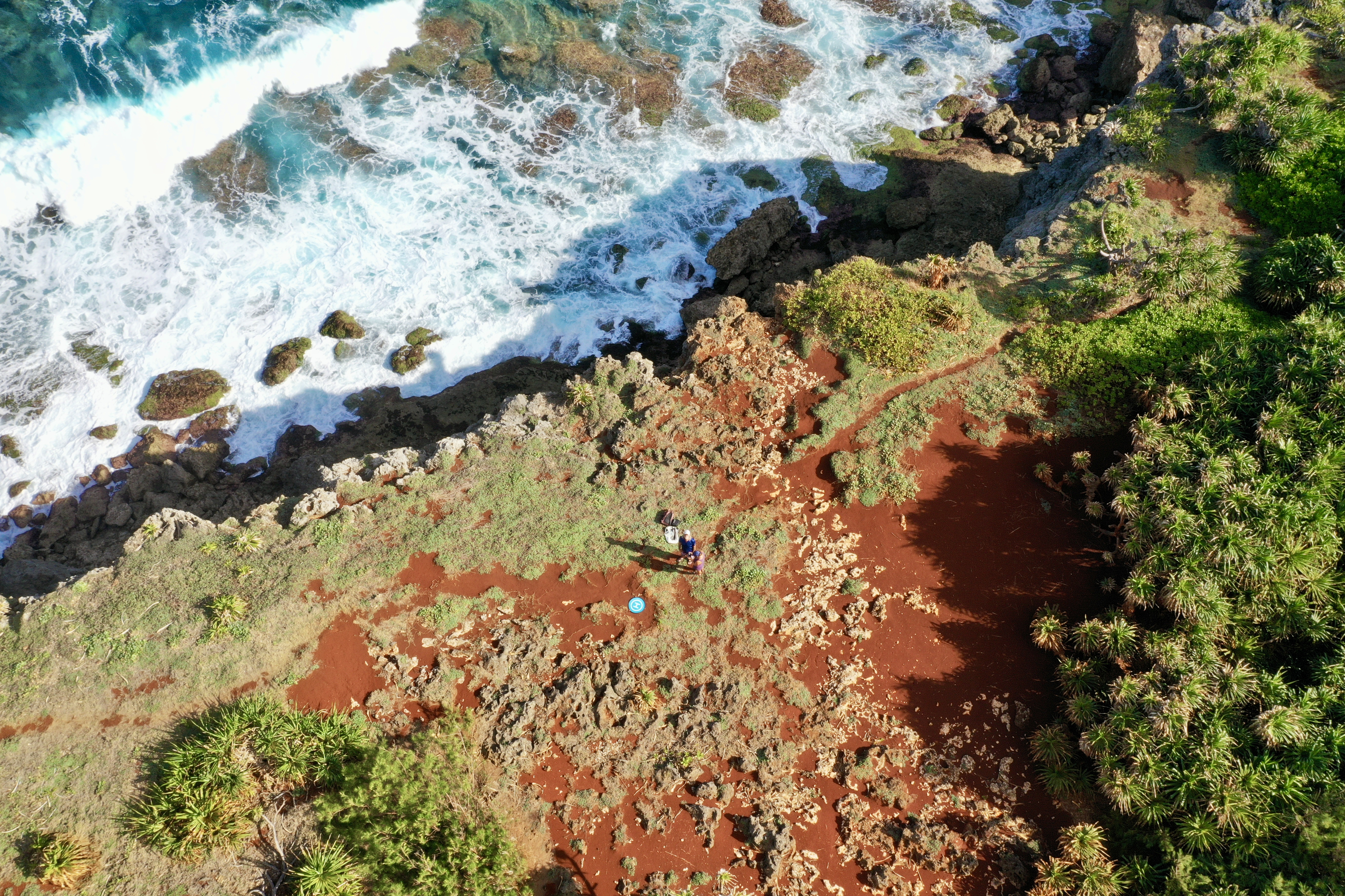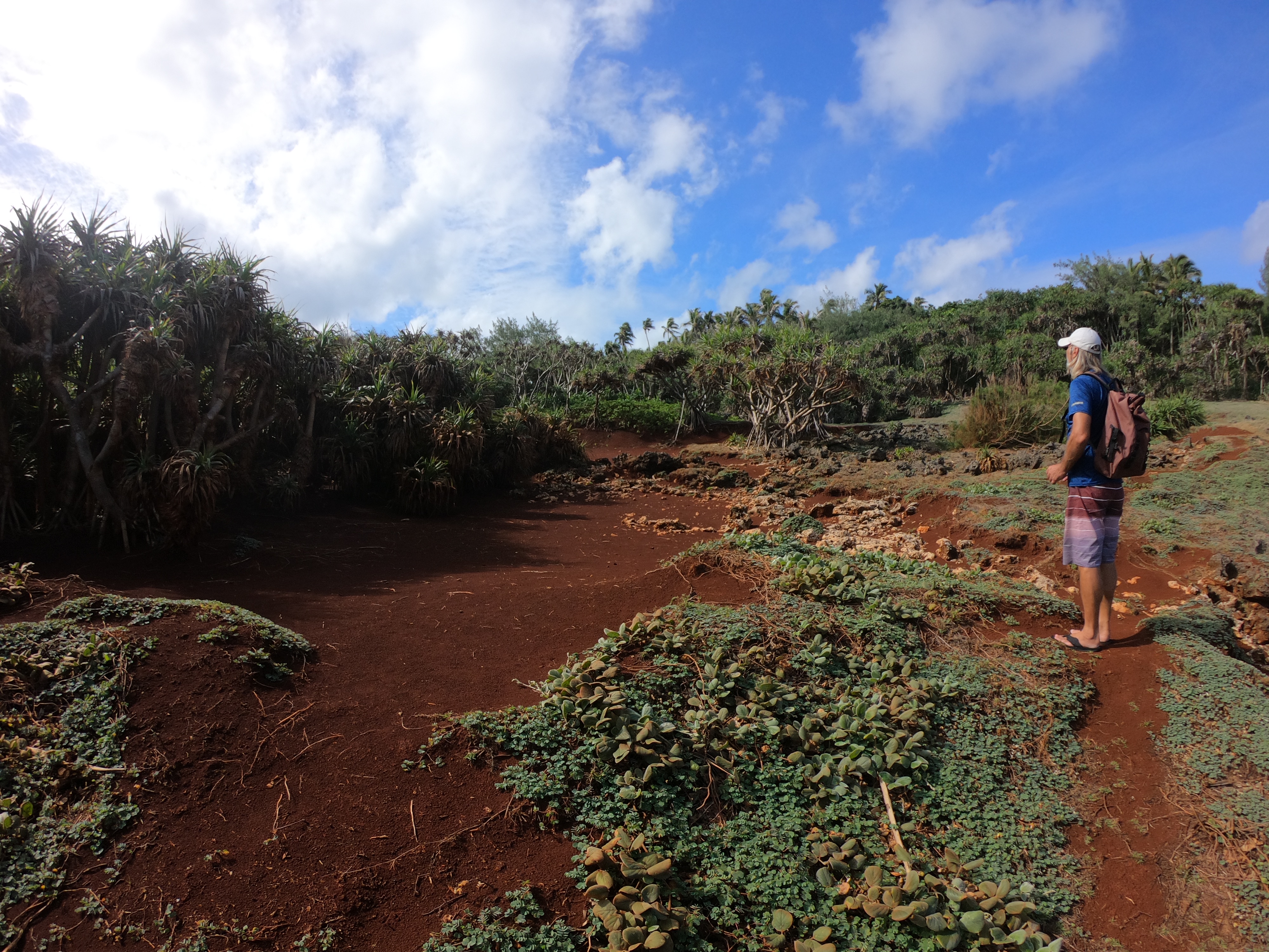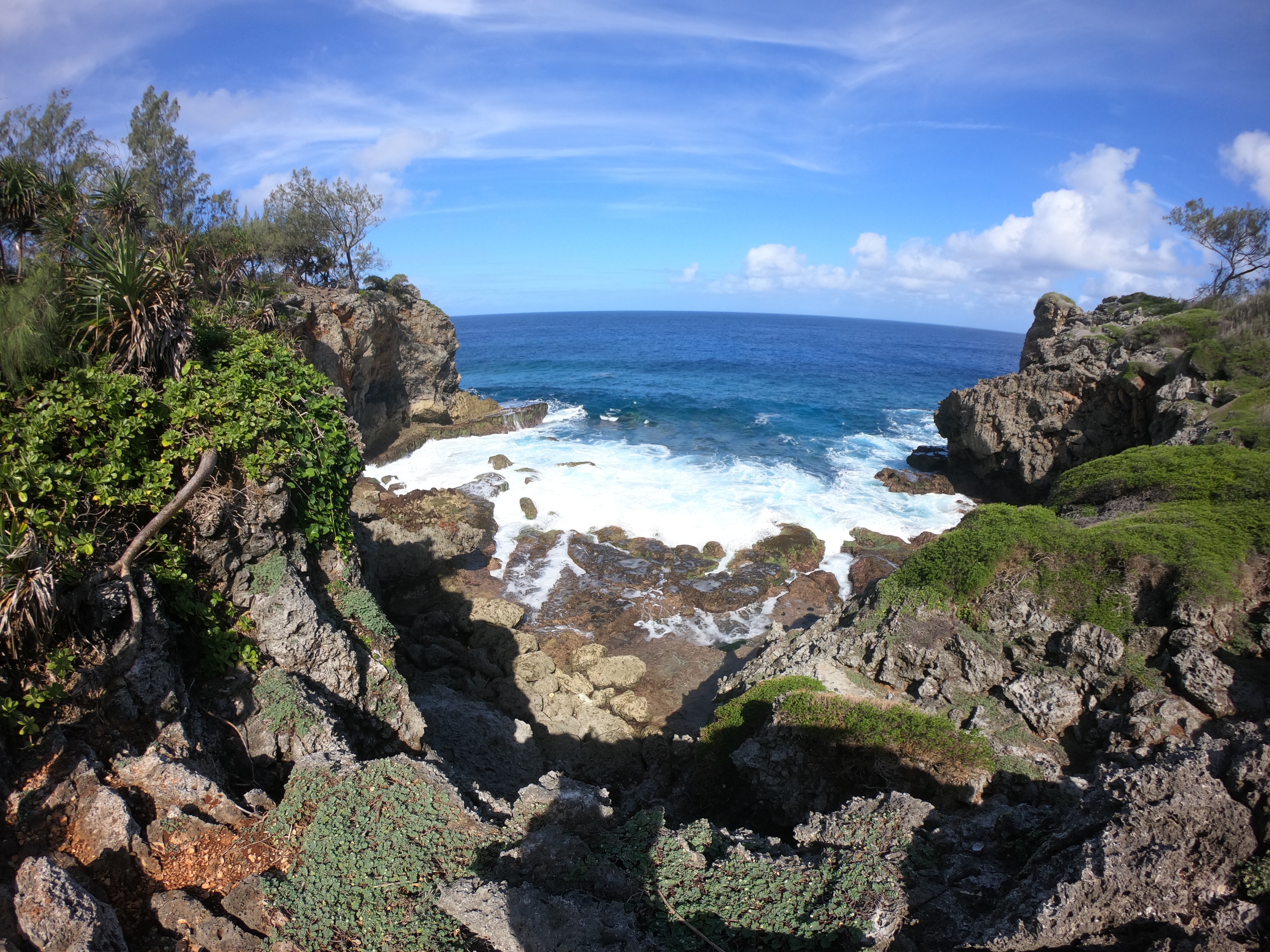 The Tuamotus Archipelago is made up of atolls – peaks of inactive volcanoes which over time have eroded to sea level, filled with water, and eventually become enclosed lagoons surrounded by fringing reefs and/or narrow bands land. The land surrounding the lagoon, comprised of volcanic rock, sand, and dead coral may only be tens of meters wide and sections cab be completely submerged during high tides. Typically there is some sort of folliage – palm or various species of trees, bushes and tangled ground cover.