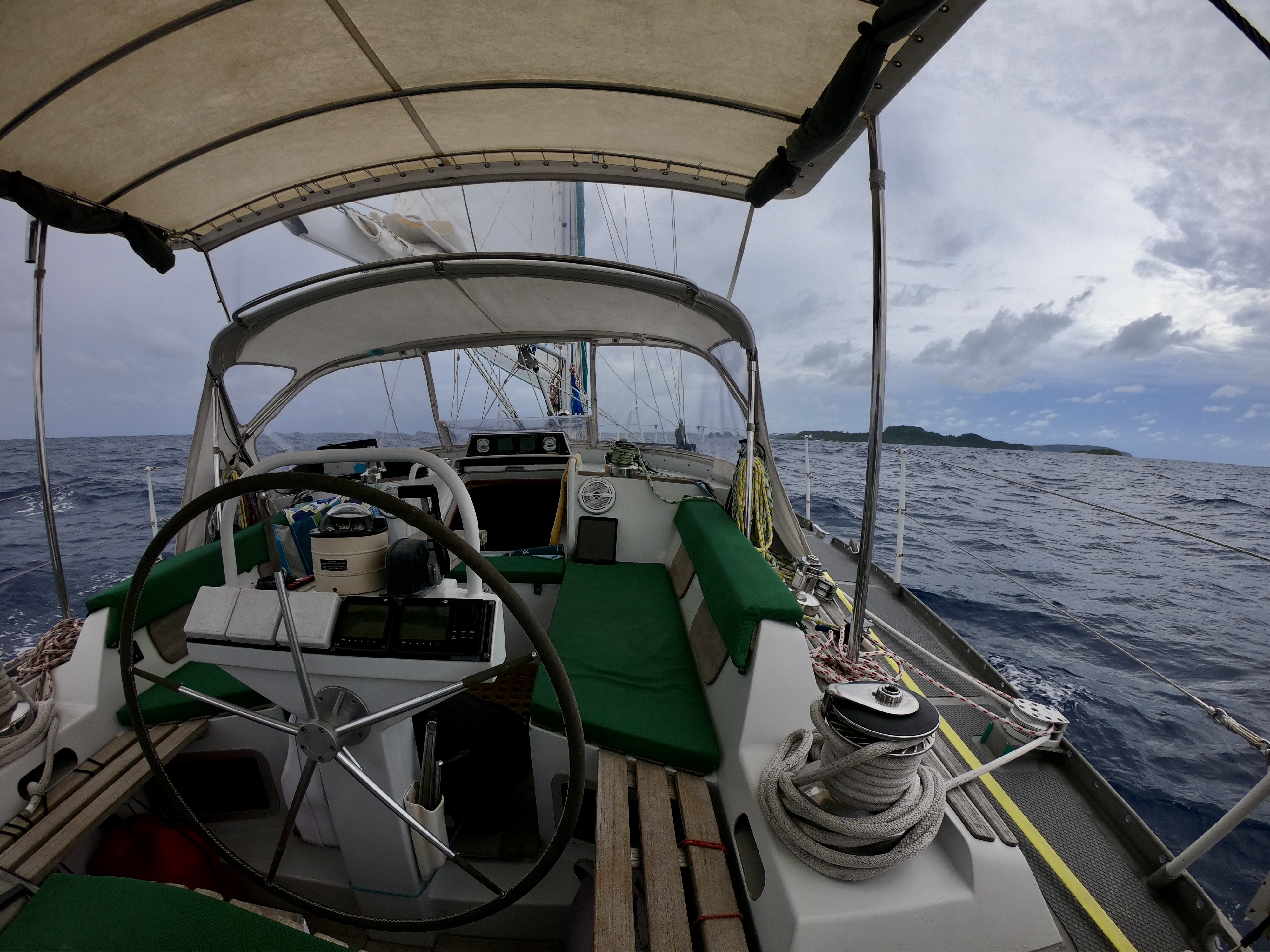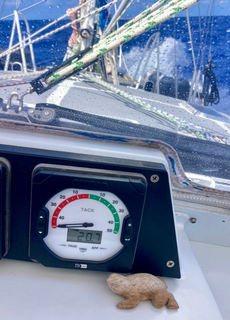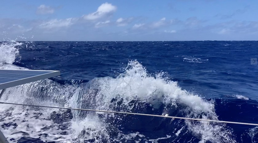 When we finally got our easterly winds, eighteen hours after departing Tahuata, they punched us with twenty four knot gusts. For a time, we saw more waves and spray make their way onto our dodger than ever before.