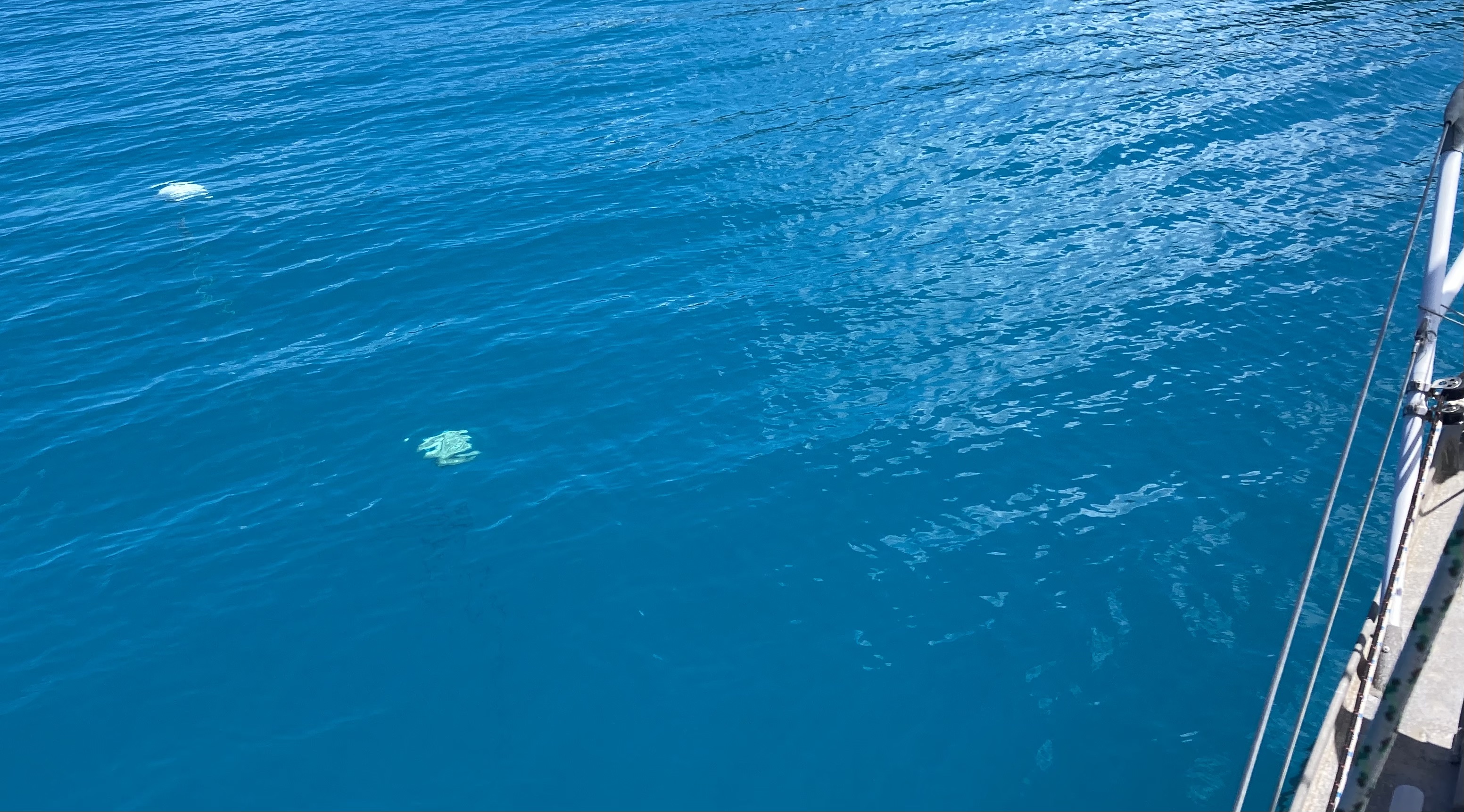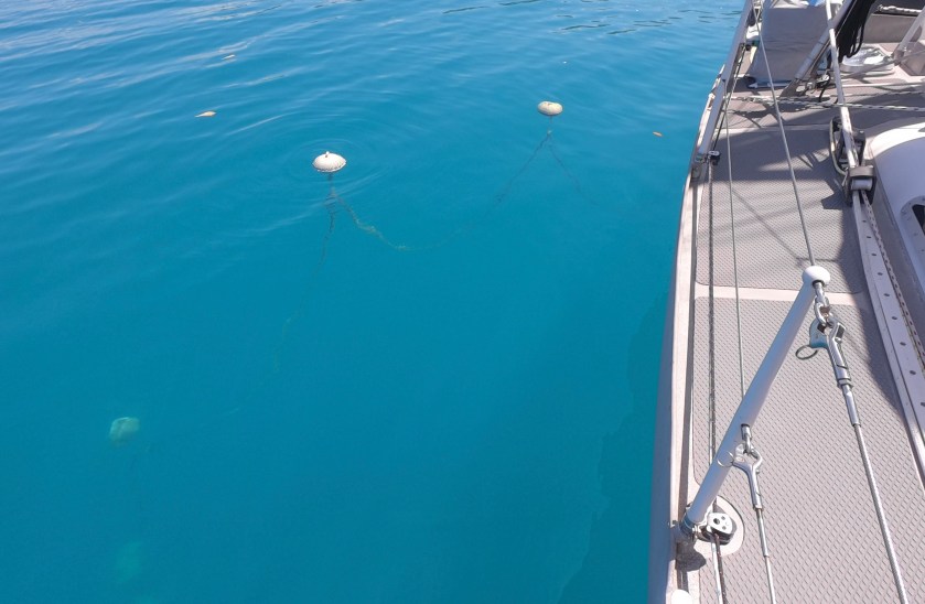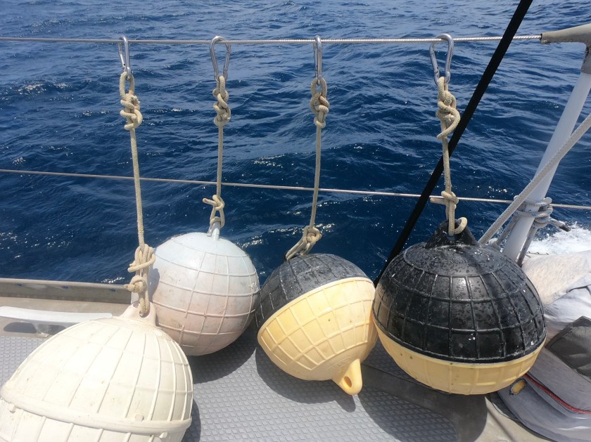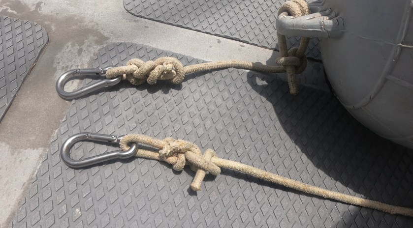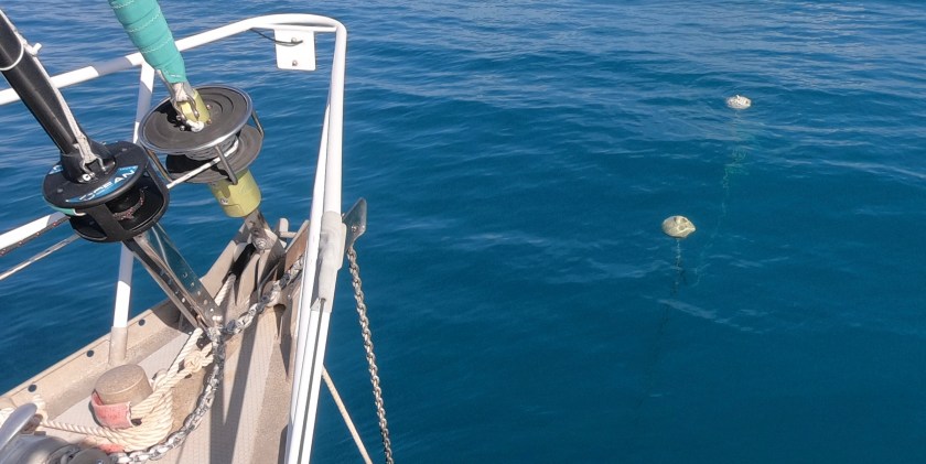 When the winds completely died, there were a few things we needed to be cognizant of. Without a breeze or currents pulling the boat at all, the floats may end up sitting on the surface, or just below. It some instances this can result in the floats actually banging against the side of the hull…minor, but an annoyance to say the least, especially at three o’clock in the morning. More serious can be the risk of floats being struck by passing boats. If the floats are actually on the surface, they can usually be seen; but submerged barely below, they can be almost impossible to notice before its too late, especially if the water is a bit choppy or a boat is passing close by and moving fast.
