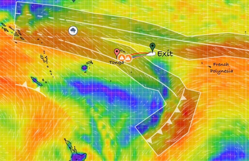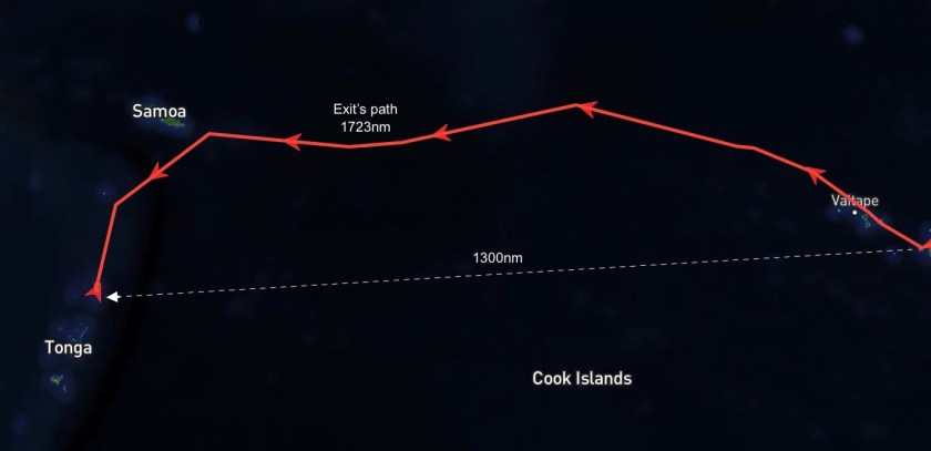 Having successfully cleared out of Tonga, Exit departed Vava’u late in the afternoon on November 6. Perfect timing considering we were one day ahead of the U.S. which made it Election Day there. A good day to not be online.