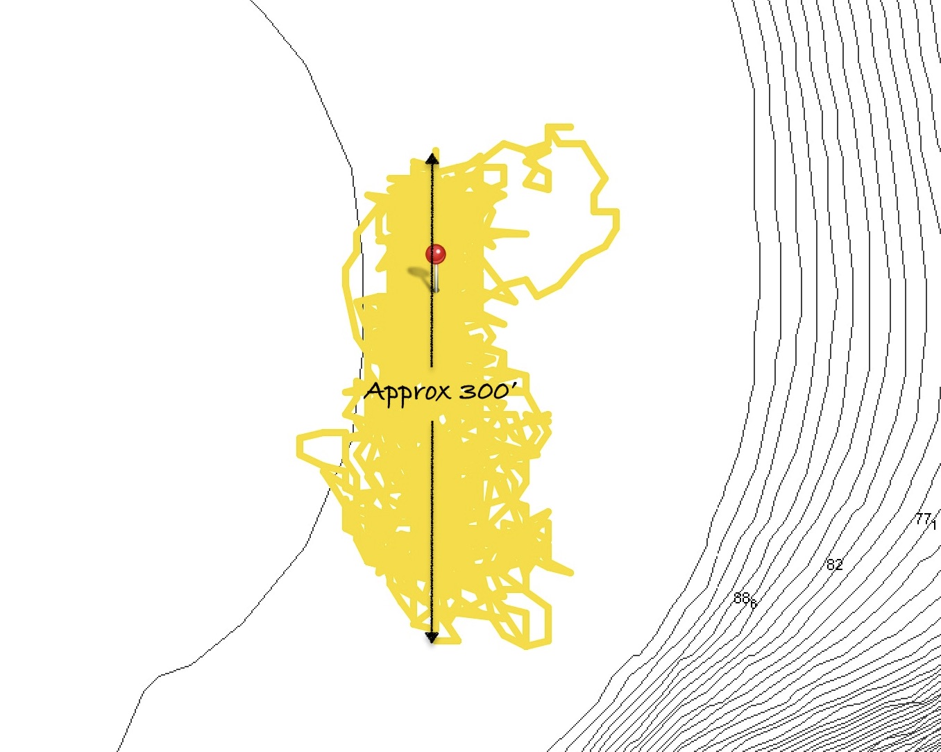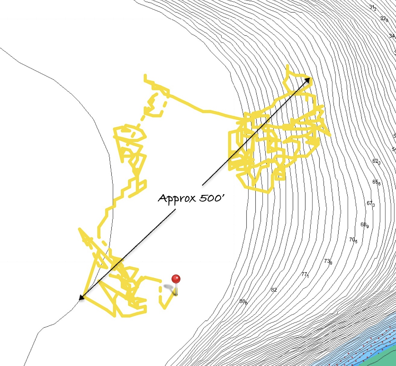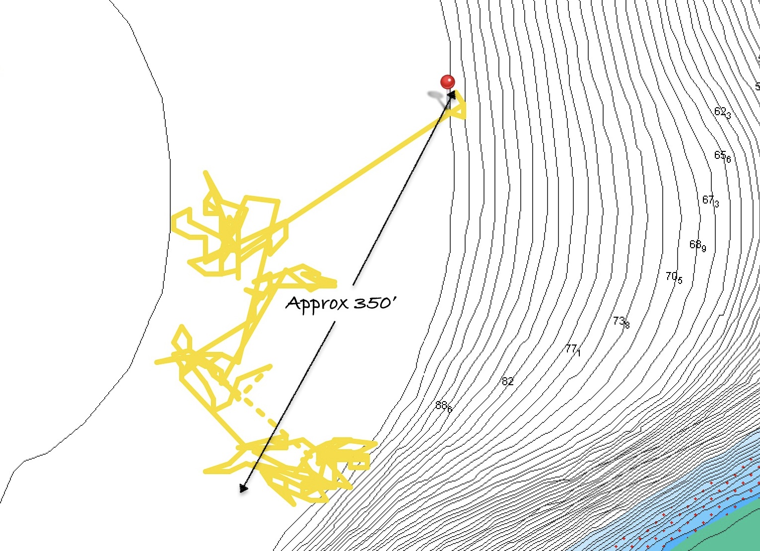 To float the chain, as with any anchor spot, our strategy is to first to try to locate a bit of sand with good holding to set the anchor. In a perfect world, it would be completely clear of obstructions 360° around the spot the anchor was being dropped for a diameter twice the depth of the water. For example, if we were anchoring in twenty five feet of water, we want a clean sandy patch a minimum of fifty feet across. This would give us at least 2:1 scope of clear space as a starting point.