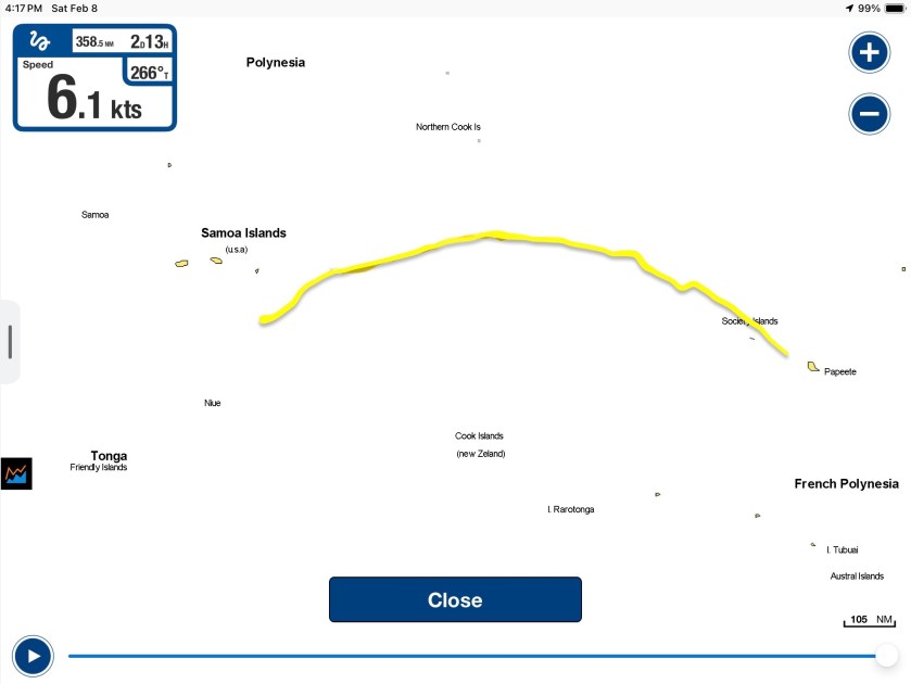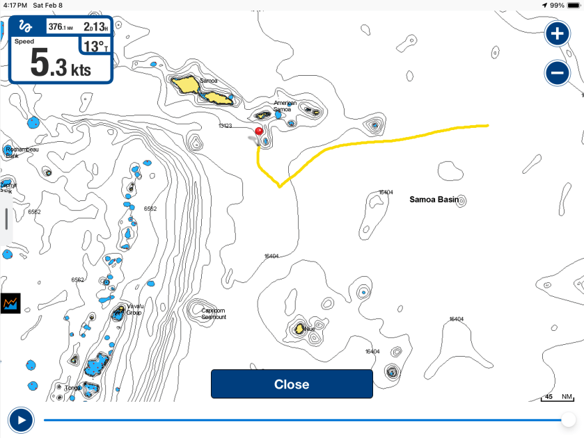 Only twenty nautical miles north of Tonga we passed within five miles of the location a 2000 foot deep undersea volcano which had erupted in 2019. A bit scary to think about what would happen if history repeated itself here, but still not nearly as scary as the history that was about to repeat itself in the States.