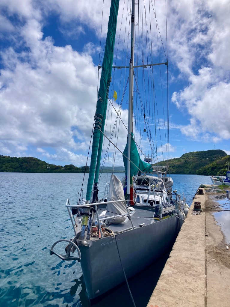 In order to clear out, it had been necessary to bring Exit to the main dock in Vava’u. Our approach to the intimidating cement dock (with its submerged wreck at one end, rusty rebar sticking out, and nasty overhang that tried to suck our toe rail underneath it when we cleared in) was made even more ominous by fifteen knot winds that pushed right at the dock. Moreover, the dock was already stuffed full of sailboats, already rafted two-deep in a couple of spots.