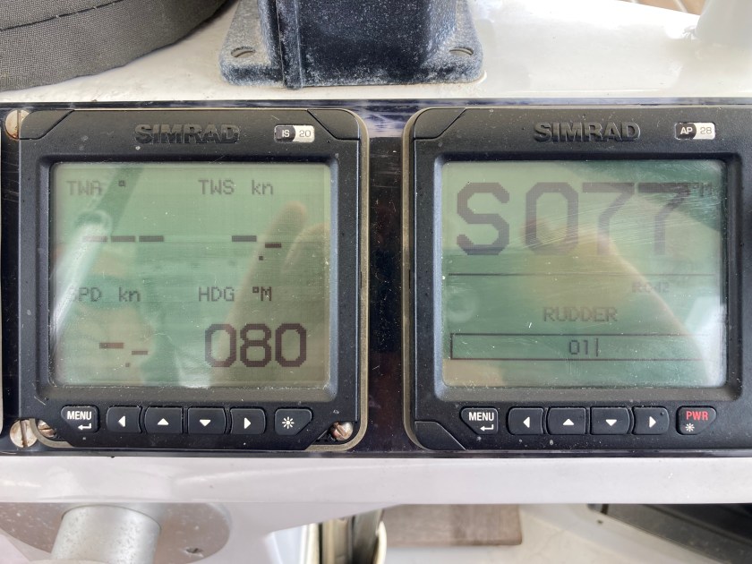 Just after sunrise on our second day, we experienced what appeared to be a union strike. Jeeves, the autopilot, and the wind indicator at the top of the mast (yes, the one we had just got working again) both decided to walk off the job. It was just going to be one of those passages.