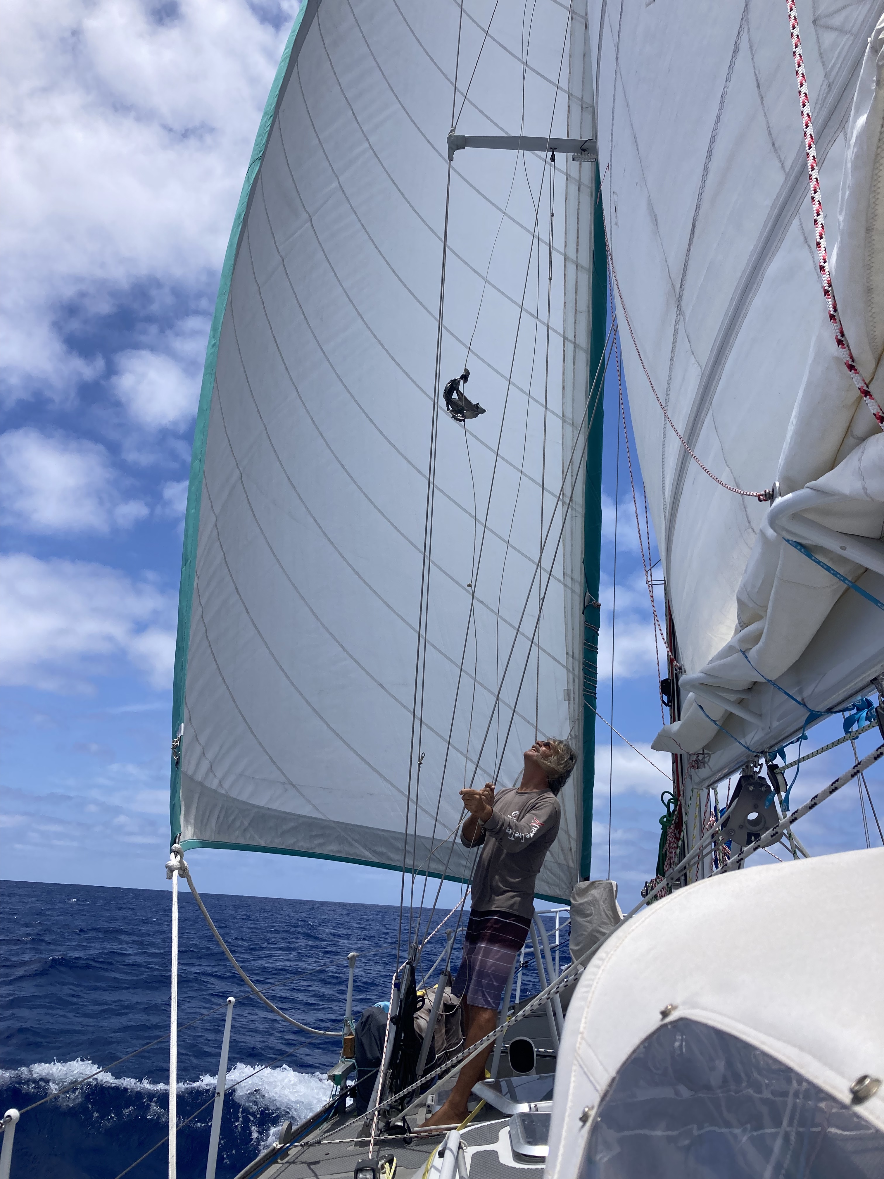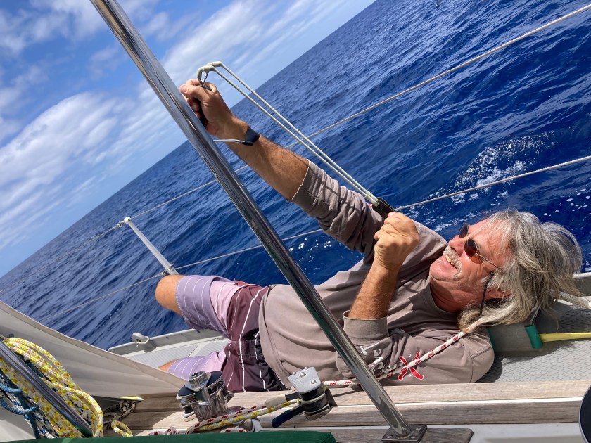 The nights were now pitch black. Almost no moon, and clouds that would obscure one if it existed anyway. We kept receiving daily reports of a derelict sailboat that had been spotted adrift three weeks ago within a hundred fifty miles west of our current location. Remnants of a dis-masted and abandoned boat from over a year before. We’d never see it at night even if it was next to us. Fortunately, we knew a drifting boat wasn’t going to get any farther east in the short term to potentially be a threat with these currents…as long as we could stop going west, it wouldn’t be a concern.