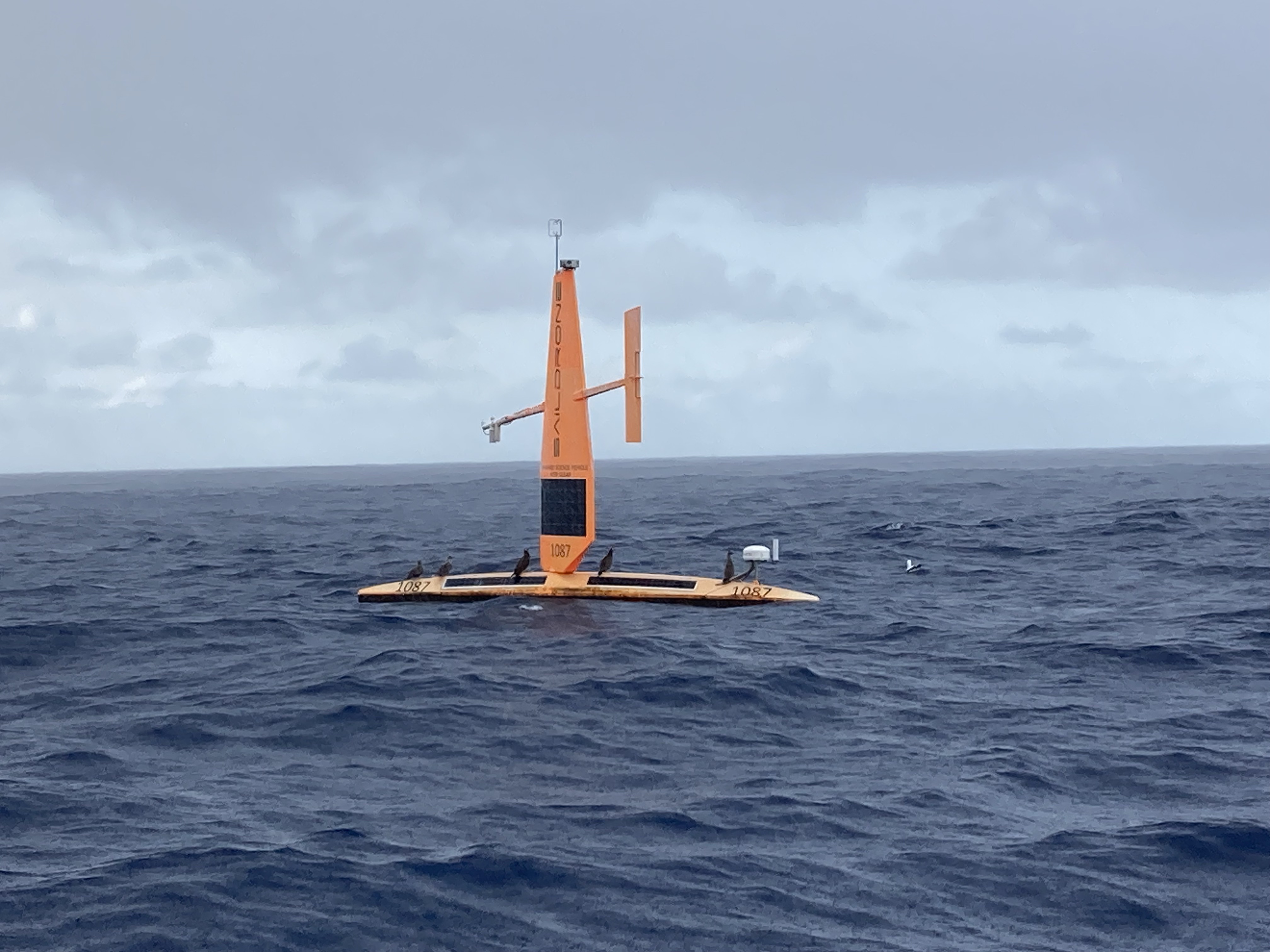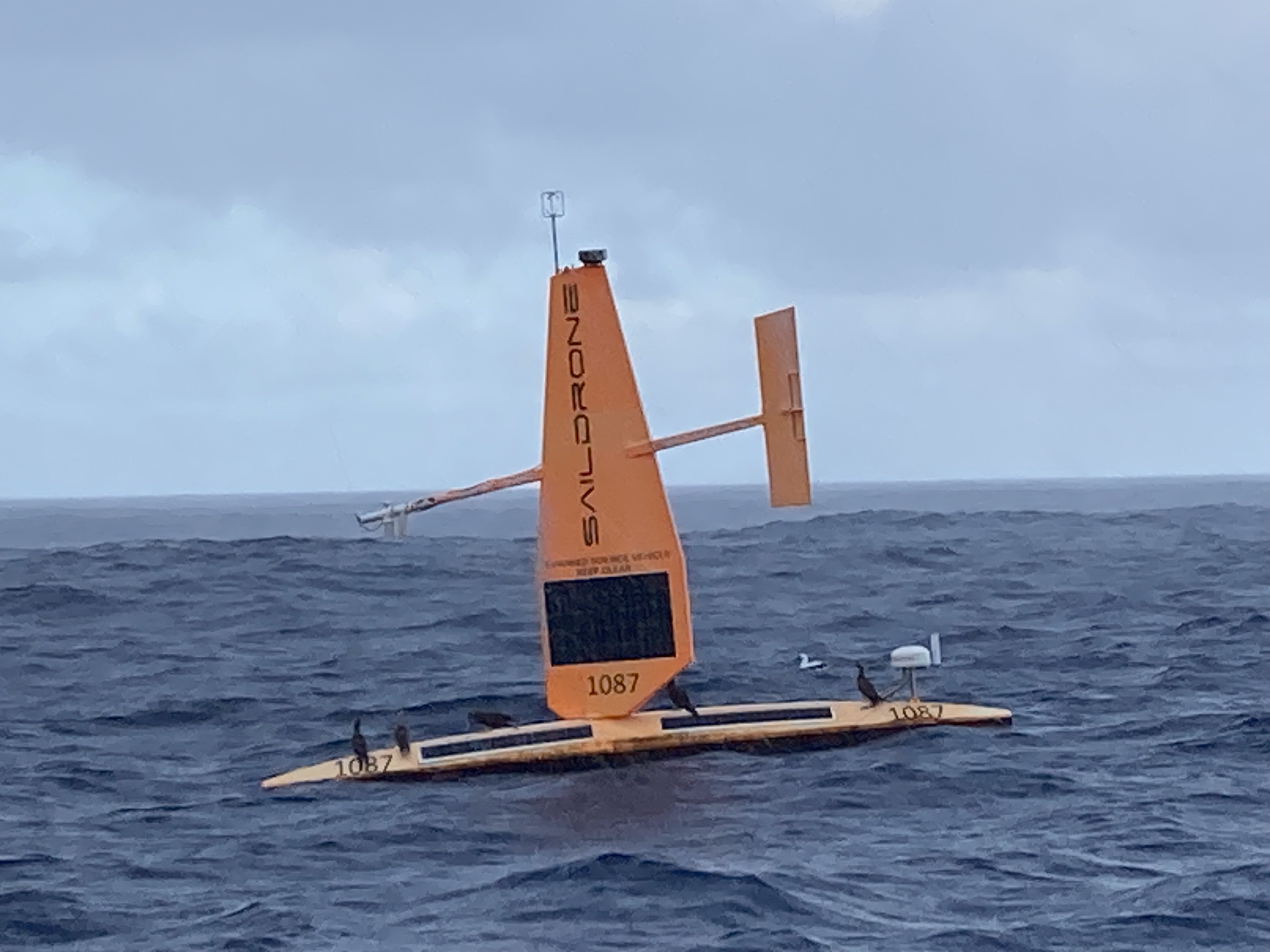 On our twelfth day underway, when a red speck appeared on the horizon, we grabbed the binoculars. It became apparent that it wasn’t a boat, but it seemed to have a sail deployed. We adjusted our own sails and came about, immediately setting a new course to investigate. As we neared, we were a bit stunned to make out what appeared to be a kayak or a SUP with a sail…? A thousand miles seemed more than a bit far out for someone to drift…? Maybe a crazy solo circumnavigating paddler…? WTF? Continuing our approach, we could slowly make out more and more details. It was a SUP-like platform that didn’t appear to have any type of hull or structure below the water; the bright red sail seemed to be attached to some kind of substantial wind vane autopilot. We tracked alongside it and had to laugh when we found a cadre of sea birds had laid claim and taken possession of what was identified on the sail as “Saildrone”.