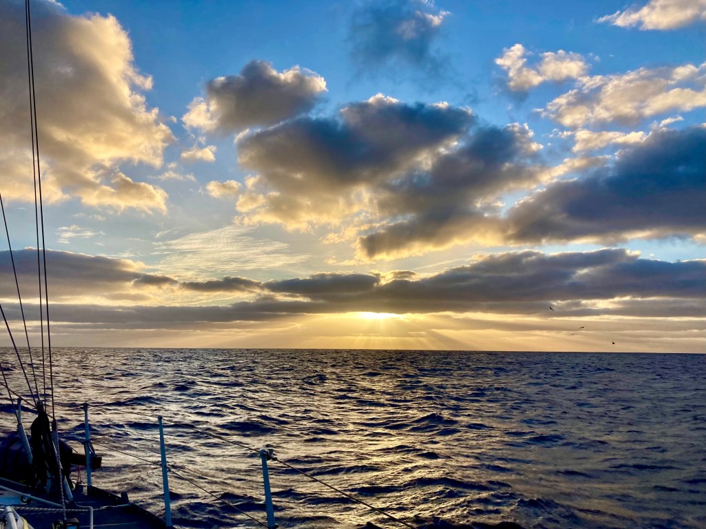 Largely, the days and nights were rather uneventful. But we found ourselves on a roller coaster of emotions. Periods of elation followed by frustration the following hour. Pondering and absorbing the magic of our current adventure only to have thoughts of weather forecasts or course adjustment options creep in, casting a shadow across an otherwise bright moment of introspection. Caught up in the indescribable and glorious colors of another sunset in the middle of an ocean, which itself had just hours before revealed an unfathomable shade of blue reflected from an over ten thousand foot depth. Serenity and colors which could never be adequately captured by even the most imaginative artist…