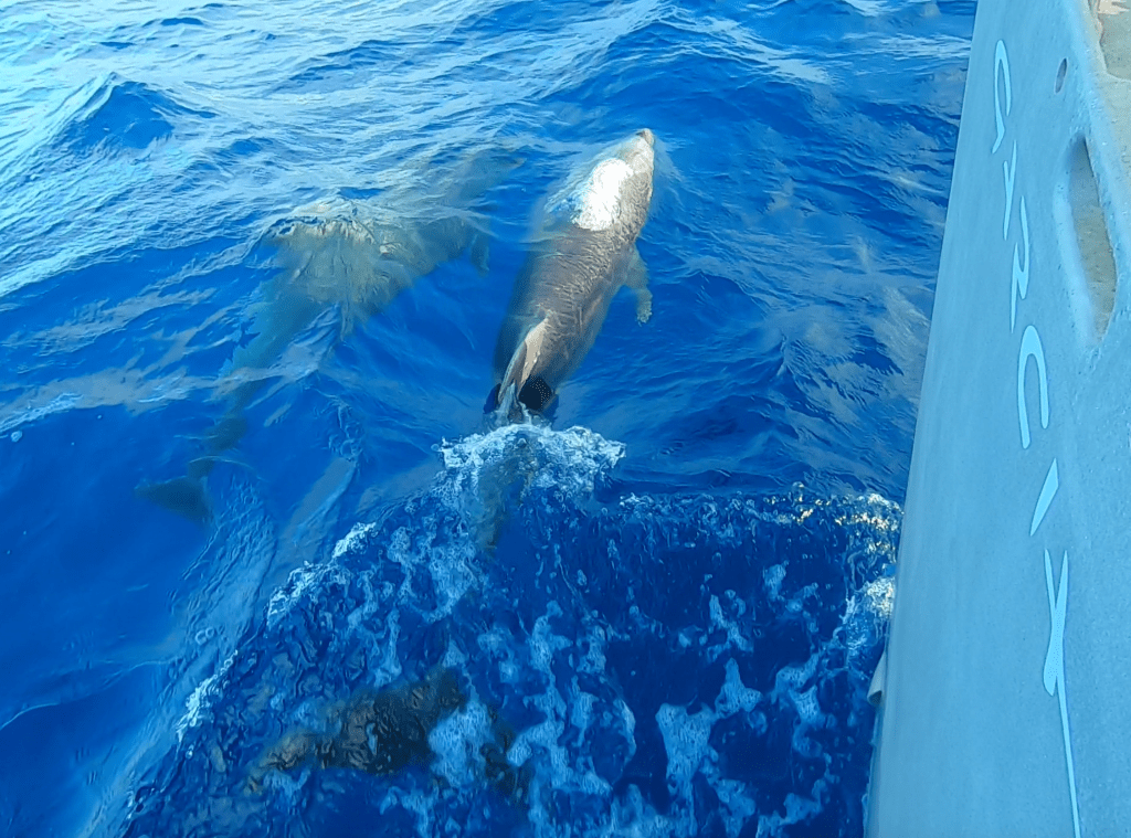 On day seventeen we were visited by the first pod of dolphins we had seen since departing Mexico. Our friends stuck around for quite a while doing gymnastic leaps out of the water, surfing down wave faces, and jockeying each other for position bow-riding Exit.