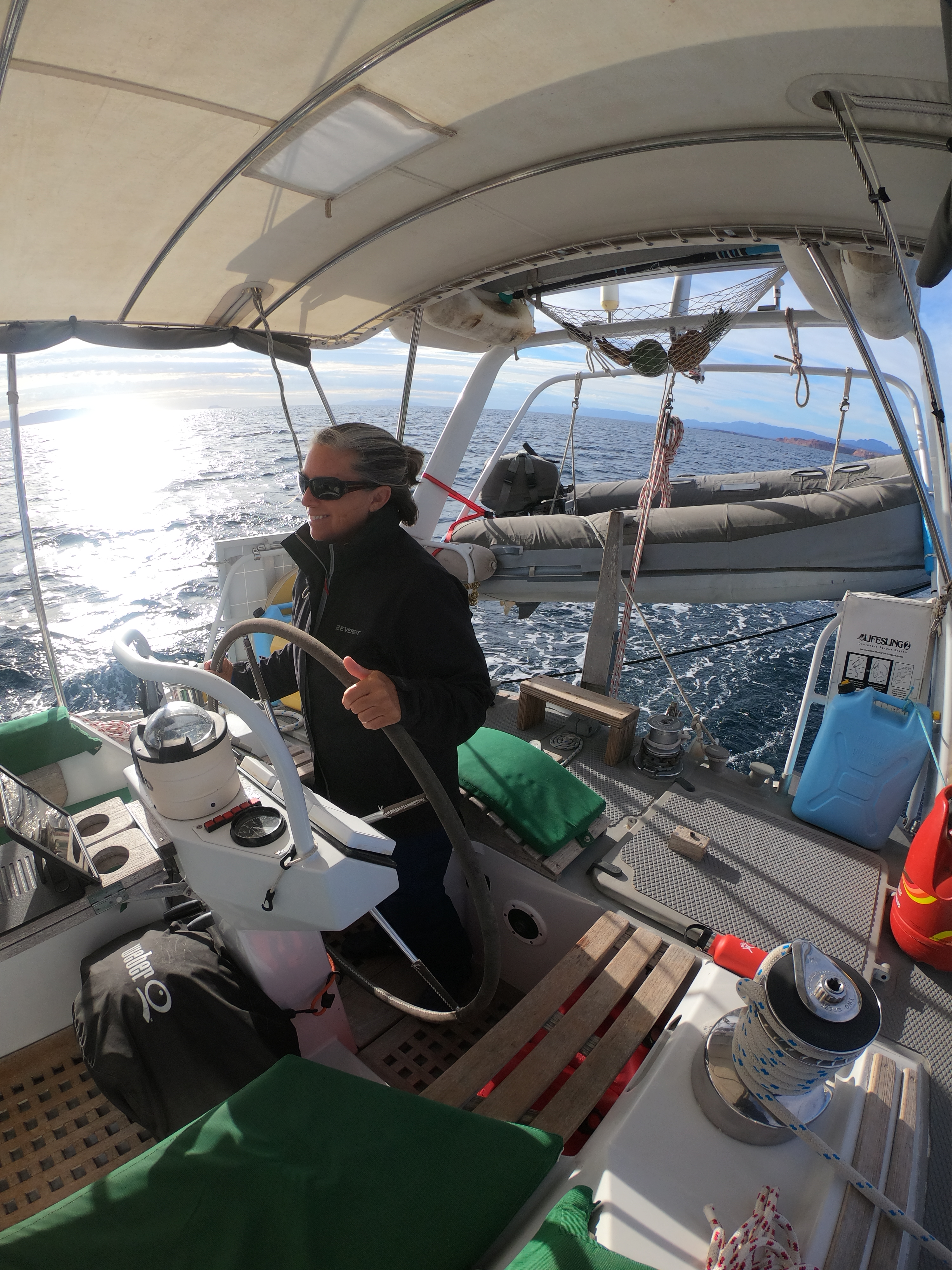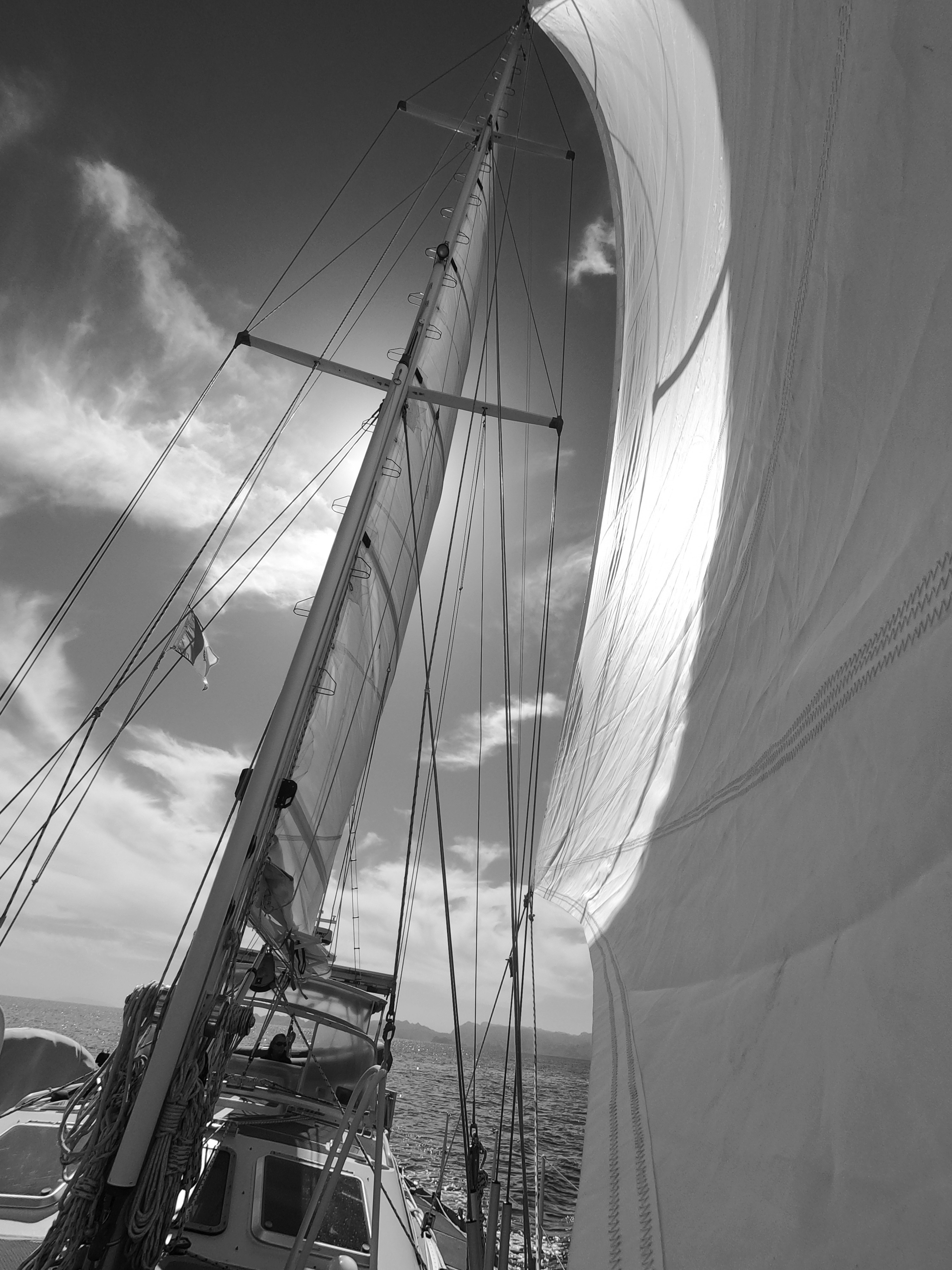 Before too long a slight breeze had appeared; and suddenly, for the third day in a row, we were sailing. Holy shit! Neither of us could even recall that ever happening, much less when it was. If we weren’t careful, someone could mistake us for sailors.
