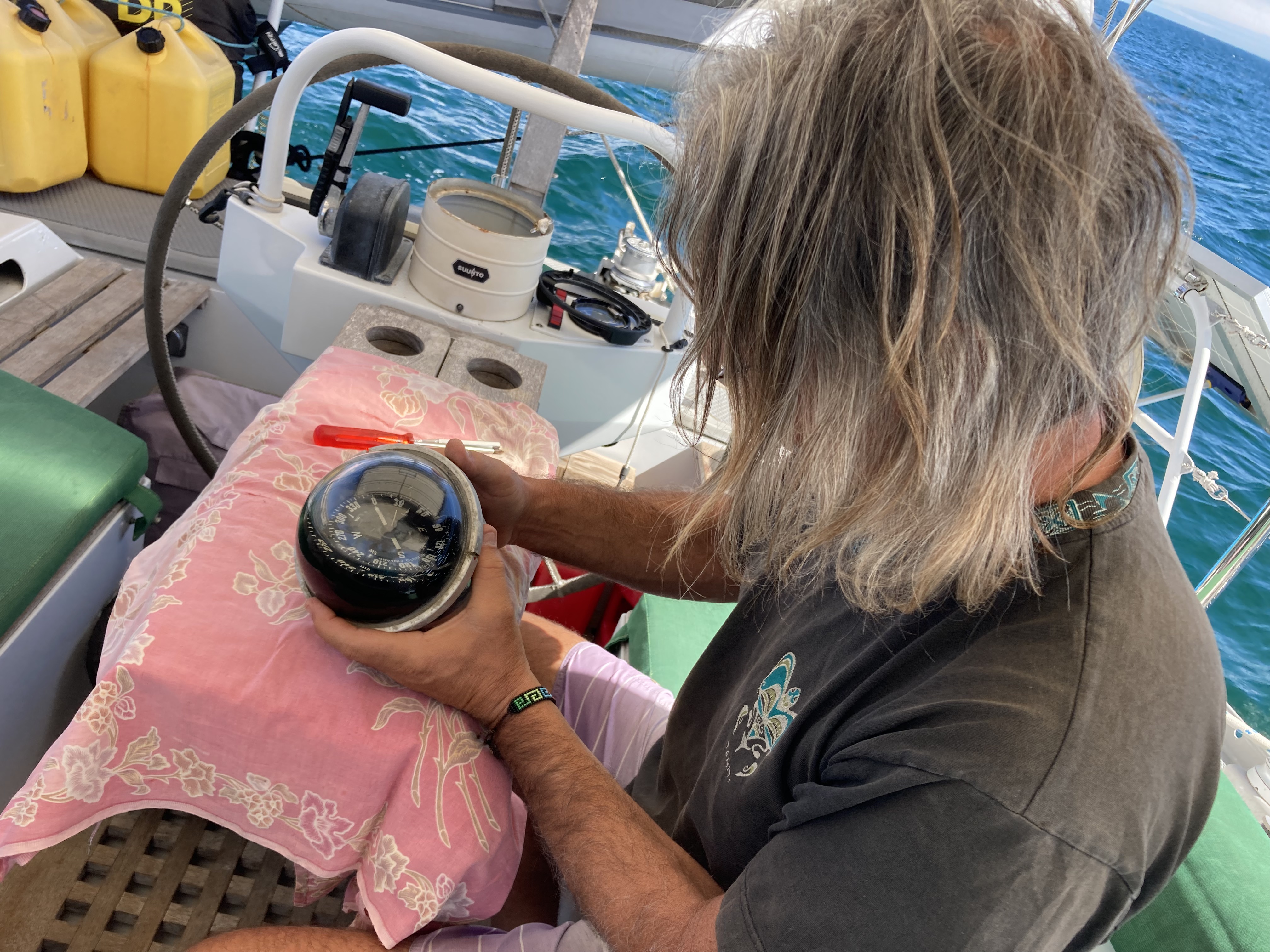 One of those moments of truth. Either I would be able to successfully refill the compass with fluid we had purchased just before transiting the Panama Canal, or it would be the final moments of life for our precious ship compass. Adding a $600 compass to our list of expenses seemed less than ideal…far less ideal than gambling on thirty dollars of compass fluid to stave off the inevitable.