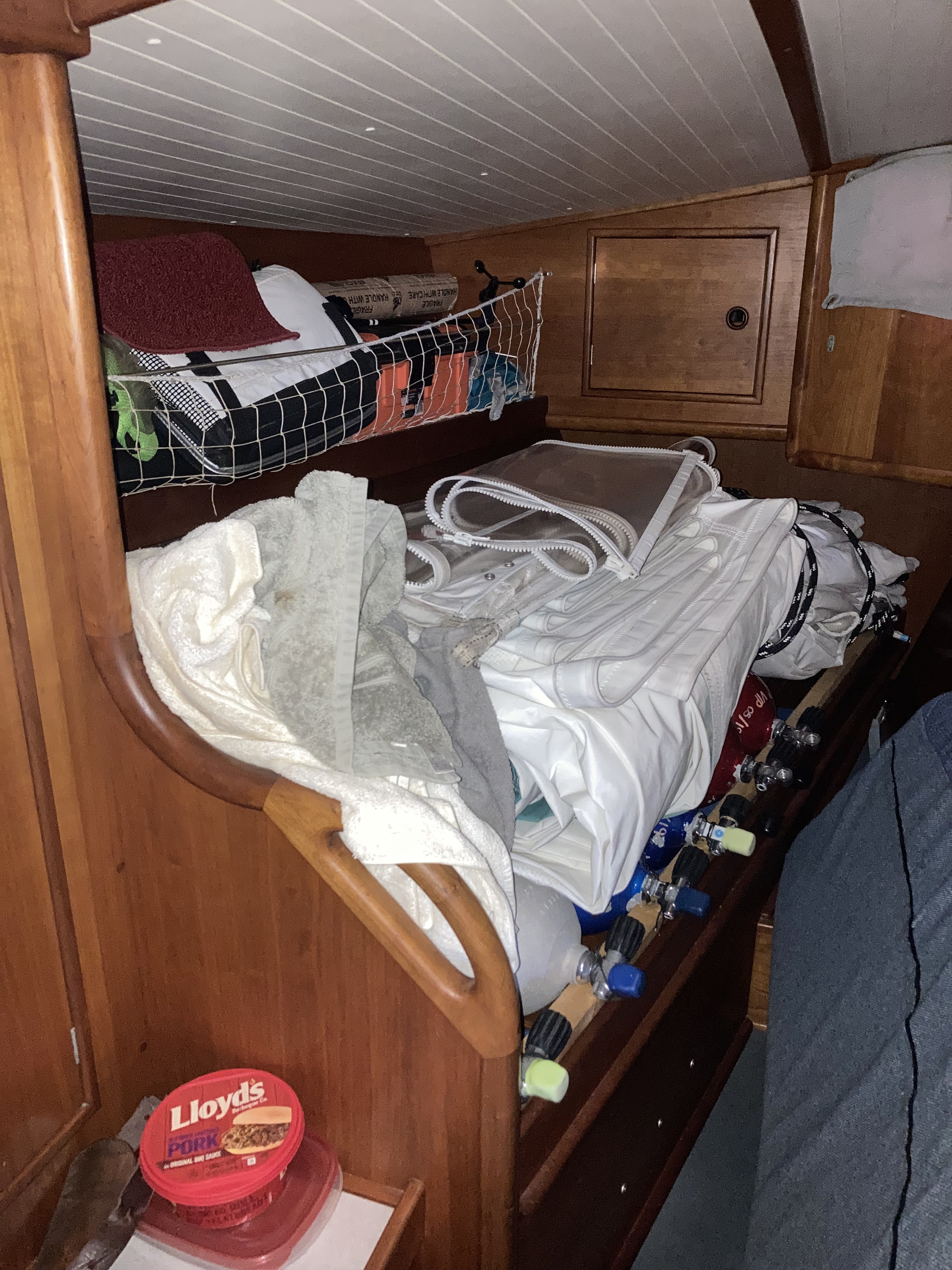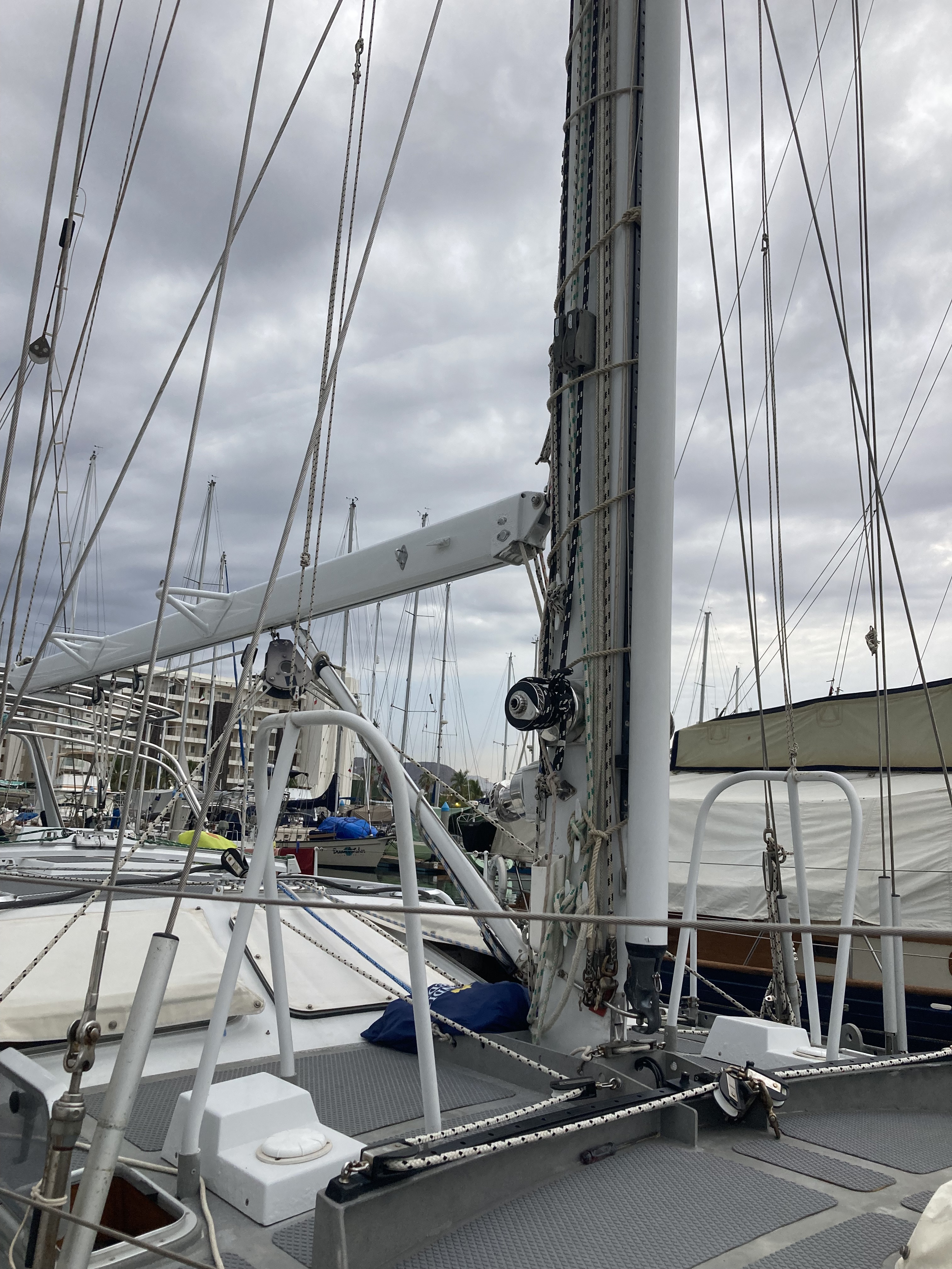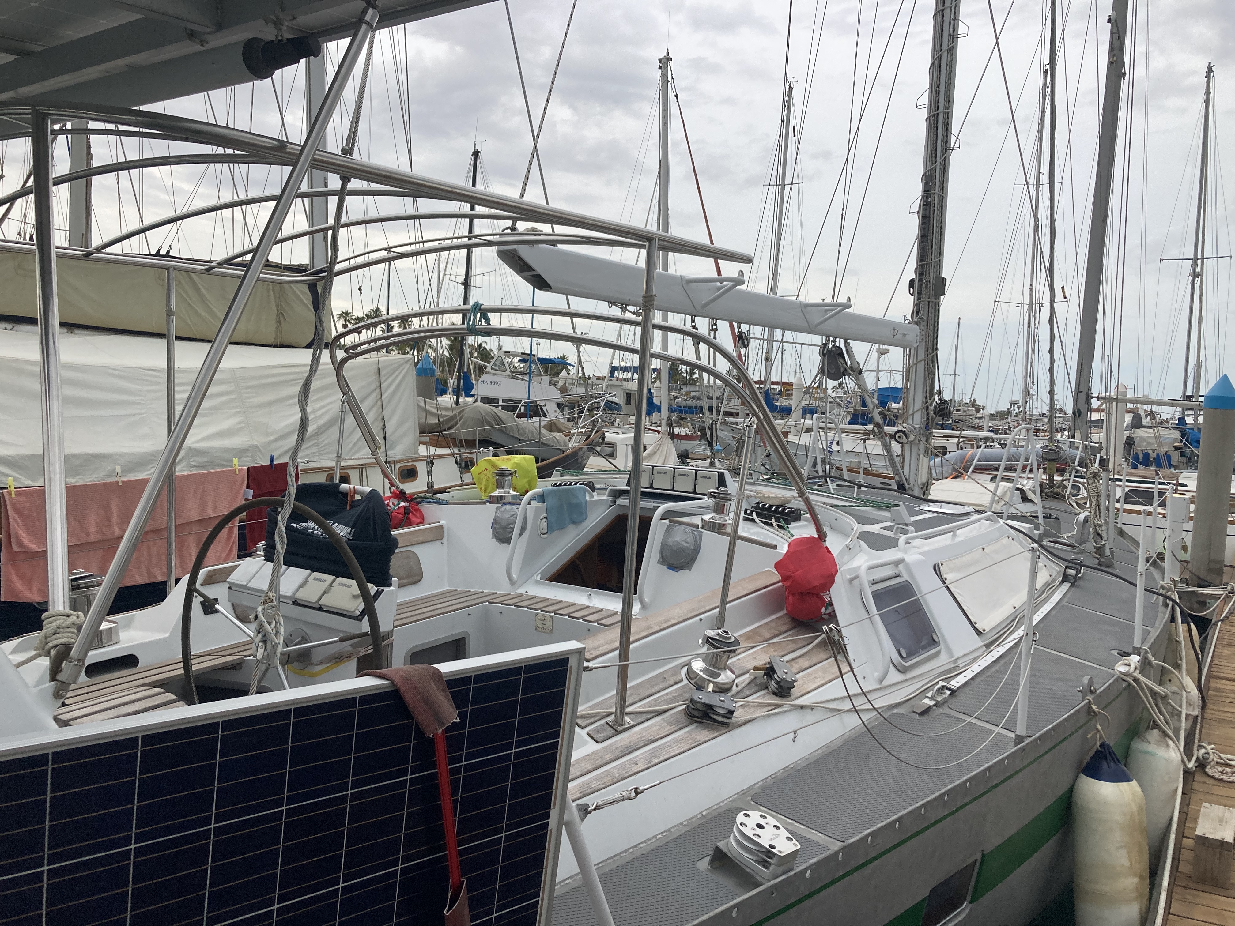For us, due diligence for potential storms meant fulfilling a long sequence of prepping Exit which included: setting up a spiderweb of lines to the dock cleats, removing all the sails and canvas, clearing the deck of anything possible and securing everything else, going up the mast to remove the electronics, pickling the watermaker for long term storage, storing the dinghy…on and on. An endless list of physical tasks, logistical arrangements, and planning considerations.