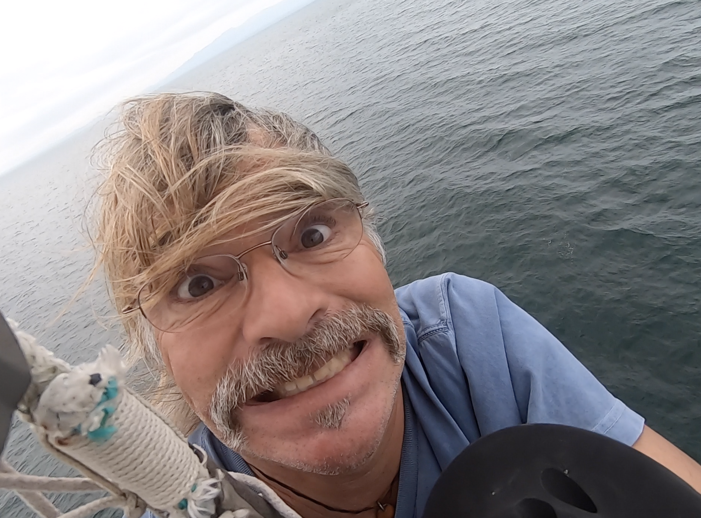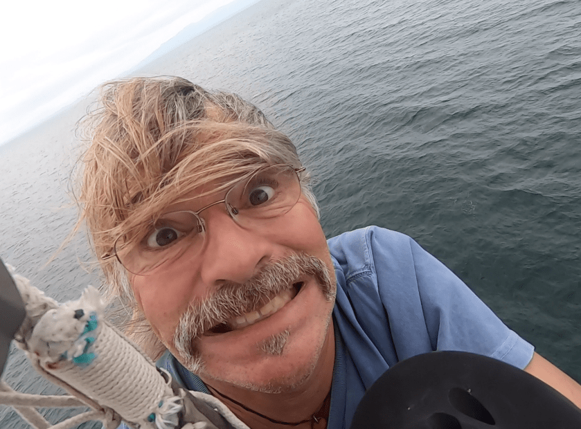 62′ up the mast at anchor in wind… with Trump hair